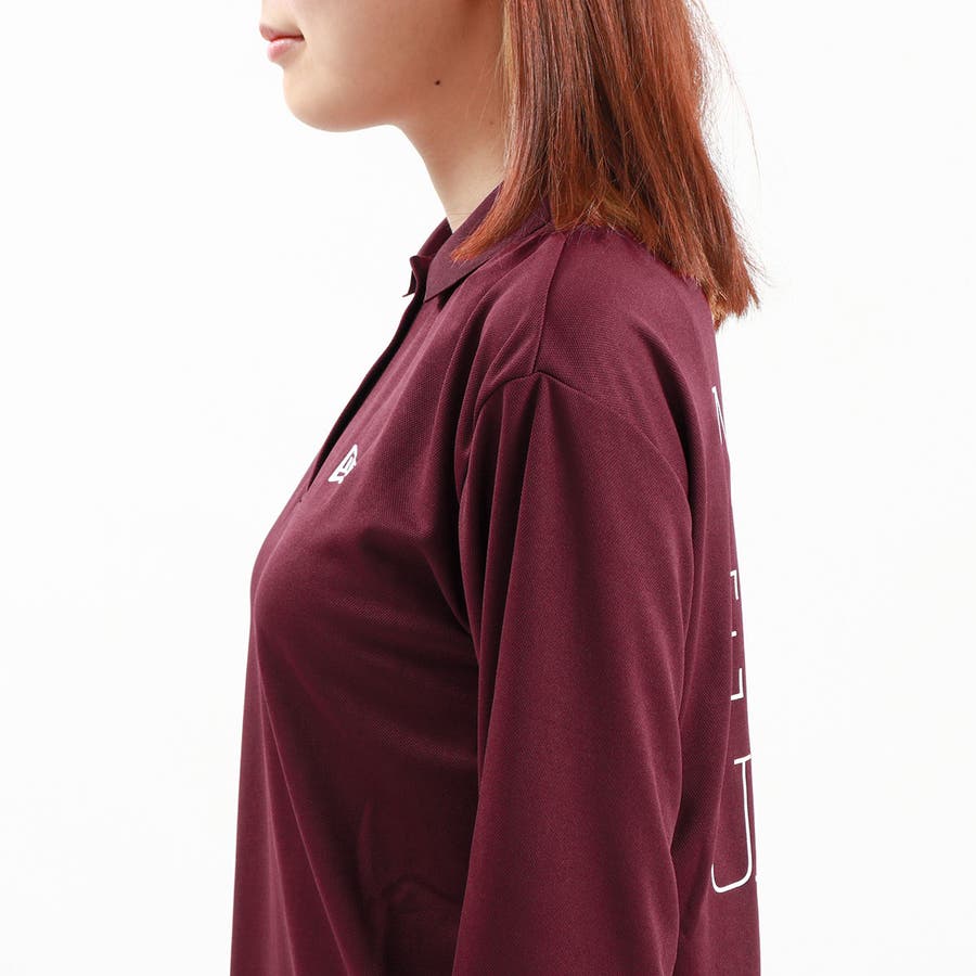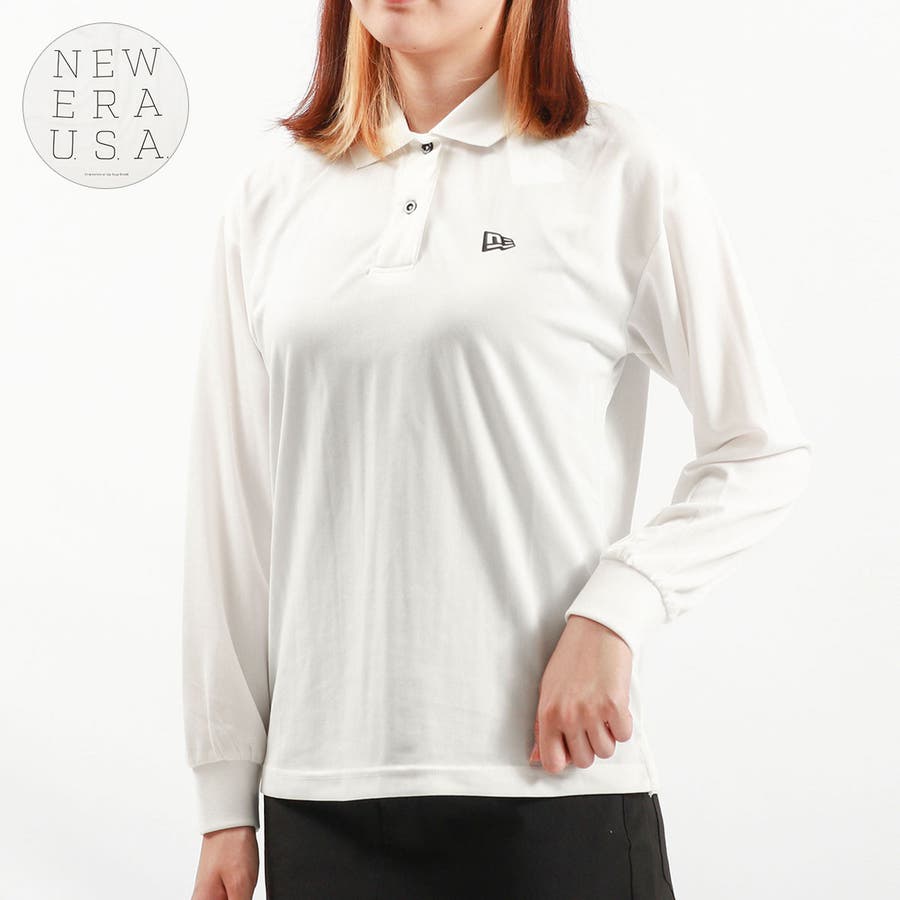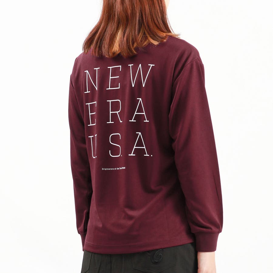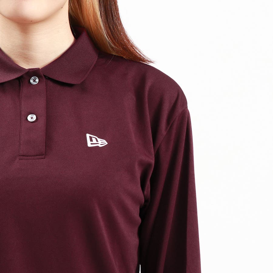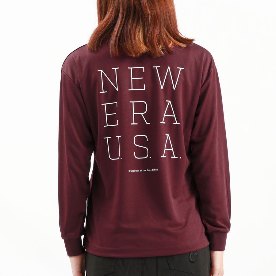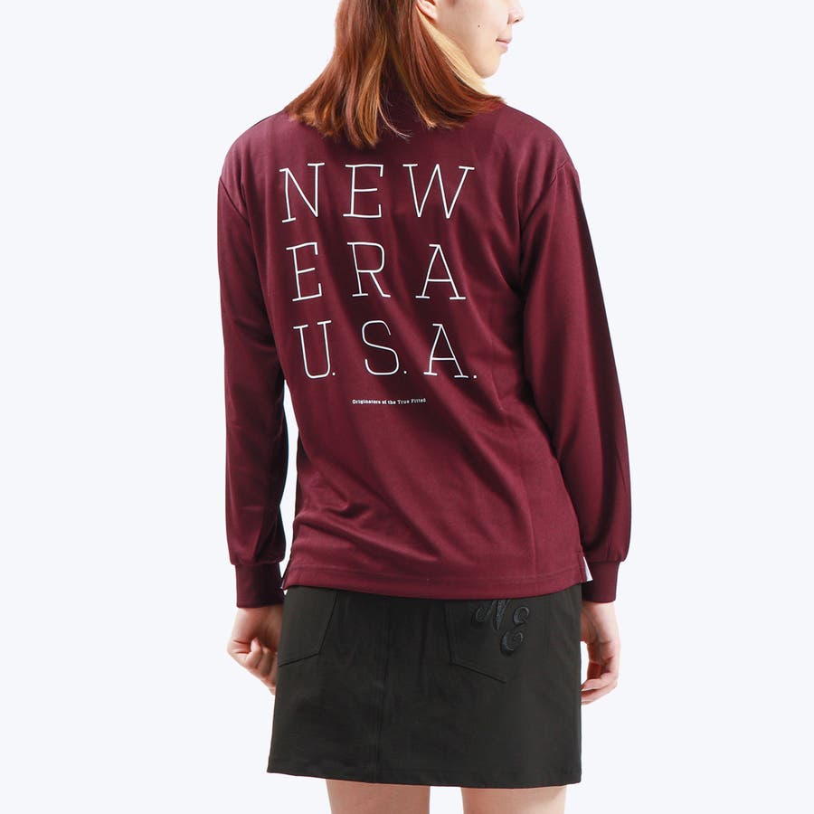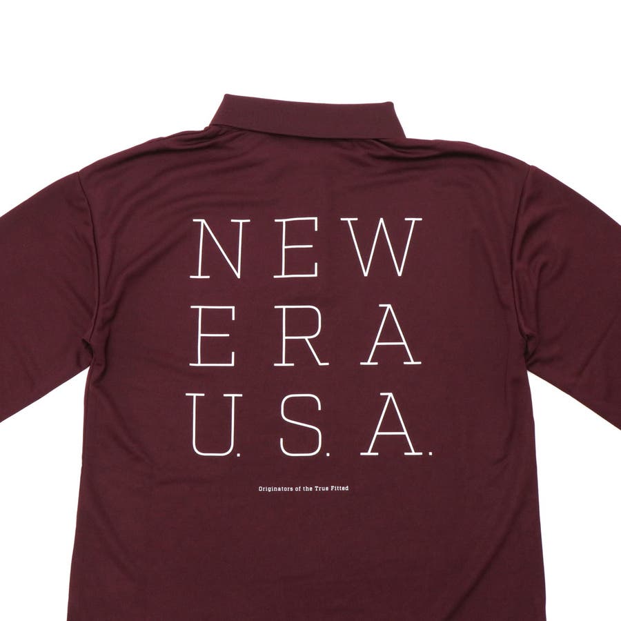 背面に大きくNEW ERA USAの文字をレイアウトした長袖ポロシャツ。素地には、吸汗速乾性、抗菌、UVカット機能を備えたNEW ERAオリジナルの機能素材COOLERA(クールエラ)を使用しています。通気性が高く肌触りの良い、鹿の子編みの生地が特徴的です。