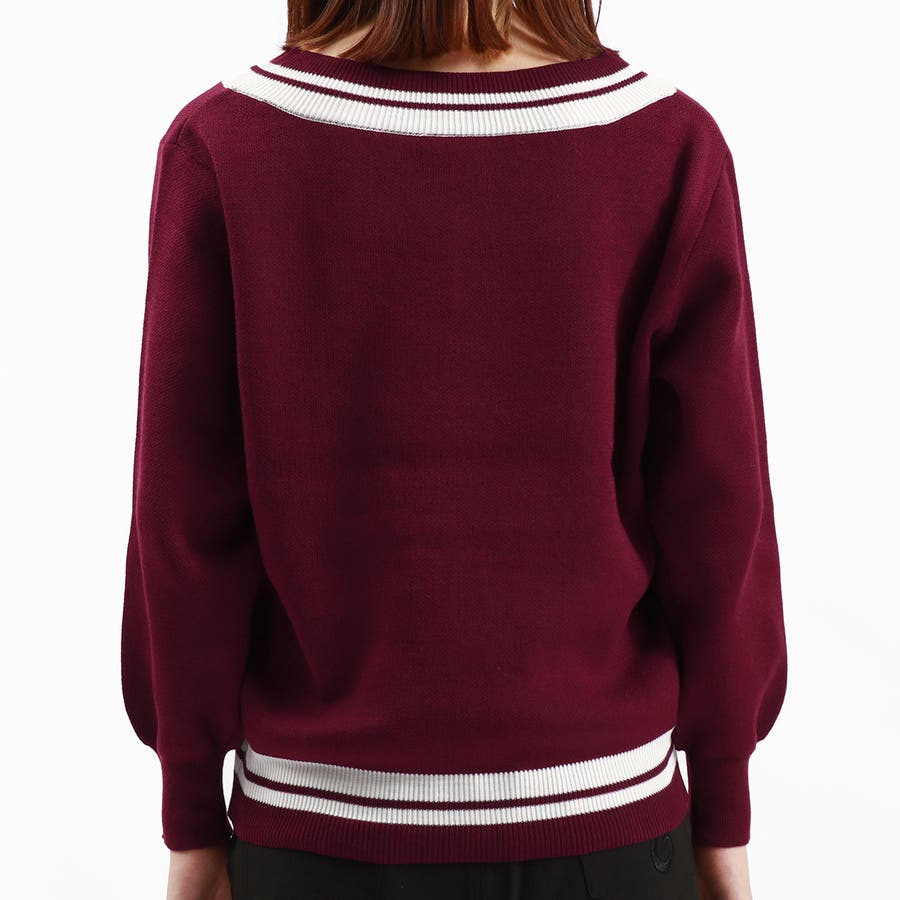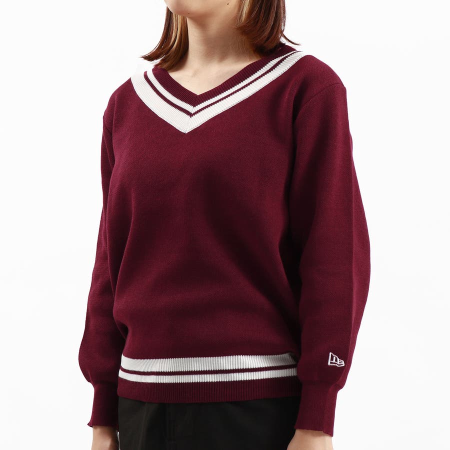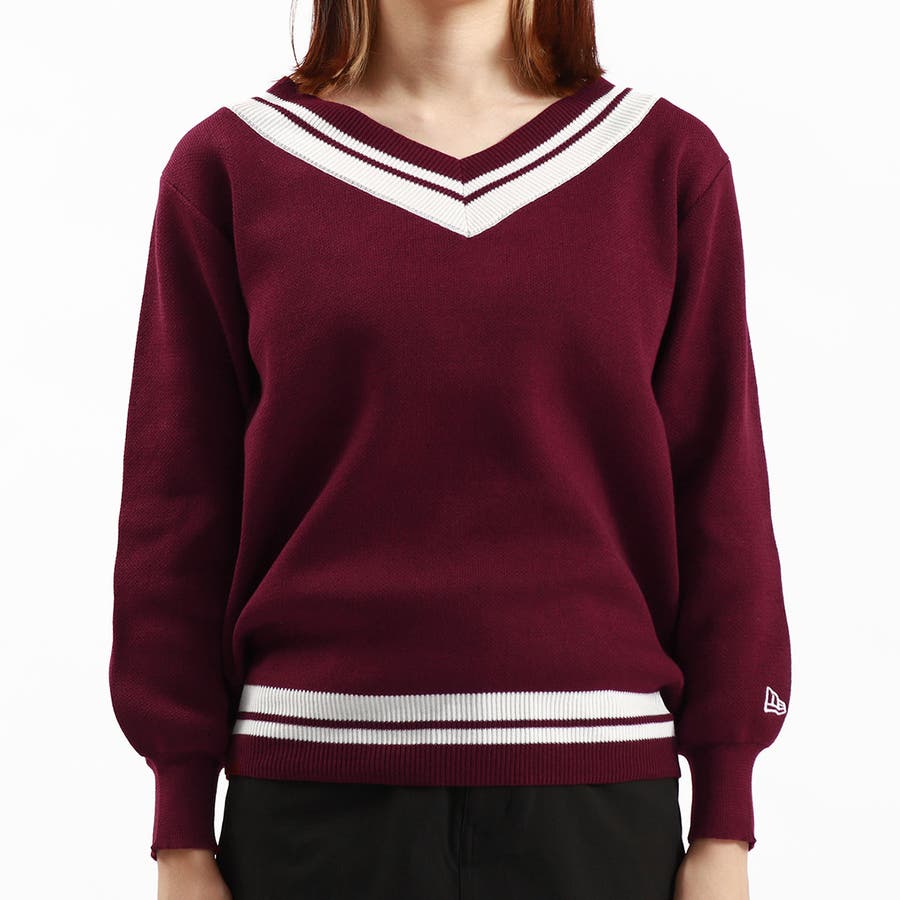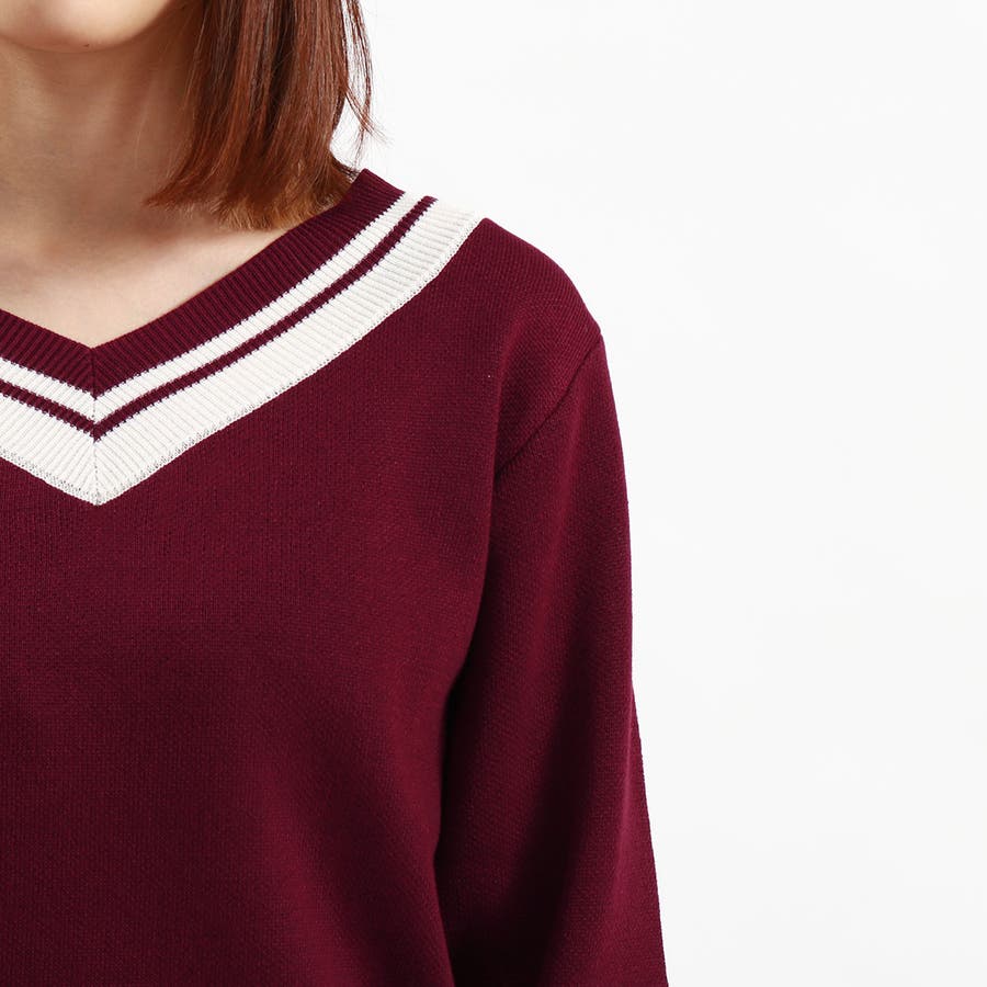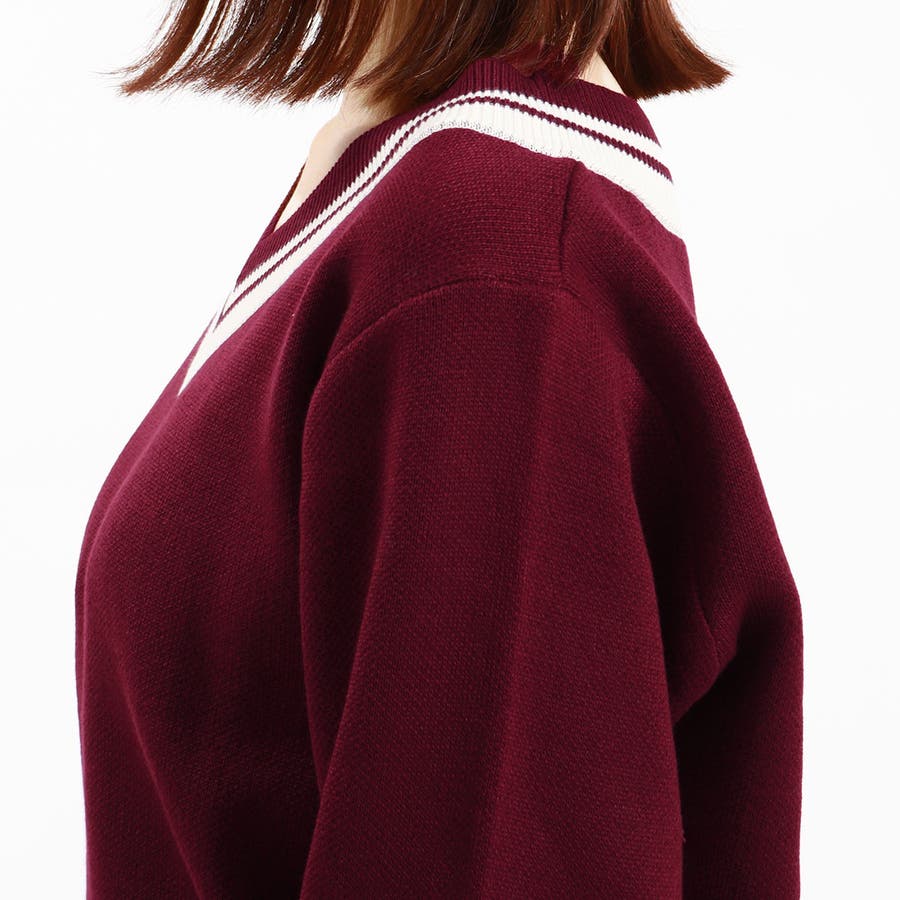 カレッジライクなデザインが目を惹くニットセーター。ポリエステル生地ならではの滑らかな光沢とボリューム感が特徴です。スッキリと着こなせるVネックデザインで、1枚での着用はもちろん、レイヤードで変化をつけても◎。コーデの幅がグッと広がる、着回しがきくアイテムです。