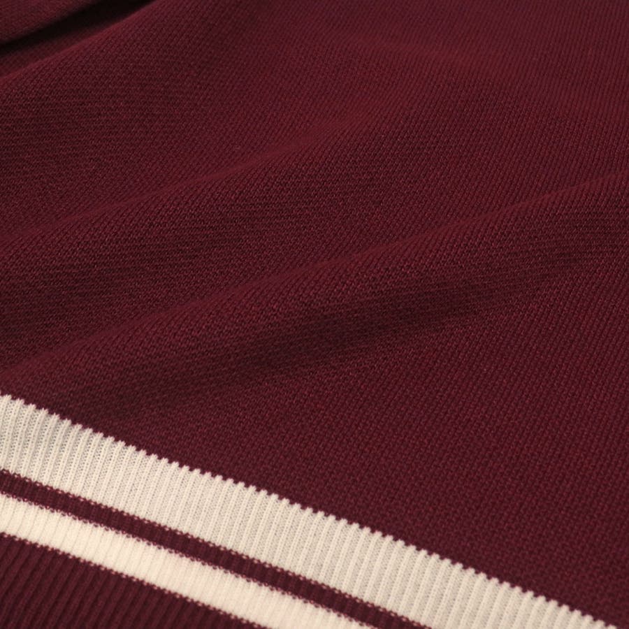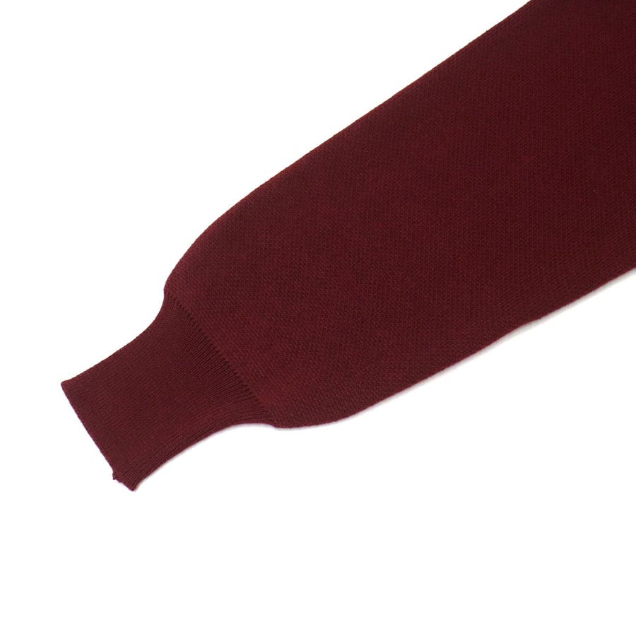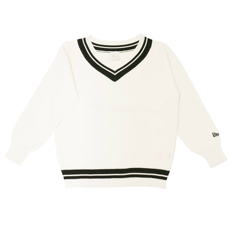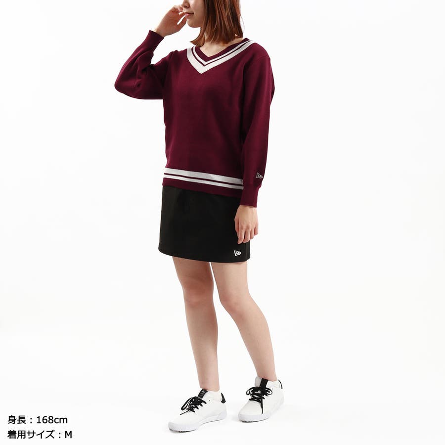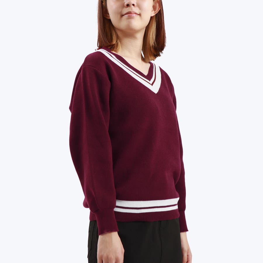 カレッジライクなデザインが目を惹くニットセーター。ポリエステル生地ならではの滑らかな光沢とボリューム感が特徴です。スッキリと着こなせるVネックデザインで、1枚での着用はもちろん、レイヤードで変化をつけても◎。コーデの幅がグッと広がる、着回しがきくアイテムです。