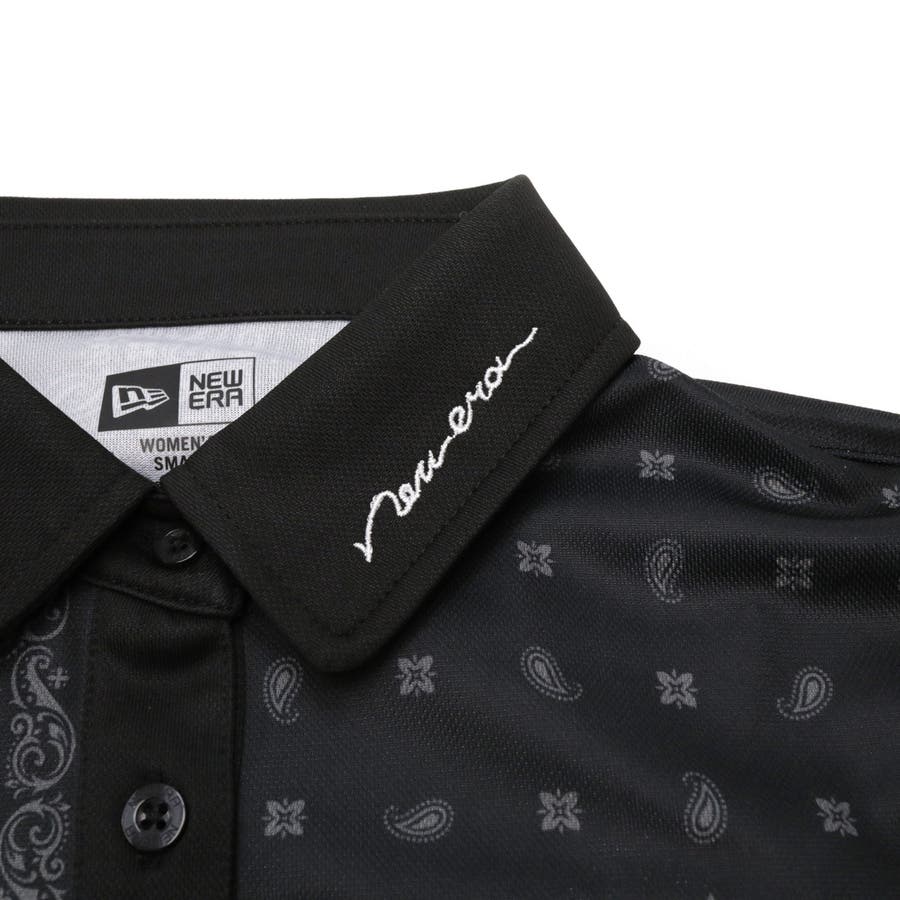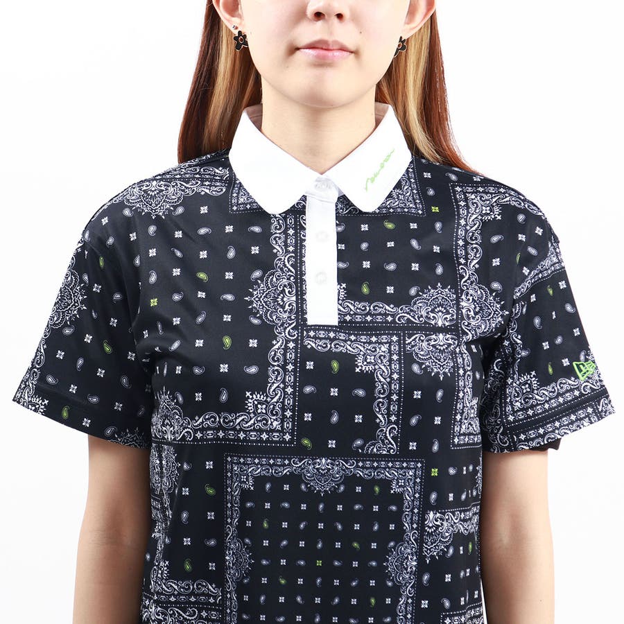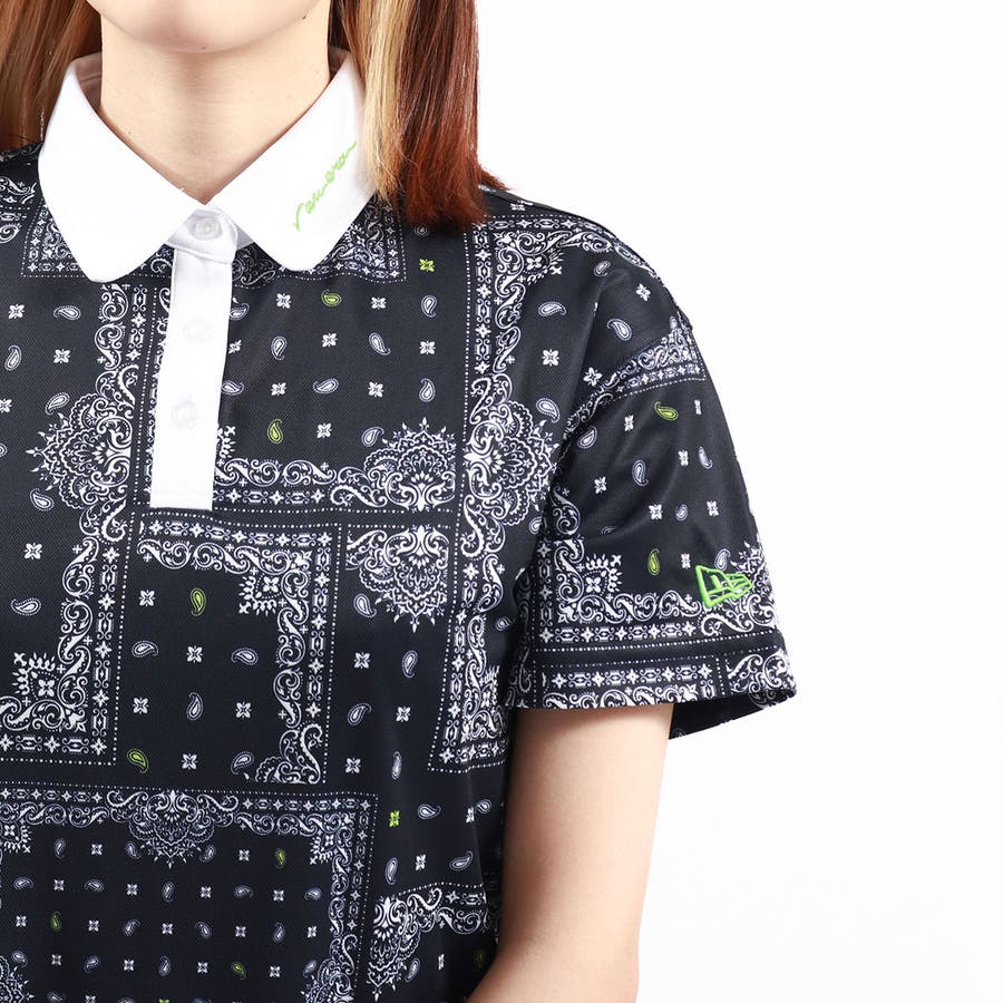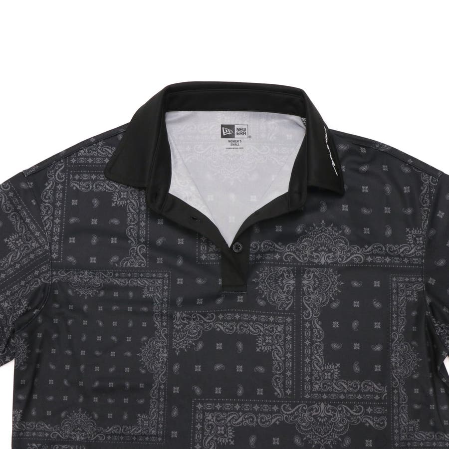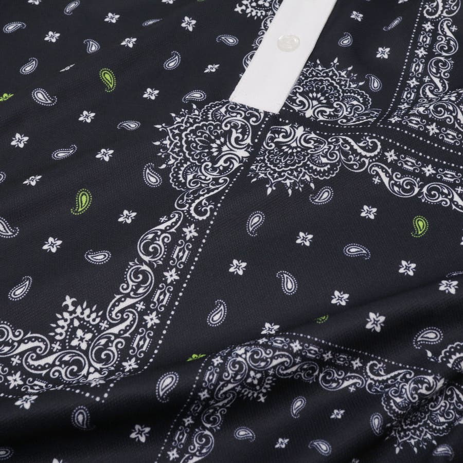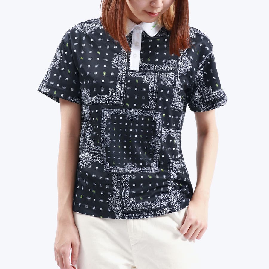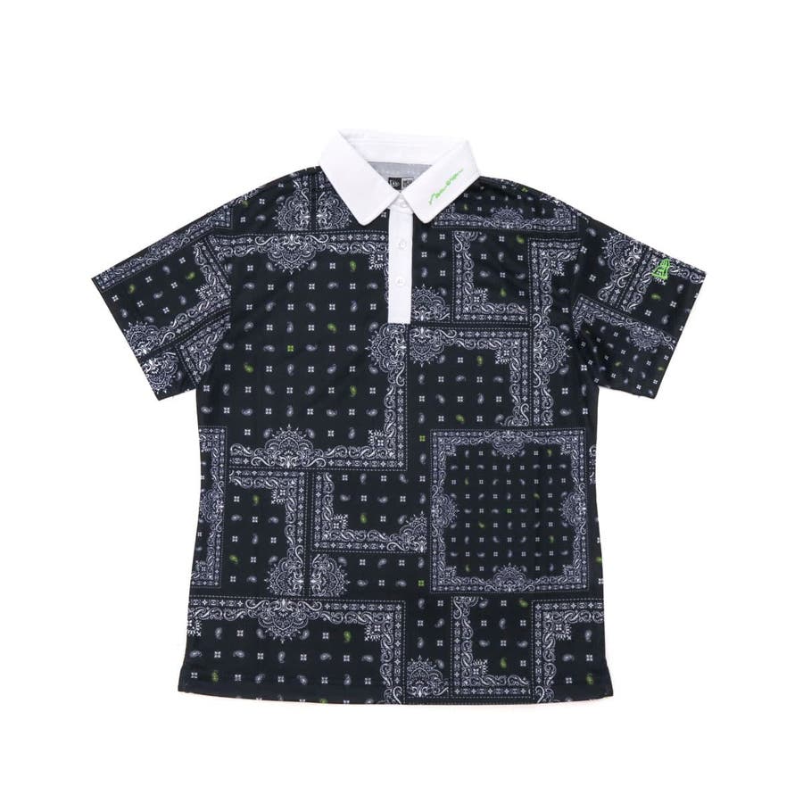 バンダナ柄を重ねたコラージュが目を引く半袖ポロシャツ。襟と袖のロゴ刺繍がデザインのアクセントになっており、ベーシックなボトムに合わせるだけでコーディネートを華やかに仕上げます。素材には、吸汗速乾機能に加え、紫外線カット・抗菌効果を備えた通気性の高い鹿の子編み生地を採用。暑い時期のラウンドも快適にプレイできるアイテムです。