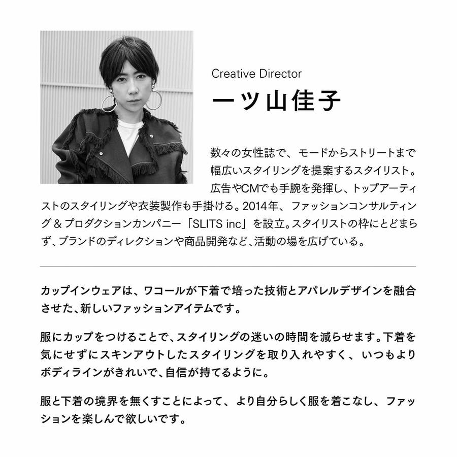 | 美しさ、着心地の良さを 追及したデザイン 下着のワコールが手掛ける、機能性と高いデザイン性を両立したタンクトップ。ワコール独自のカップと服を一体化したデザインで、美しくボディラインを整え、一枚で、また組み合わせてもフレキシブルに自分らしい着こなしをお楽しみいただけます。クリエイティブディレクターに一ツ山佳子氏、デザイナーに坂寄順子氏を迎え、ワコールの技術と、ファッションのスペシャリストの知見を融合。高い実用性とファッション性を兼ね備えたウェアを提案します。 |