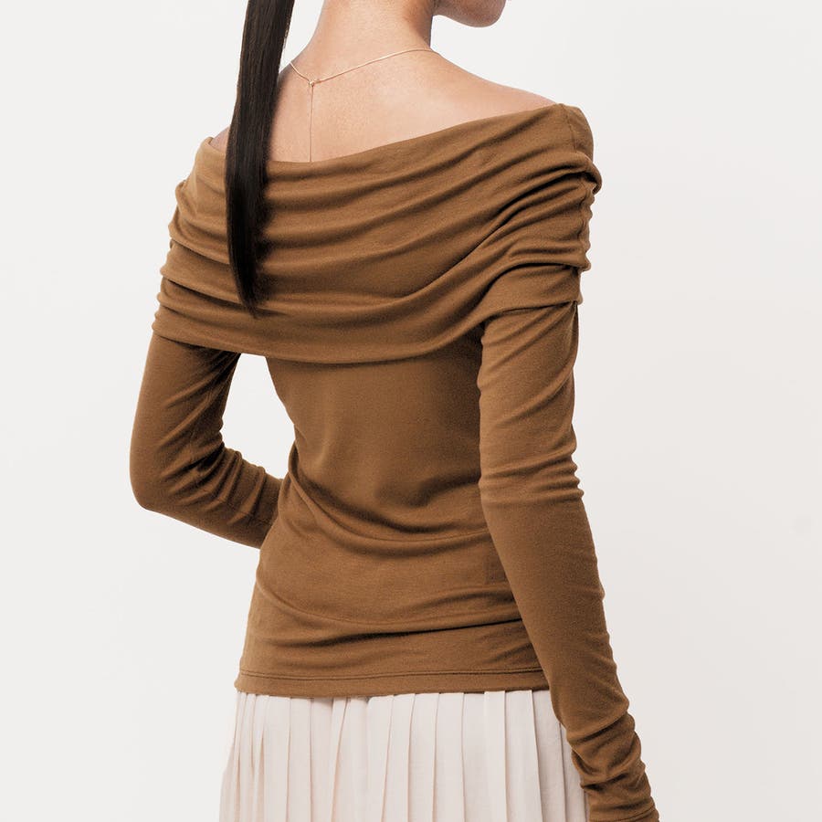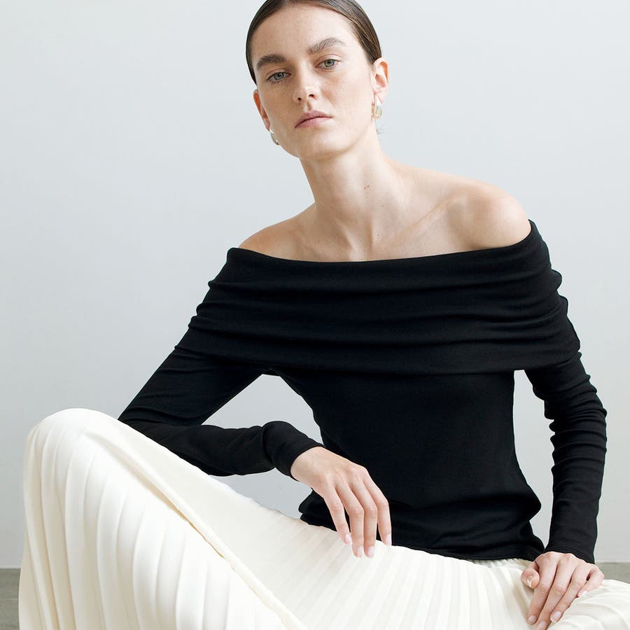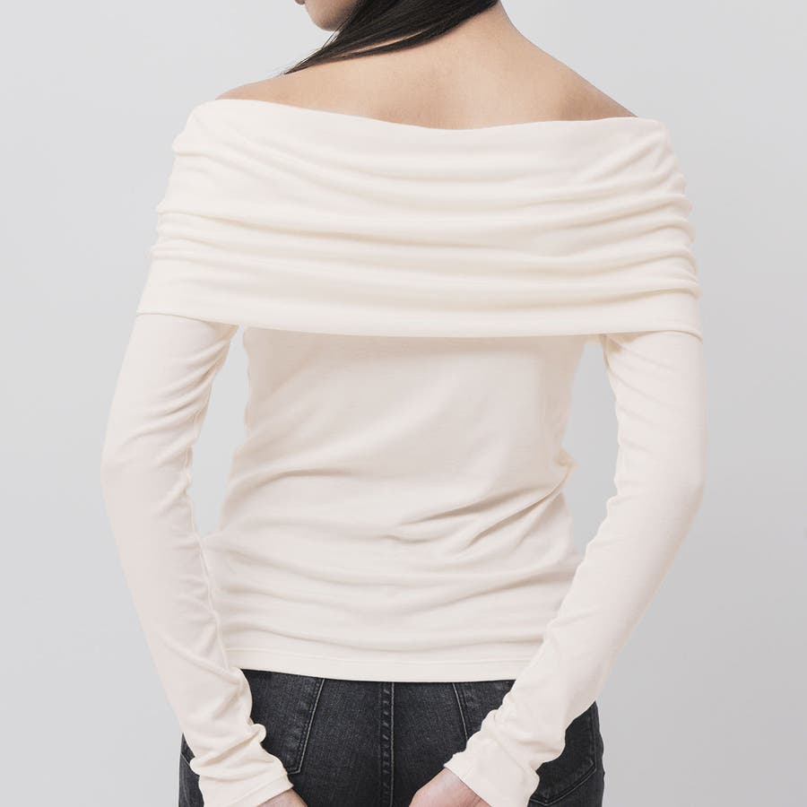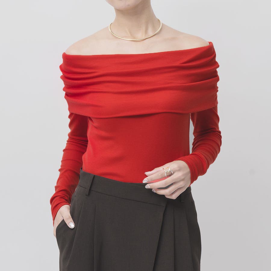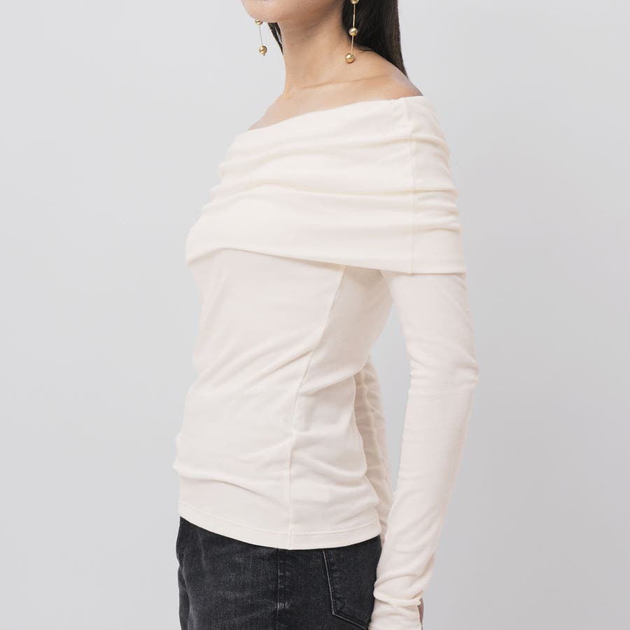 インナー選びに迷うことなく、1枚で着られるカップ付きのオフショルダーです。ボディラインに沿ったコンパクトなシルエットと、襟の折り返しがポイント。下着メーカーならではのこだわりが詰まったカップは、自然で綺麗なバストシルエットを追求しました。
