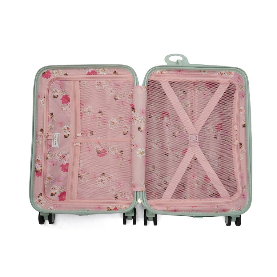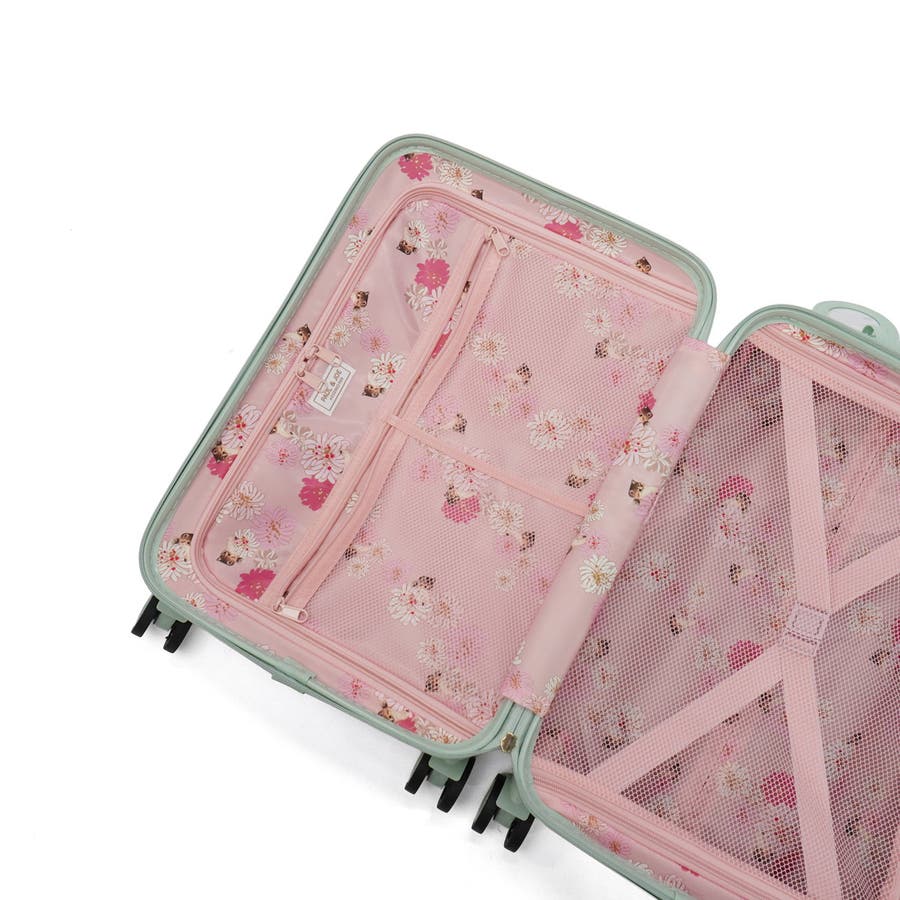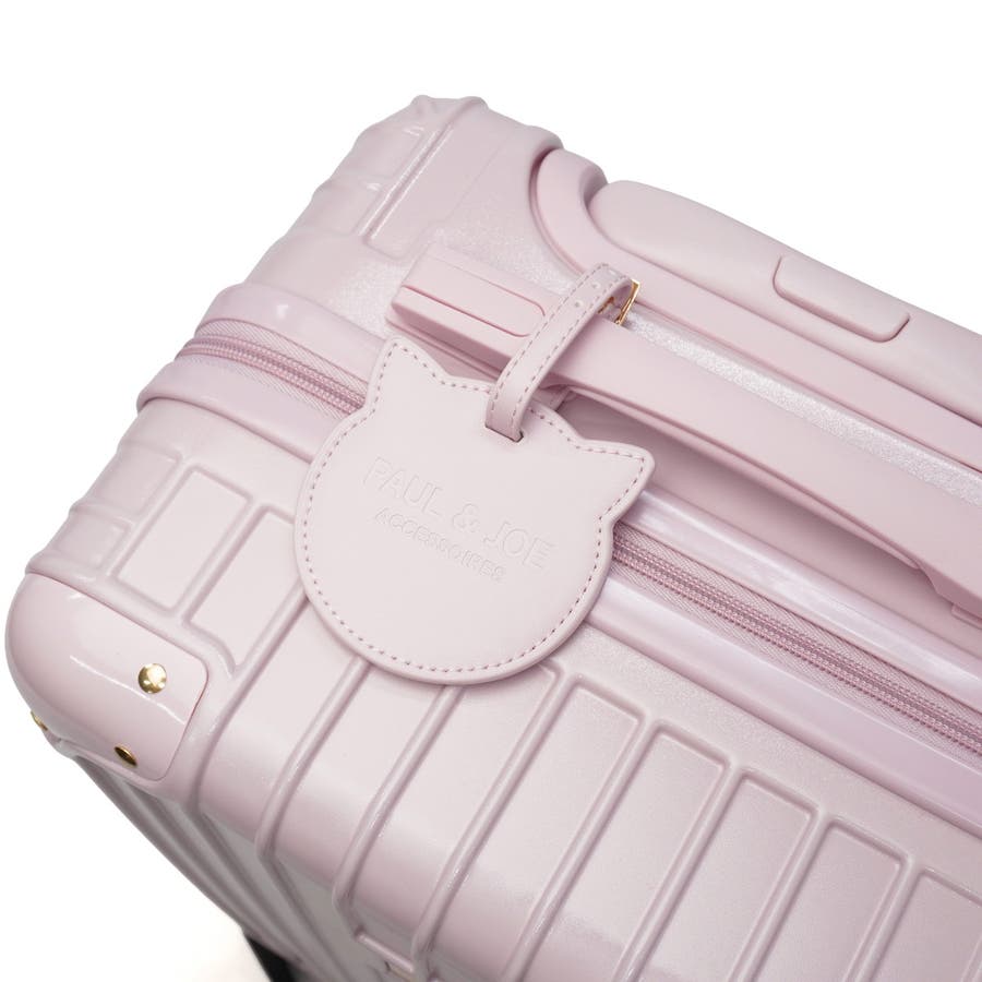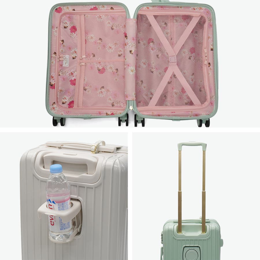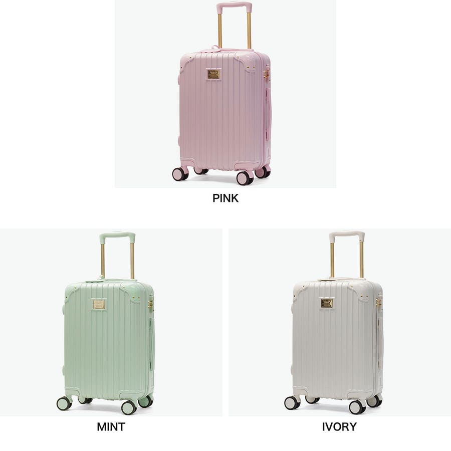 淡いカラーが可愛いスーツケースです。ハンドルやタイヤも本体と同色で統一感のあるデザイン。表面は傷が目立ちにくいシボ加工仕上げで、上品な印象に。こちらは、機内持ち込み対応サイズです。内装にはヌネット&クリザンテームの総柄を採用し、華やかさも◎。着替えの収納に便利な同柄ポーチ付き。猫型ネームタグや折りたたみ式カップホルダーなど、機能性にもこだわった一品です。