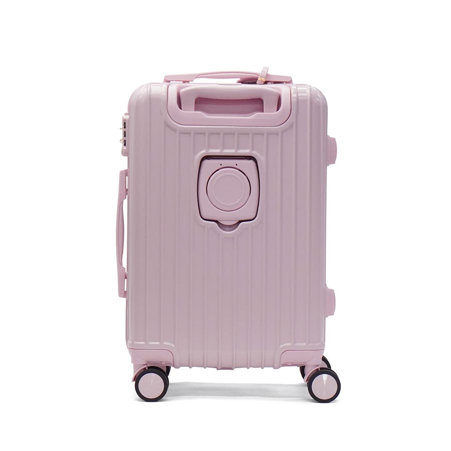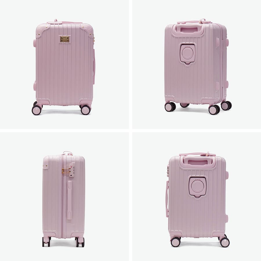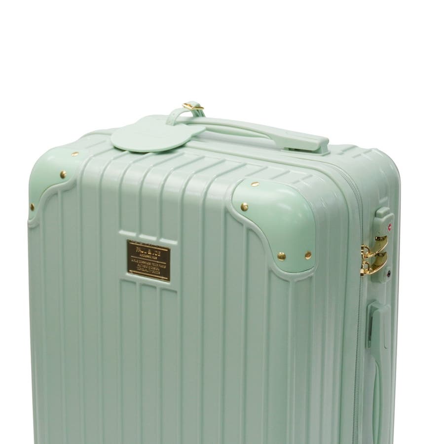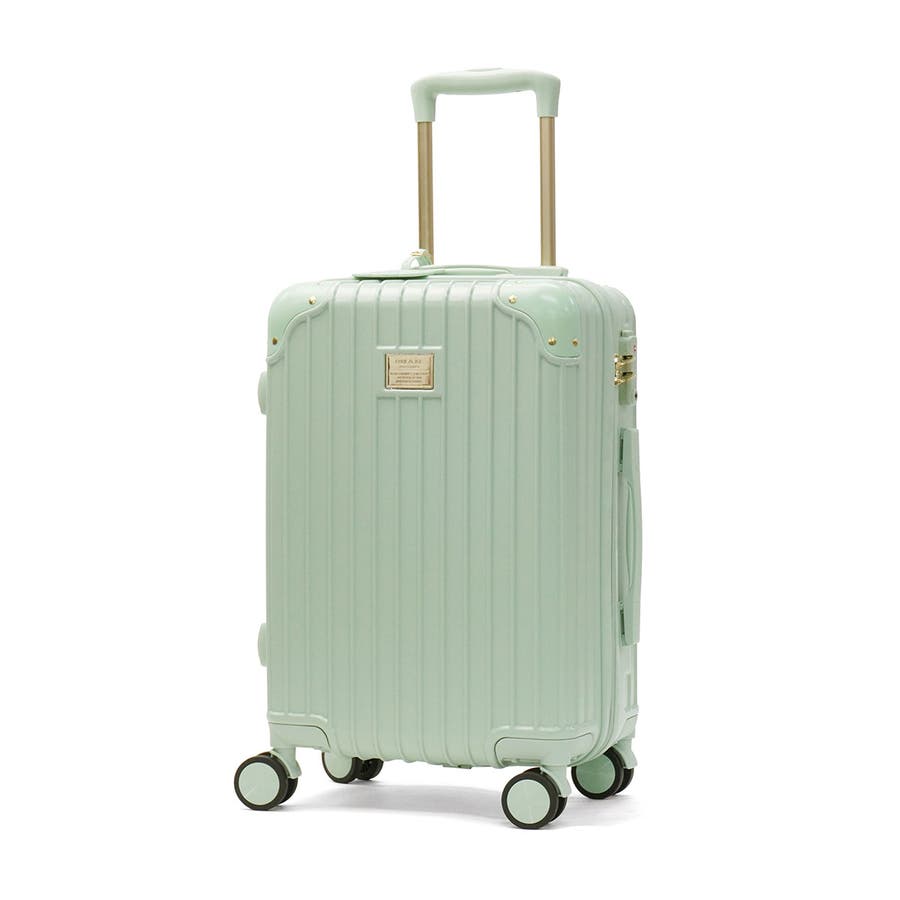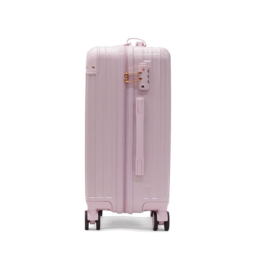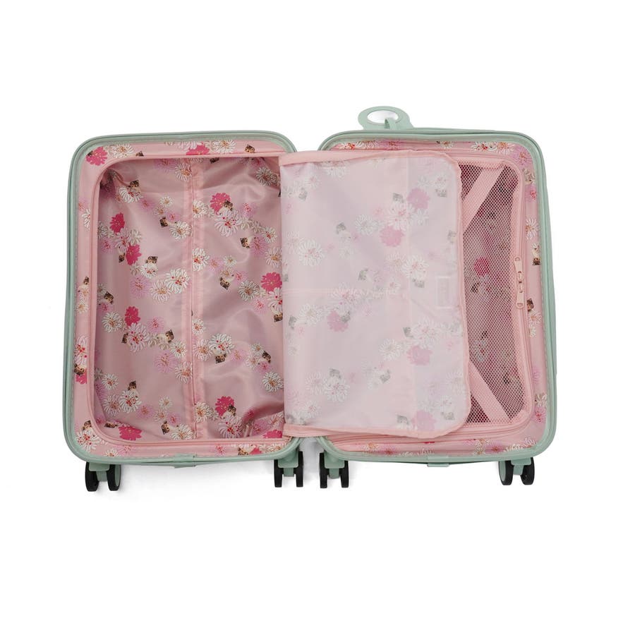 淡いカラーが可愛いスーツケースです。ハンドルやタイヤも本体と同色で統一感のあるデザイン。表面は傷が目立ちにくいシボ加工仕上げで、上品な印象に。こちらは、機内持ち込み対応サイズです。内装にはヌネット&クリザンテームの総柄を採用し、華やかさも◎。着替えの収納に便利な同柄ポーチ付き。猫型ネームタグや折りたたみ式カップホルダーなど、機能性にもこだわった一品です。