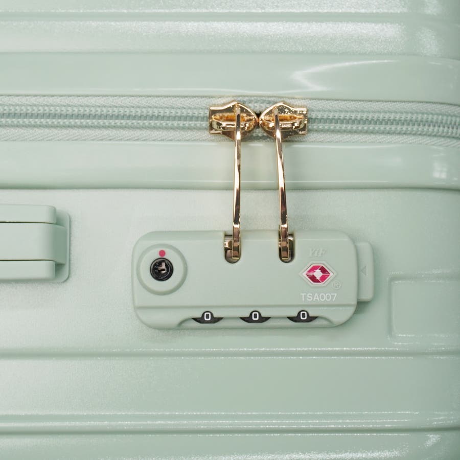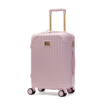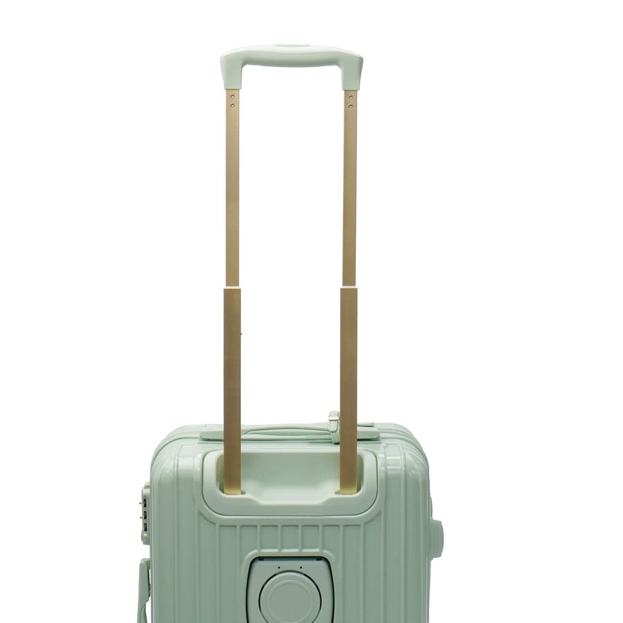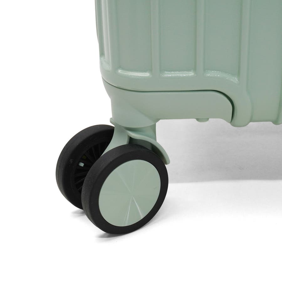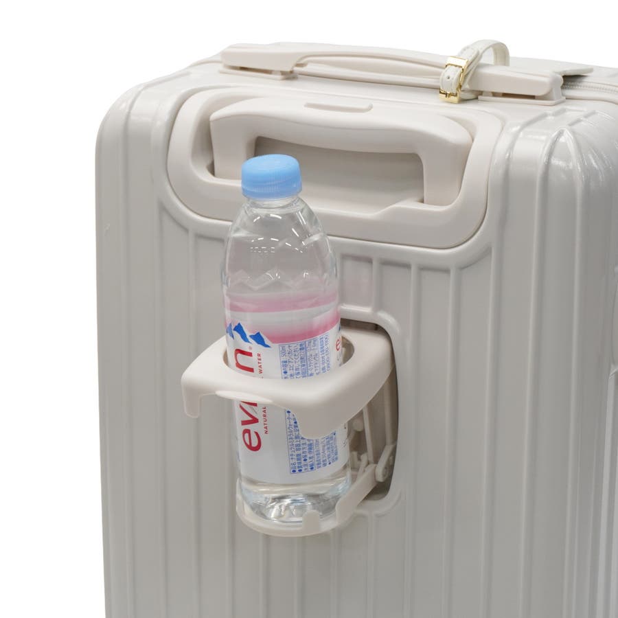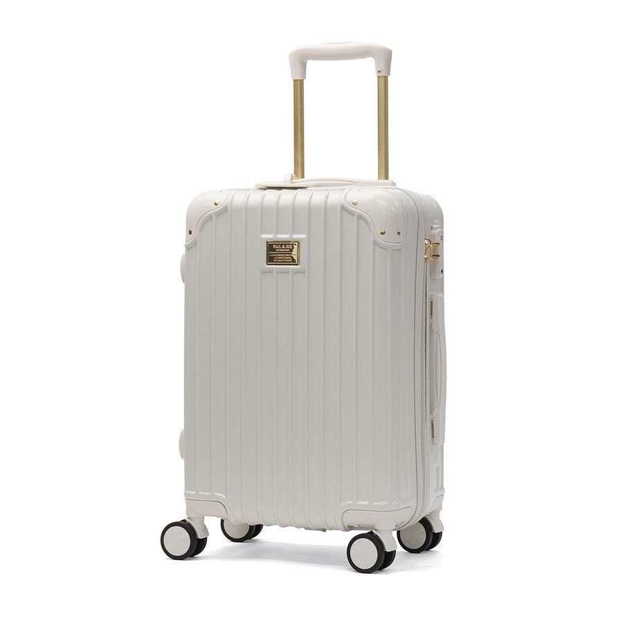 淡いカラーが可愛いスーツケースです。ハンドルやタイヤも本体と同色で統一感のあるデザイン。表面は傷が目立ちにくいシボ加工仕上げで、上品な印象に。こちらは、機内持ち込み対応サイズです。内装にはヌネット&クリザンテームの総柄を採用し、華やかさも◎。着替えの収納に便利な同柄ポーチ付き。猫型ネームタグや折りたたみ式カップホルダーなど、機能性にもこだわった一品です。