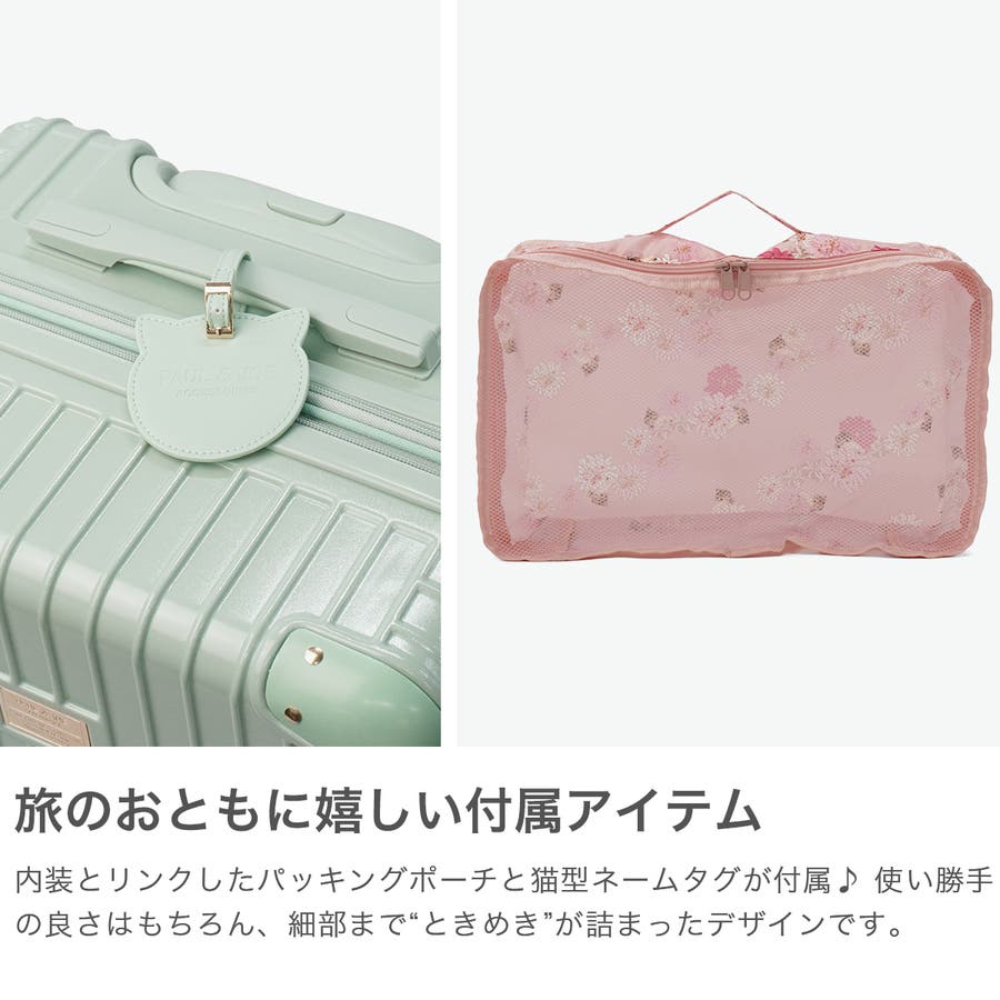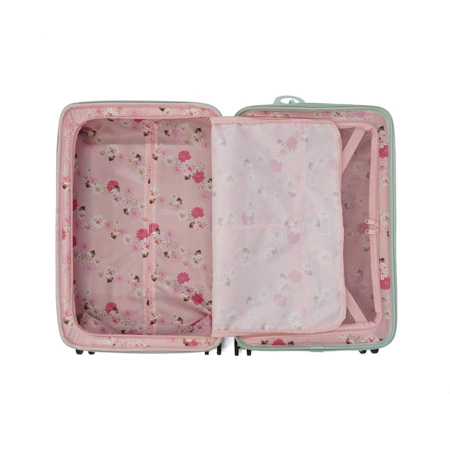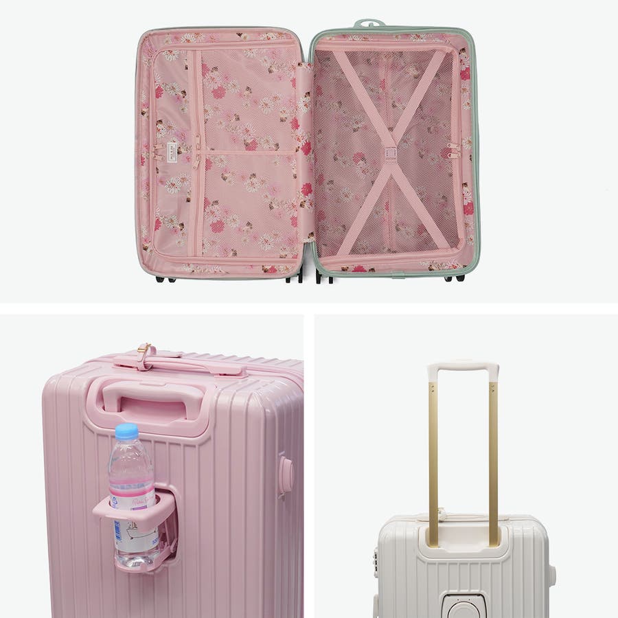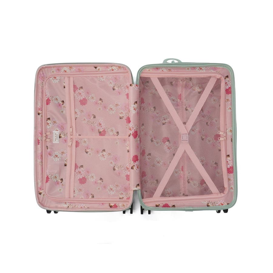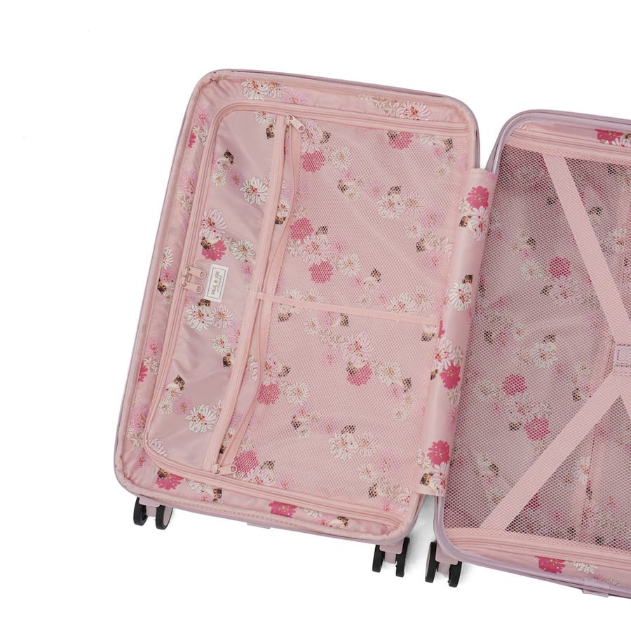 淡いカラーが可愛いスーツケースです。ハンドルやタイヤも本体と同色で統一感のあるデザイン。表面は傷が目立ちにくいシボ加工仕上げで、上品な印象に。こちらは、拡張可能な63~72L容量で荷物が増えても安心。内装にはヌネット&クリザンテームの総柄を採用し、華やかさも◎。着替えの収納に便利な同柄ポーチ付き。猫型ネームタグや折りたたみ式カップホルダーなど、機能性にもこだわった一品です。