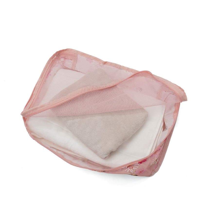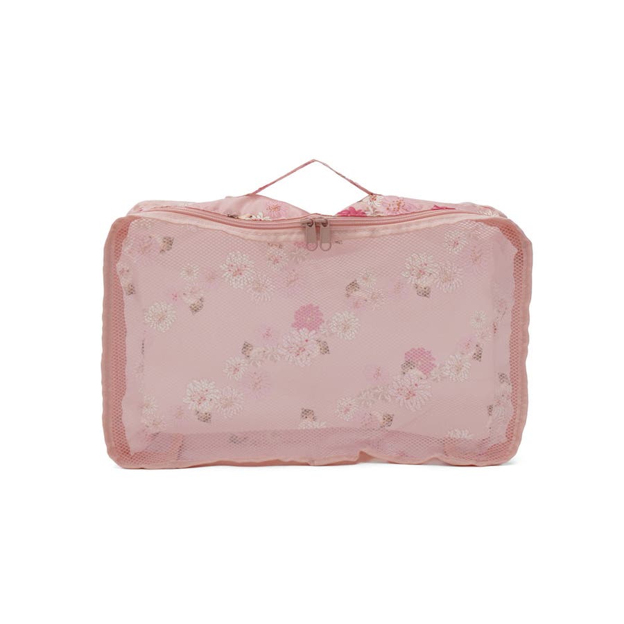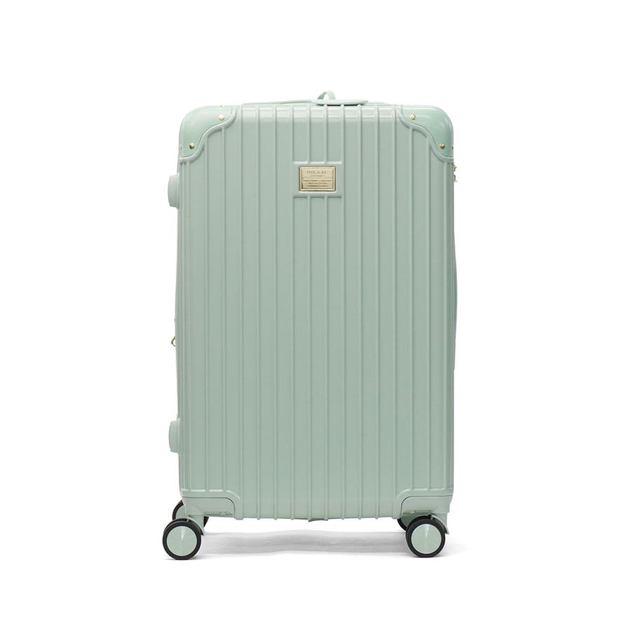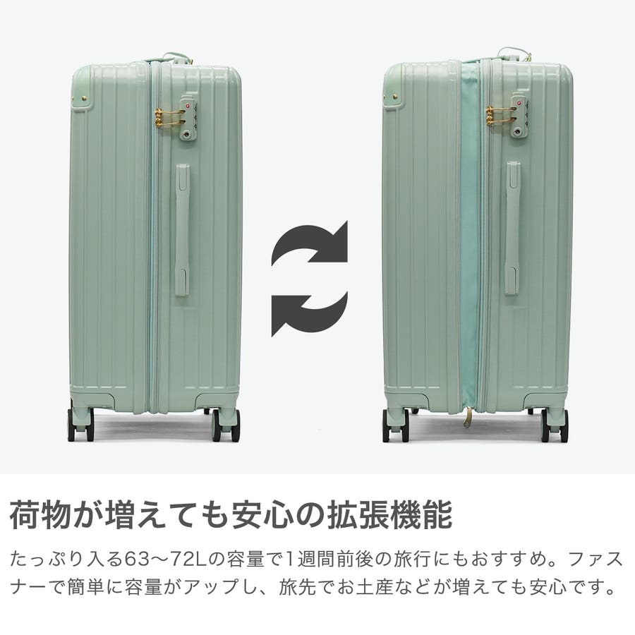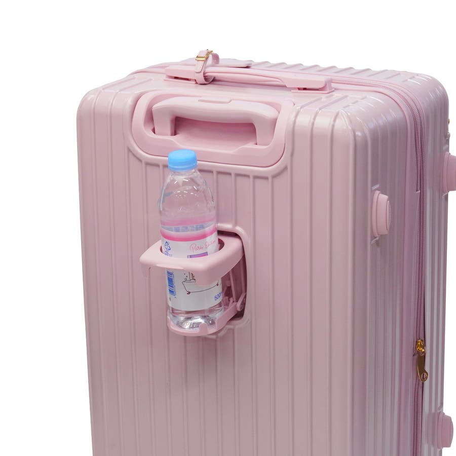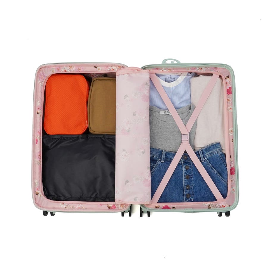 淡いカラーが可愛いスーツケースです。ハンドルやタイヤも本体と同色で統一感のあるデザイン。表面は傷が目立ちにくいシボ加工仕上げで、上品な印象に。こちらは、拡張可能な63~72L容量で荷物が増えても安心。内装にはヌネット&クリザンテームの総柄を採用し、華やかさも◎。着替えの収納に便利な同柄ポーチ付き。猫型ネームタグや折りたたみ式カップホルダーなど、機能性にもこだわった一品です。