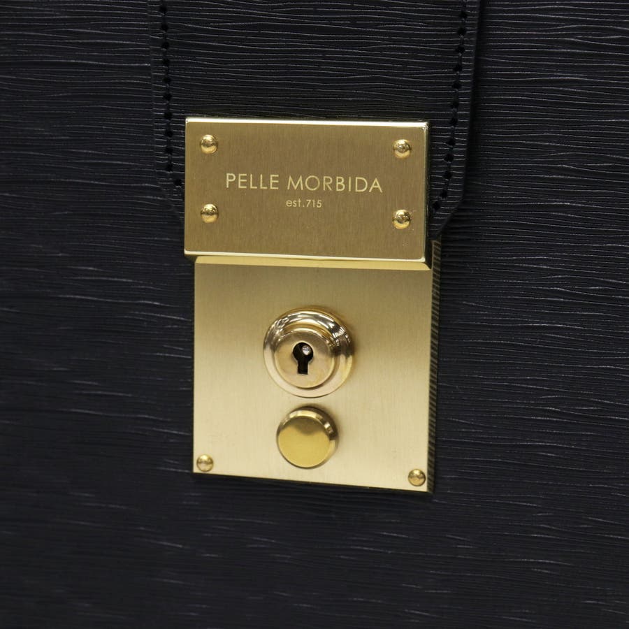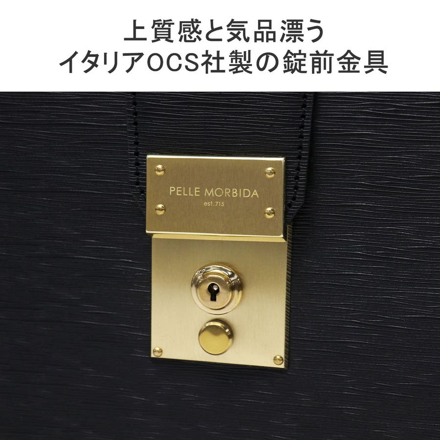 コバ塗りが施された伝統的な総切り目仕立てや代々受け継がれる二本針の手縫いで仕立てられるのが特徴で、現代では著しく僅少な技術です。この「FIVE WOODS」のトラディショナルなものづくりと「PELLE MORBIDA」のアイコンのひとつである質実剛健な様相の波型の型押しレザーがバランス良く融合しました。また、錠前金具は削り出しによって形成されたシャープなエッジが美しいイタリアOCS社製のデッドストックを使用するというこだわりとなっています。