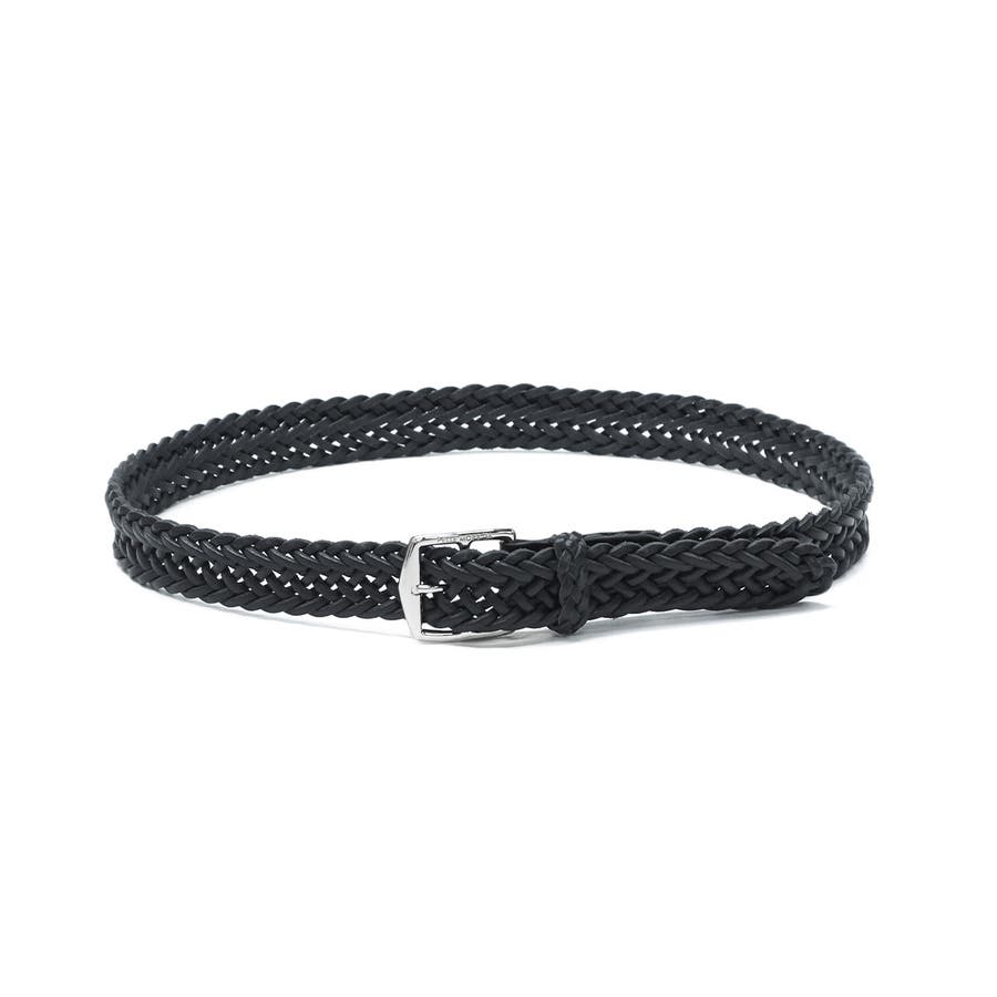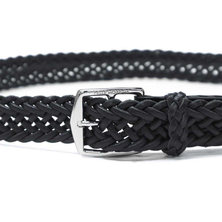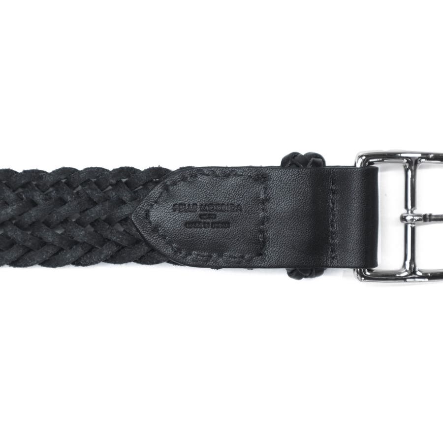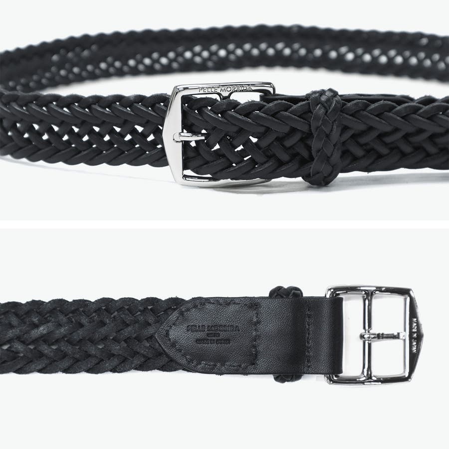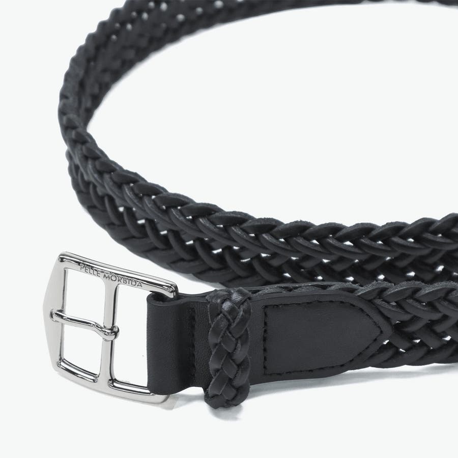 カジュアルシーン、ビジネスシーン問わず使い勝手の良いレザーメッシュベルト。カジュアルになりがちなレザーメッシュですが、レザーの繊維が出ないよう丁寧に裁断し、帯を細かく繊細に編み上げることでエレガントさをなくさないデザインに仕上がりました。メッシュなのでサイズ調整が自由にきくのも嬉しいポイント。モルビダの美しい曲線を表現したオリジナルバックルも目をひきます。