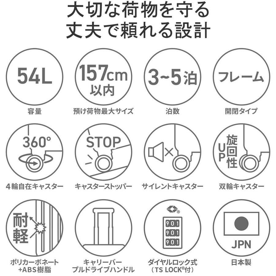 軽量で高剛性を誇る新型フレームを採用し、密閉性と荷物の保護性を高めたシリーズ『チェッカーフレーム』のスーツケース。こちらは、3~5泊程度の旅行に最適な54Lモデルです。ボディのチェックパターンと極限まで存在感を抑えたフレームが、シンプル&スタイリッシュな表情を演出しています。また、充実した機能性が旅をより安心・快適なものにします。