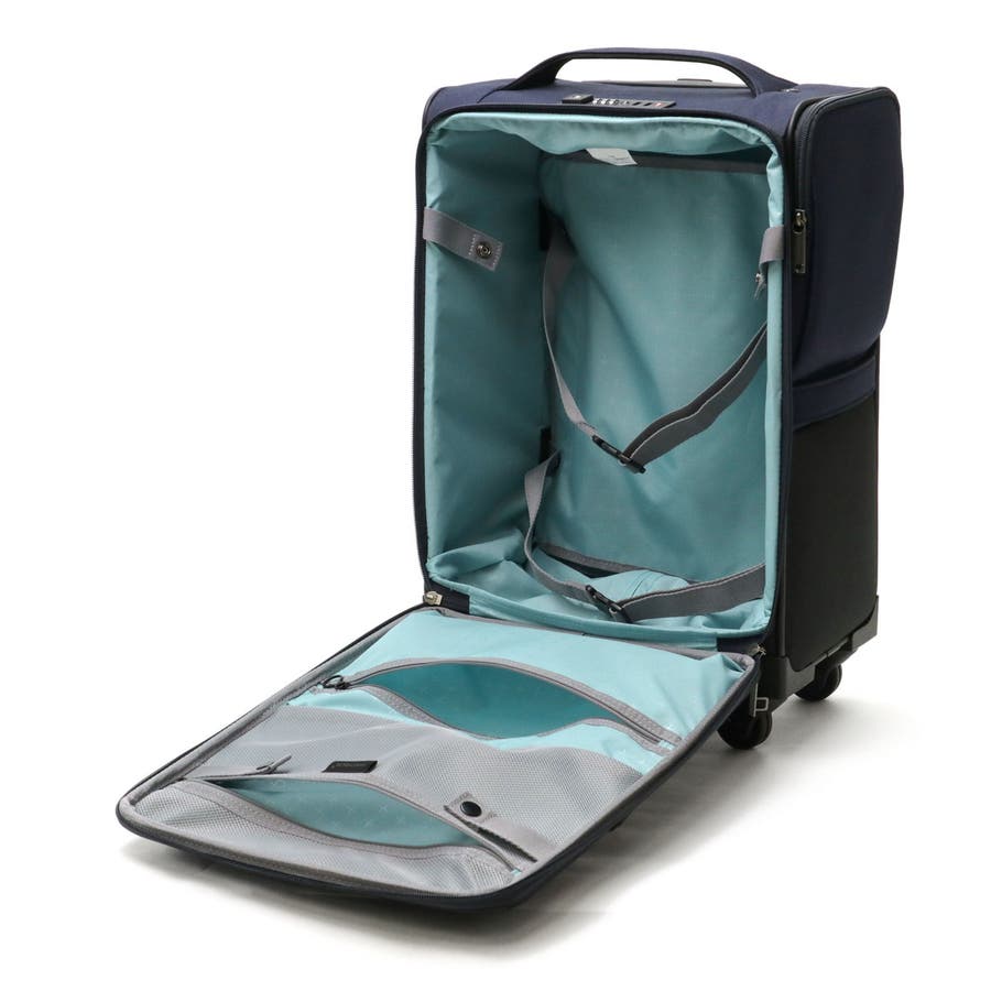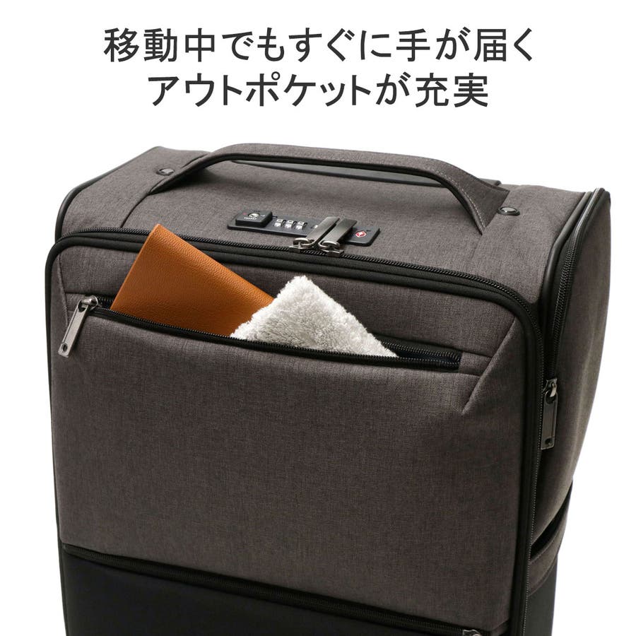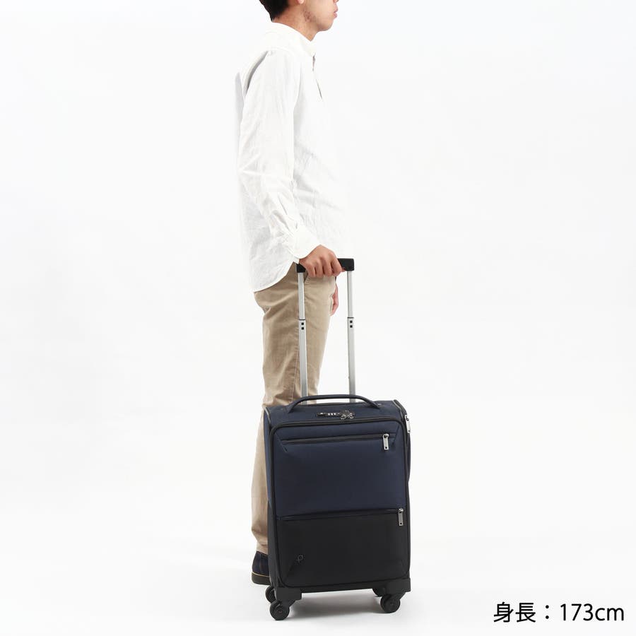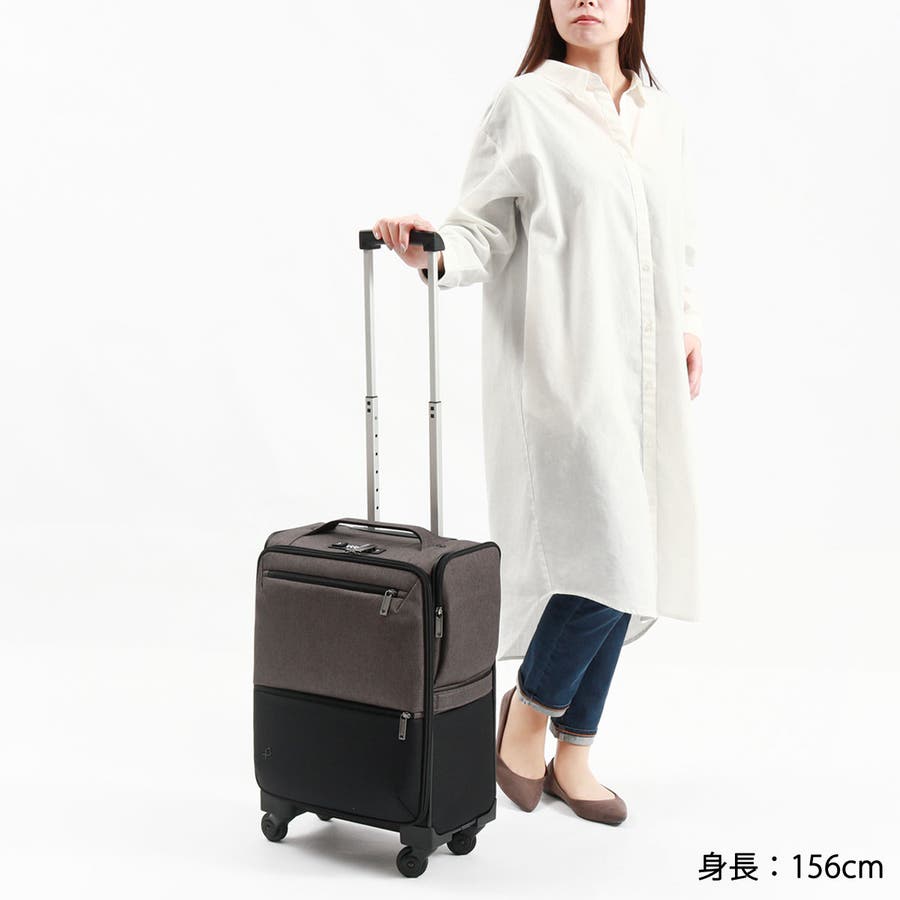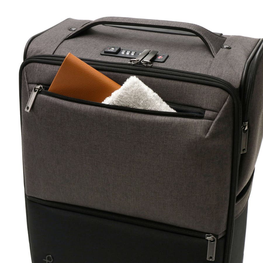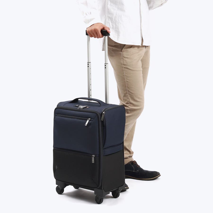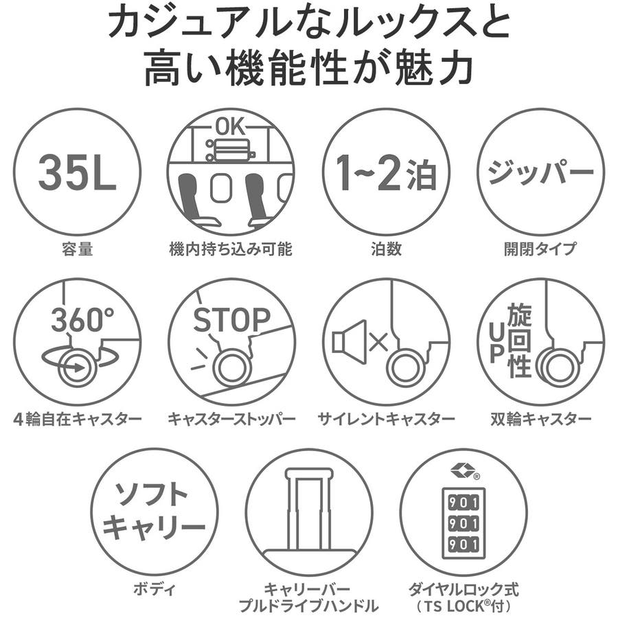 素材感のコンビネーションが特徴的で、カジュアルな印象のトロリーシリーズ『ACTOY 2/アクトーイ 2』。こちらは、機内持ち込み可能な35Lモデルです。手元のスイッチで簡単に操作できるマジックストップや、体感音量を大幅に削減したサイレントキャスターを採用するなど、プロテカならではの機能性を集約した、高い機能性が魅力になっています。