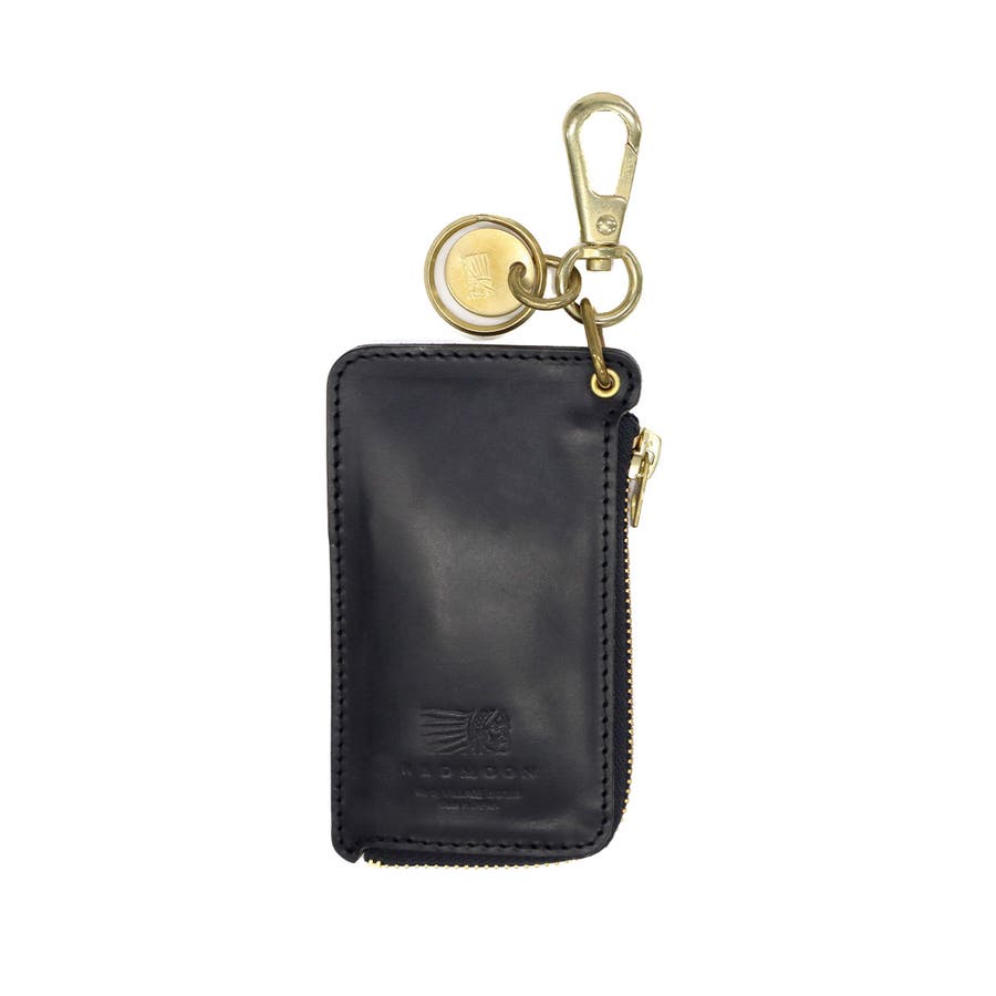 ホーウィン社のクロムエクセルレザーを使用したキーホルダー付き薄型スリムウォレット。L型ジップで開閉するミニマルデザインで、引き手はブランドオリジナルとなります。ナスカン付きでアクセサリー感覚でベルトループに着ける事が可能。真鍮の金具がクロムエクセルレザーの風合いをより引き立てます。