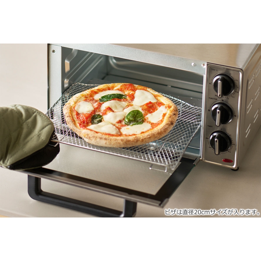 無機質なオールステンレスが際立つ、シンプル機能を備えたオーブントースター。3段階のFUNCTION設定で焼き加減を自在に調整でき、上面に焦げ目をつけたり、冷めた料理を温め直すなど多彩な調理が楽しめます。約90~230℃の無段階温度調節と30分まで設定可能なタイマーを搭載し、パイやグラタンなどの長時間調理にも対応。上下段で設置位置を選べるため、調理法に応じて使い分けが可能です。インダストリアルな雰囲気が、アンティークな空間にも自然に溶け込みます。