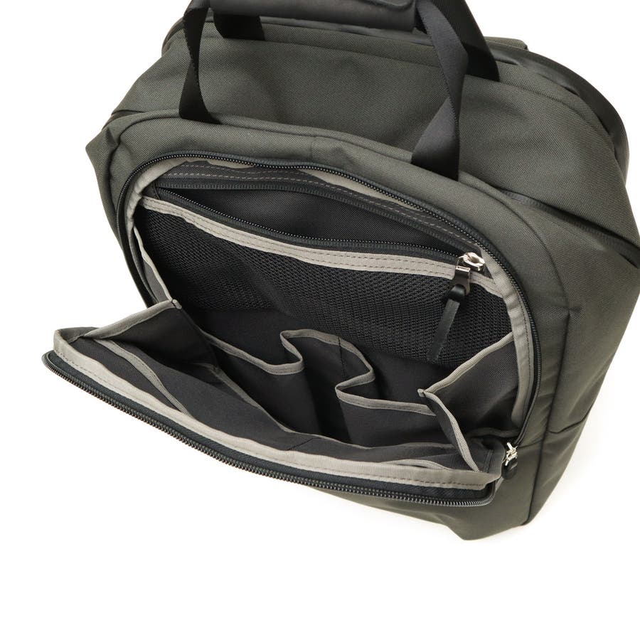 カジュアルさを持ち合わせたビジネスユースシリーズ『EFFECT』のキャリーパック。キャリーケースに付けた状態での使用を想定したポケットレイアウトになっており、カッチリしすぎないカジュアル感と優れた機能性から、ビジネスと普段使いの両立ができるアイテムです。