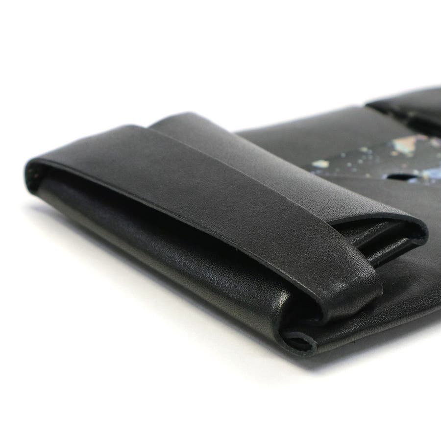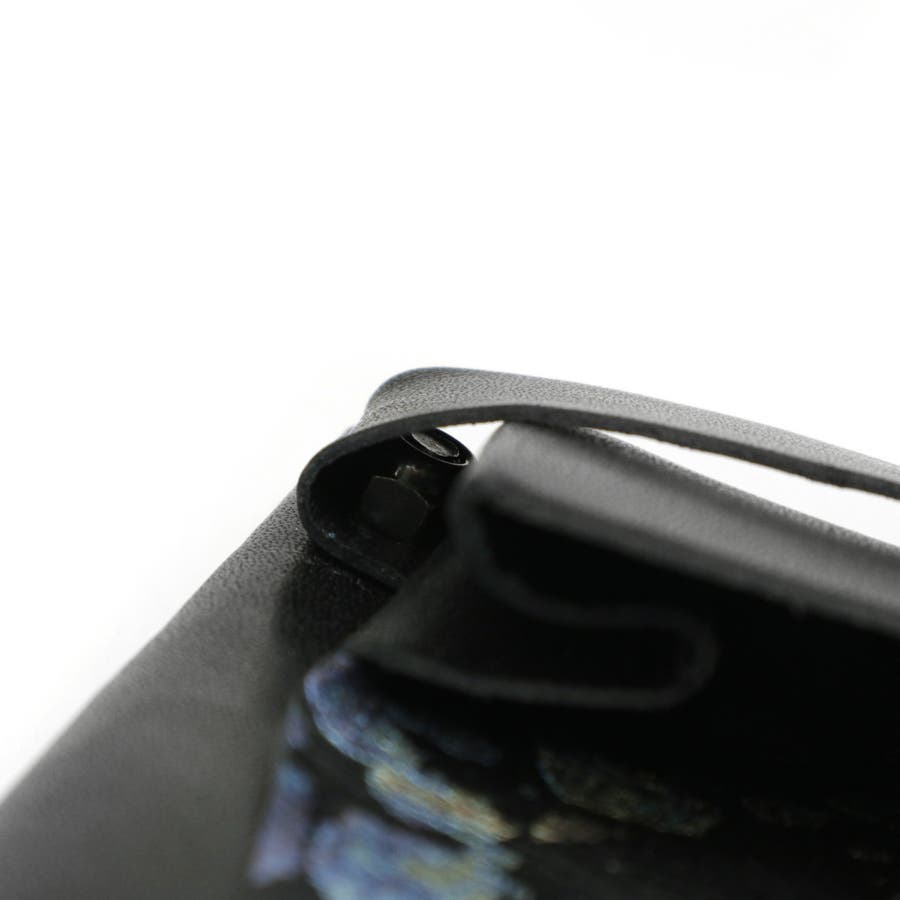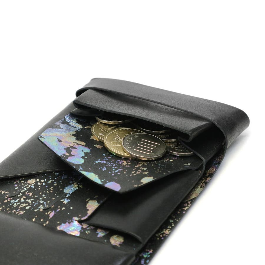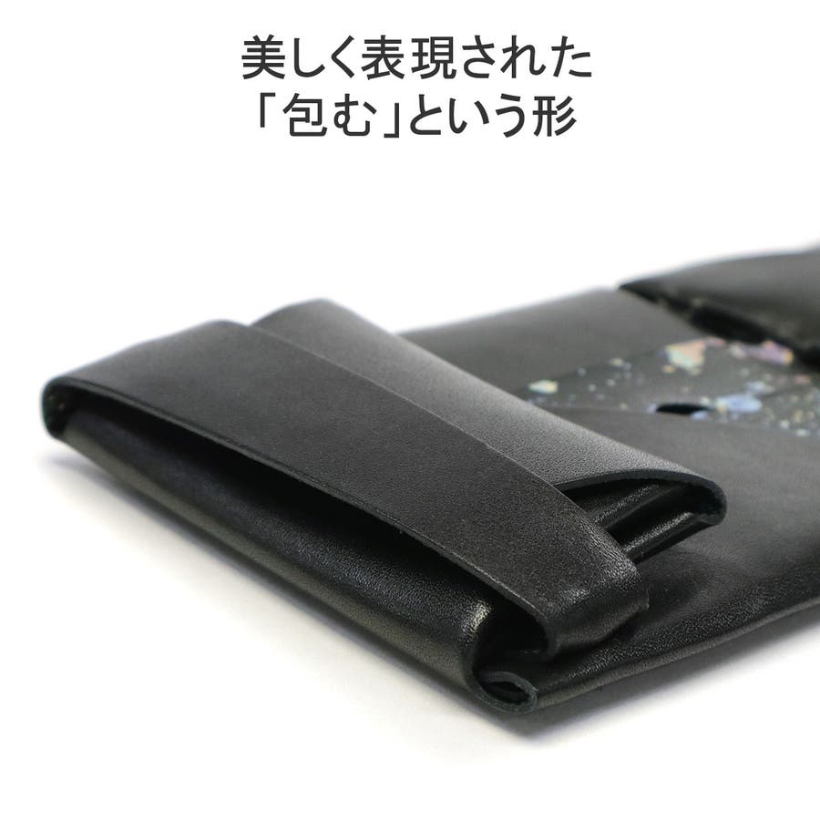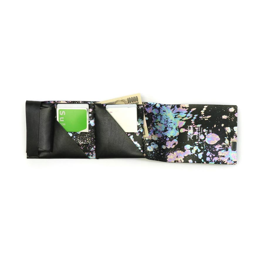上質なブラックレザーに、まるでシャボンの雫が飛び散ったかのような箔を乗せ、幻想的な表情に仕上げた三つ折り財布。贈答品を包む「袱紗(ふくさ)」をモチーフにし、上質な一枚革を折って成形。縫わずに最後に1点をボルト&ナットで留め付けるだけという、日本の美学が表現されたデザインです。ファスナーやボタンを使わず、レザー本来の風合いを最大限に活かしています。