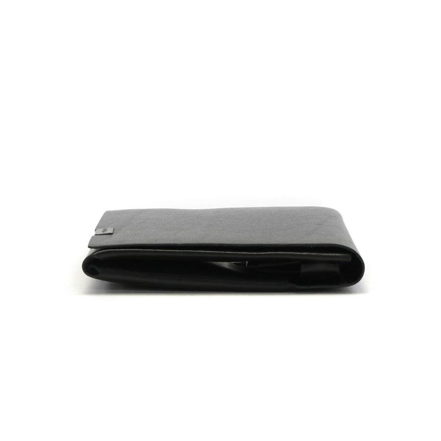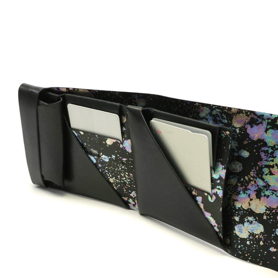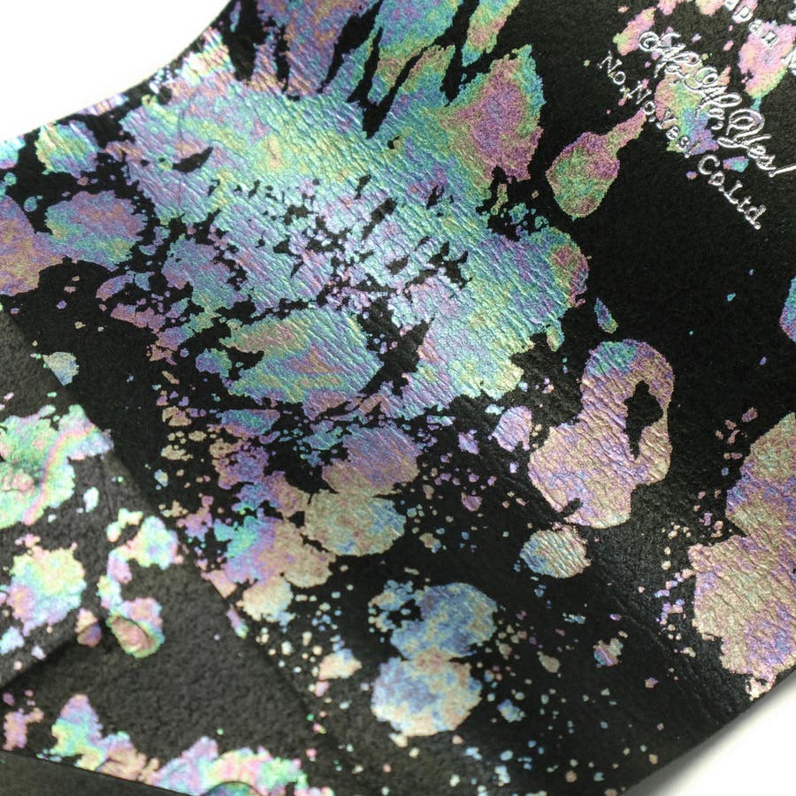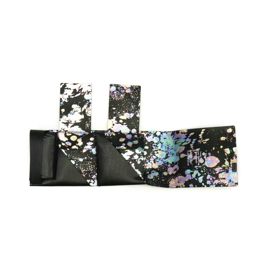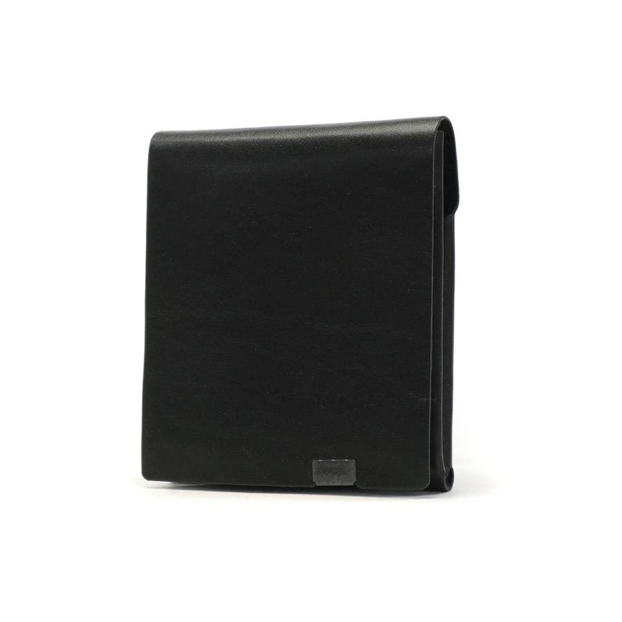 上質なブラックレザーに、まるでシャボンの雫が飛び散ったかのような箔を乗せ、幻想的な表情に仕上げた三つ折り財布。贈答品を包む「袱紗(ふくさ)」をモチーフにし、上質な一枚革を折って成形。縫わずに最後に1点をボルト&ナットで留め付けるだけという、日本の美学が表現されたデザインです。ファスナーやボタンを使わず、レザー本来の風合いを最大限に活かしています。