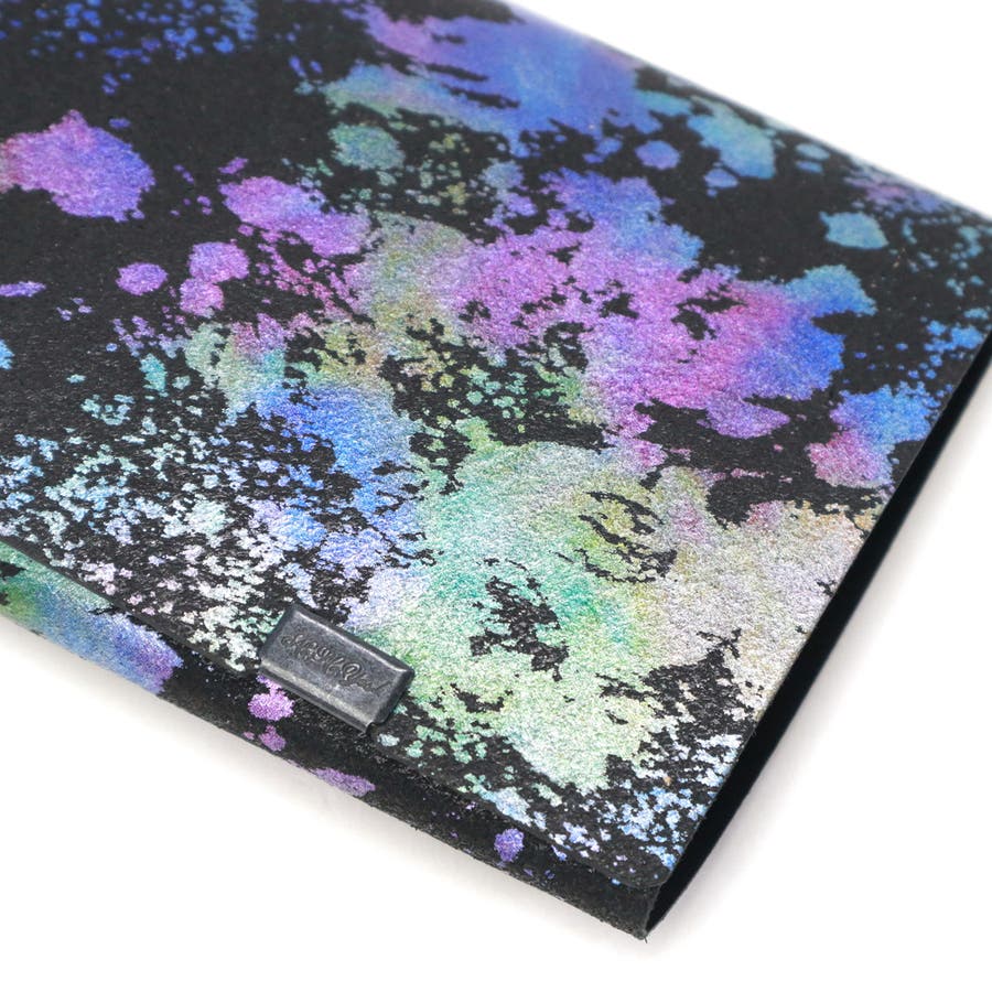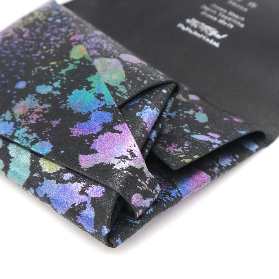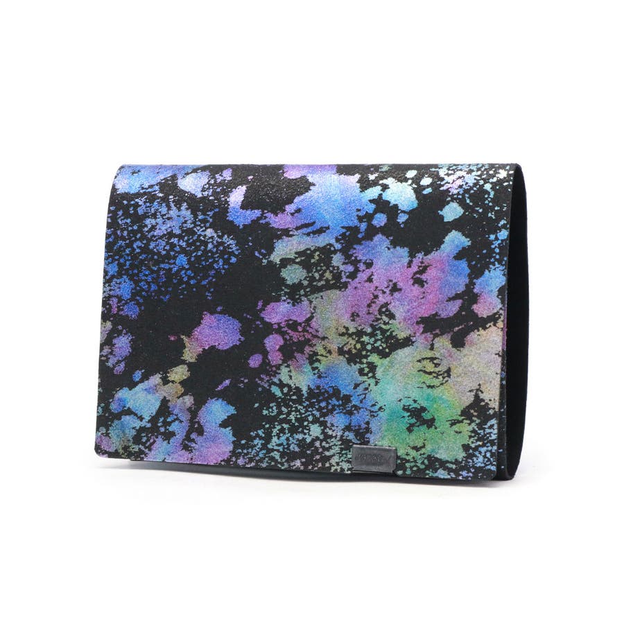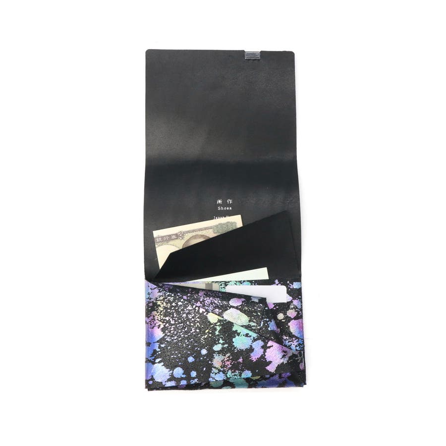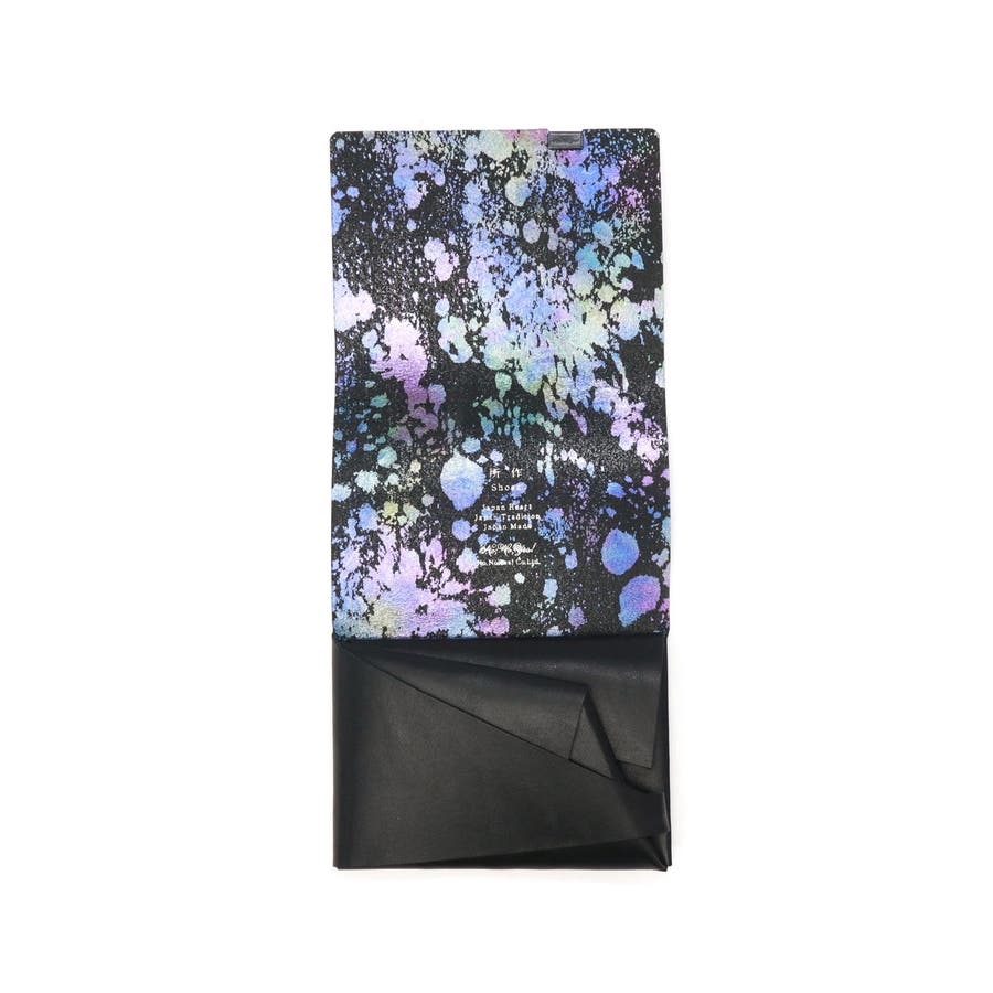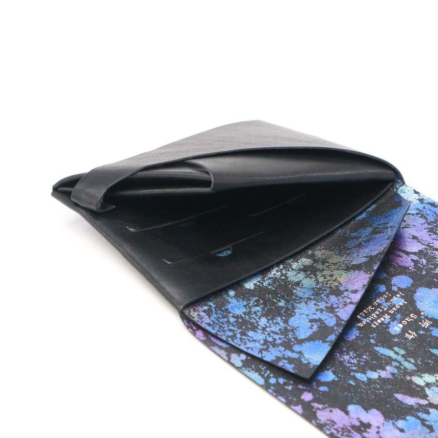 ペンキを散らしたかの様な孔雀色のカラーリングが目を惹く三つ折り財布。贈答品を包む「袱紗(ふくさ)」をモチーフにし、上質な一枚革を折って成形。縫わずに最後に1点をボルト&ナットで留め付けるだけという、日本の美学が表現されたデザインです。目立ちながらに品がある柄は、見る角度や光の加減により異なる表情を魅せ、見るだけでもウットリとした良い気分になれます。