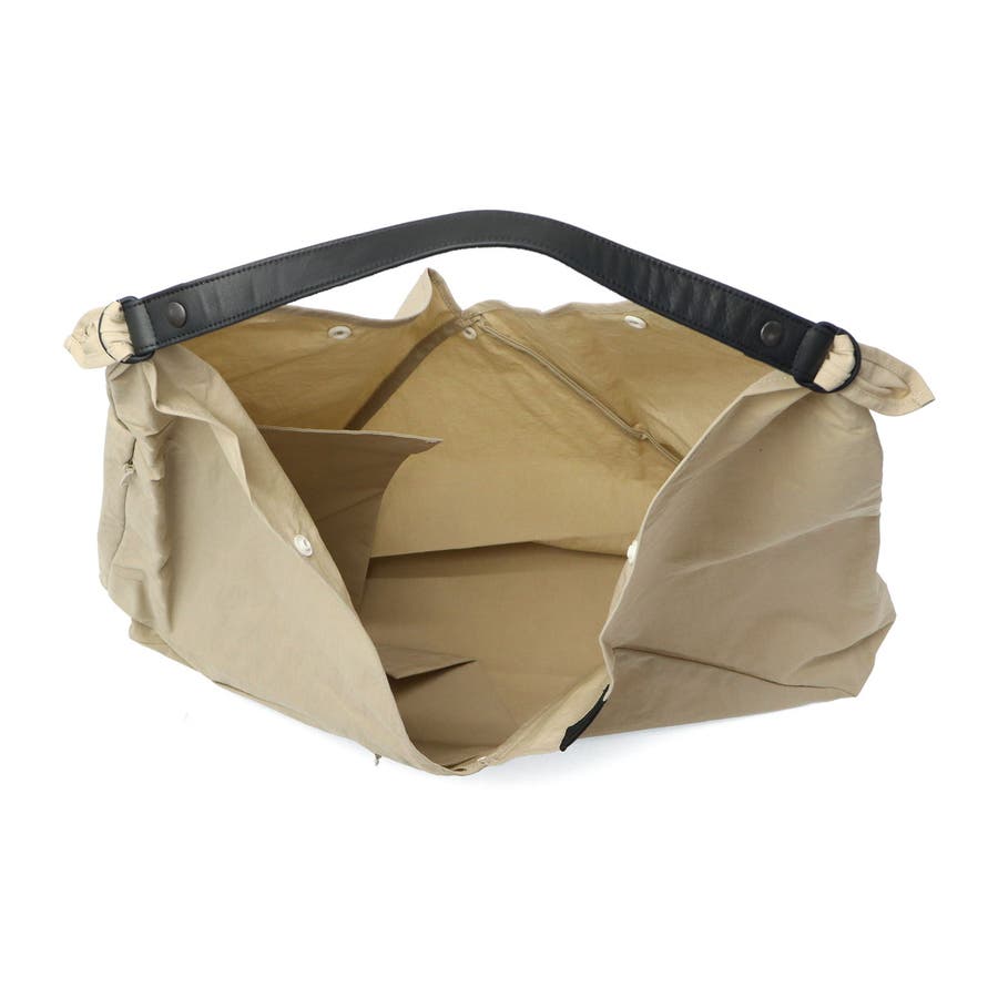綿のような質感でありながら、綿よりも軽量で強度のある「スパンナイロン」を使用したトートバッグ。独特のシワ感が綿ライクな風合いを演出し、撥水加工で日常使いにも最適です。吾妻袋未着想を得たフォルムは、斜めがけや肩掛けなど多彩な持ち方が可能。コンシールファスナーと牛革ハンドルが上質さを引き立てます。