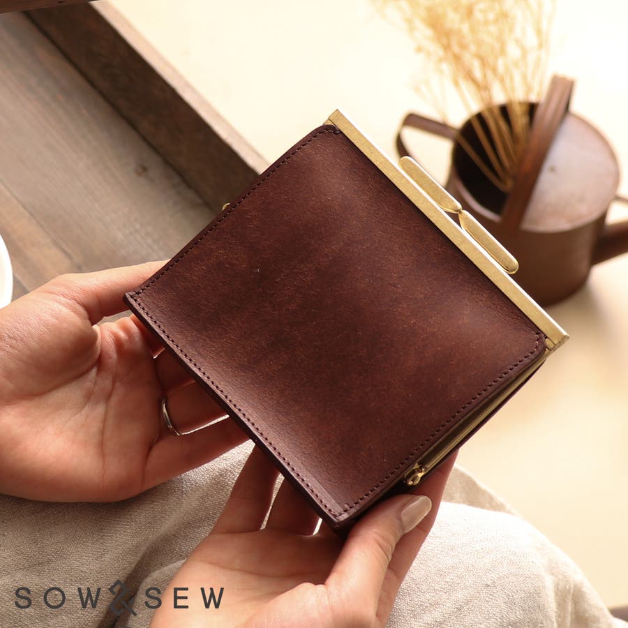 コロンと手のひらに収まるサイズが愛らしいSOW&SEWのがま口財布。ギャルソンタイプの小銭入れの構造により口が大きく開き視認性と取り出しやすさに優れ、マットなプエブロレザーの質感と真鍮風金具が相まって上品な佇まいが印象的なアイテムです。正面から見ると一般的ながま口財布に見えますが、SOW&SEWのがま口は底面のまとめ方がとても個性的です。ダレスバッグのように側面と底面の革を別々に組み込むことで底が立つ構造になっています。がま口をサッと開き扇型に広がる端麗な姿は、確かな技術を惜しみなく注ぎ、上質を求めた証でもあります。内装は、お札やカードが入れられるマルチポケットが3つあり、お使いになられる用途によって多目的に収納仕分けができます。そして、ギャルソン仕様の小銭入れにより視認性に富み、がま口全体を大きく開く役割を担っています。さりげないひねりとディテールによって利便性をアップデートしています。表側に使っているレザーはイタリアの伝統的な製法で鞣され深いマットな色味が特徴的なプエブロレザーです。表面に起毛加工を施しツヤのないざらっとした質感が印象的ですが、長い時間をかけて牛の脚から採った脂をたっぷりと染み込ませて作られていますので、使い込むことで艶やかになり深みのある味わいへエイジングしていきます。使い手によって経年の仕方も変わる非常に魅力的なレザーです。