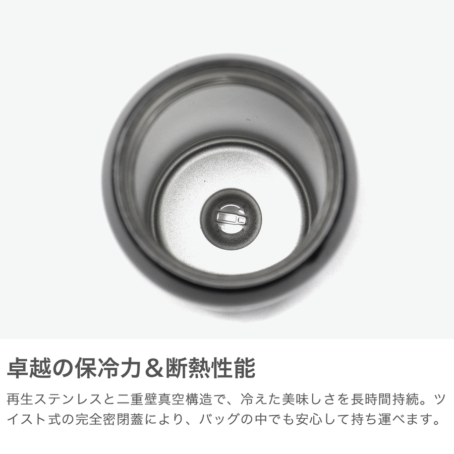 日常使いから旅行まで、どんなシーンにも馴染むスリムなステンレスボトル。ツーピースデザインで氷を入れやすく、お手入れも簡単です。本体は真空断熱構造で、飲み物の冷たさを長時間キープ。フタを軽く回すだけでしっかりと密閉でき、漏れを気にせず安心して持ち運ぶことができます。