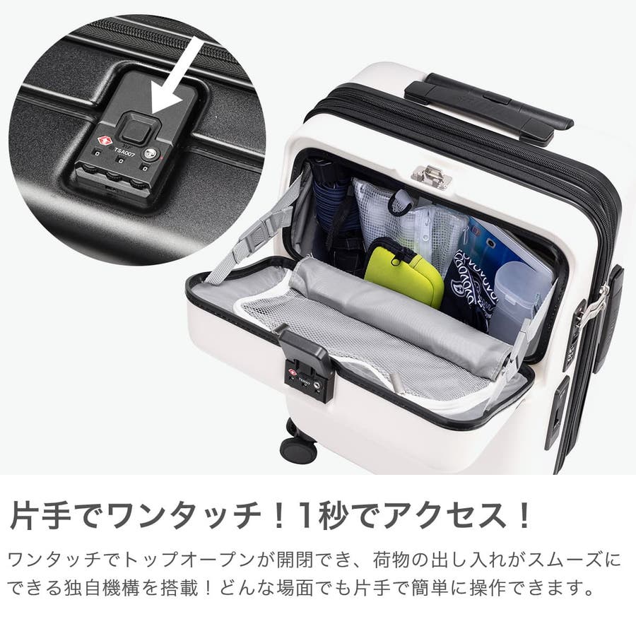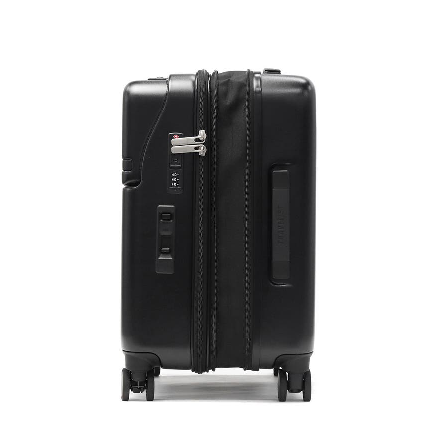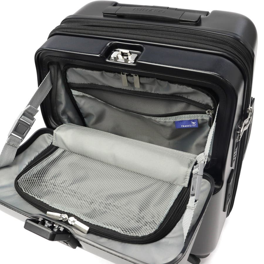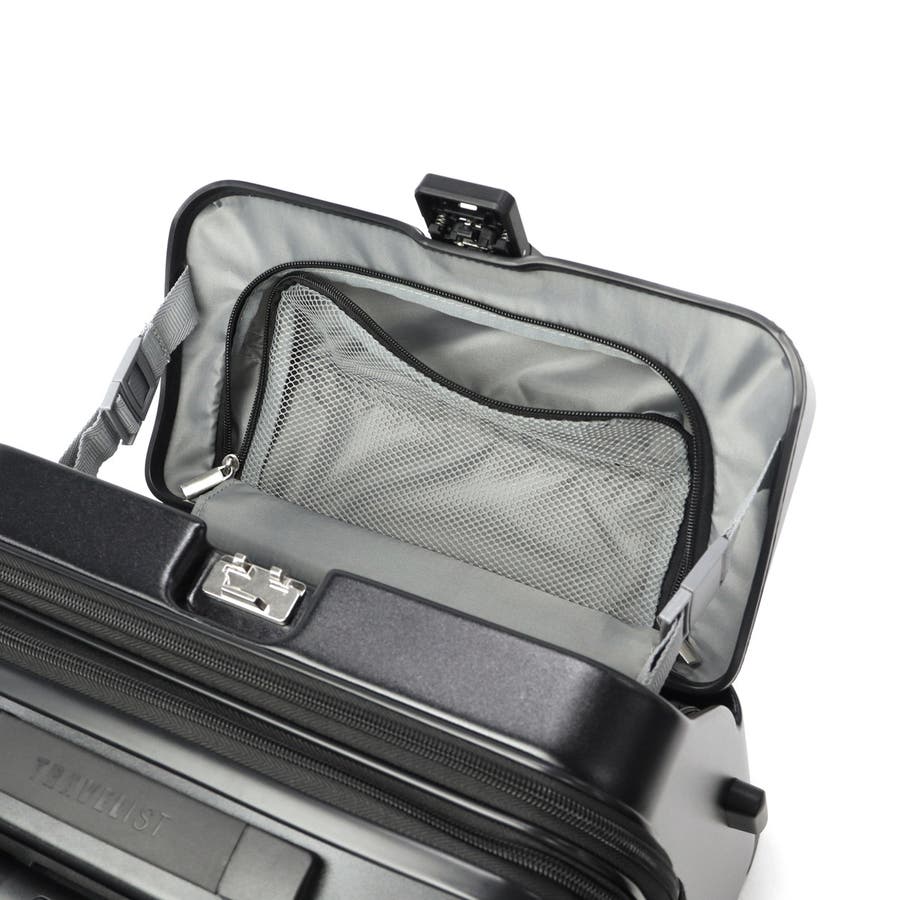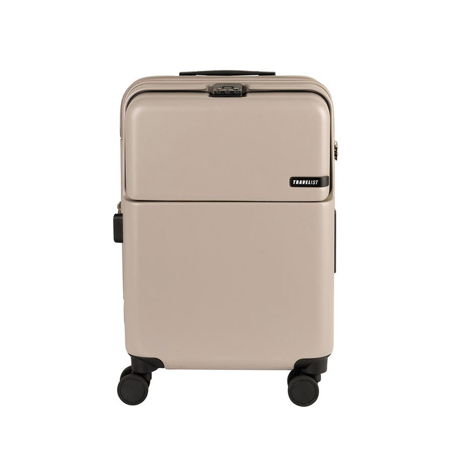 ワンタッチで荷物の出し入れが驚くほどにスムーズに行える、「世界最速1秒アクセス」を実現した『TRAVELIST』のスーツケース。移動中に便利な折り畳み式ドリンクホルダーやスマホスタンド、ちょっとした荷物を掛けられるフックを搭載。車輪はストッパー付きの日乃本社製LisofLisof(ライソフ)SIRENT RUNを使用。三菱ケミカルと共同開発したオリジナルの素材で、静音性に優れています。