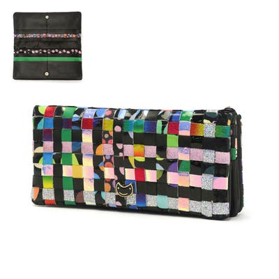 ドットや花柄等、多彩な柄のレザーをメッシュに仕立てた長財布。手元で目を惹くインパクトのあるデザインがツモリチサトらしいアイテムです。フロントの猫ちゃんや、ラインストーンが輝くお花型のファスナー引き手等、細部まで可愛らしいこだわりが詰まったアイテムに仕上がっています。収納部は、パカッと開いて内部が一目で確認できる二つ折りタイプ。紙幣は2ヶ所、カードは計12ヶ所に収まる収納力のあるデザインになっています。また、ファスナー付きの小銭入れにもたっぷりと硬貨がしまえるスペースを確保しているため、安心してお使いいただけます。本体の背面部分には、カードやICカードなどの収納に便利なポケットを装備。メインスペースを開けなくてもサッと取り出す事ができるので、ちょっとしたお会計の際もスムーズに対応することができます。
