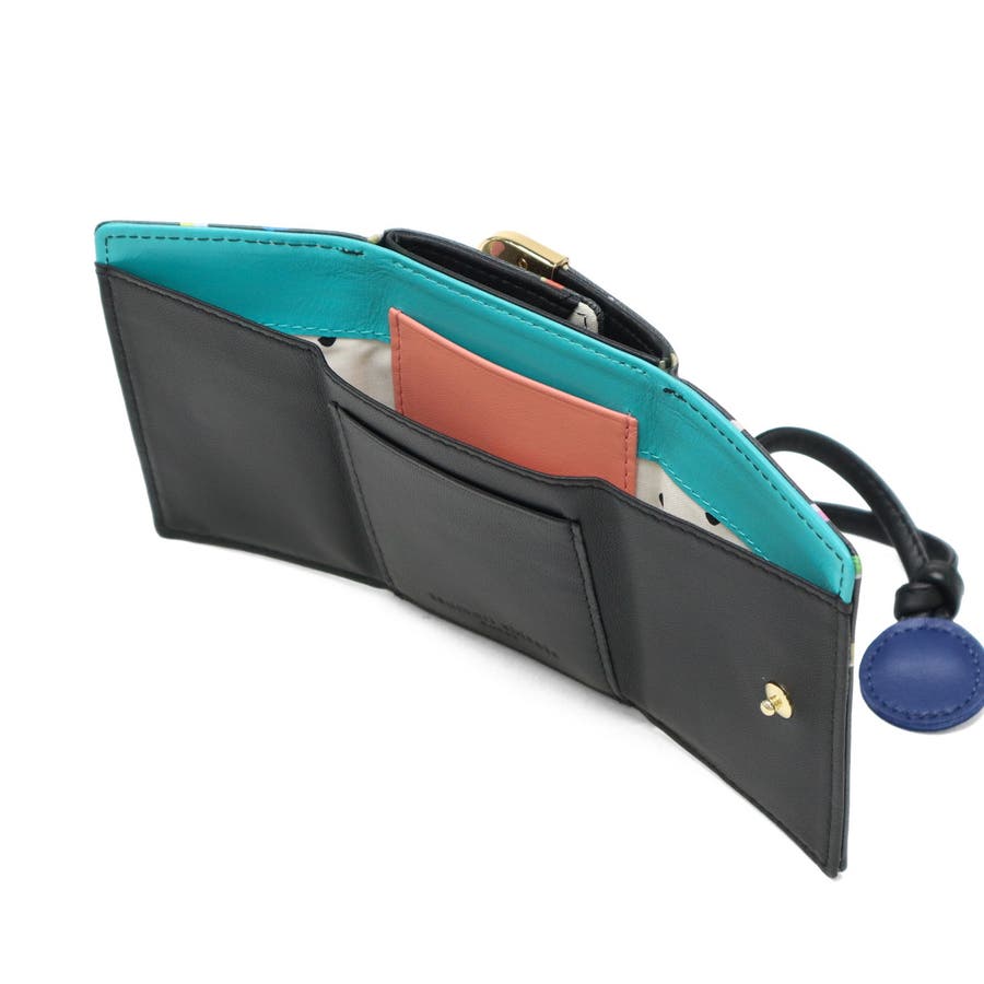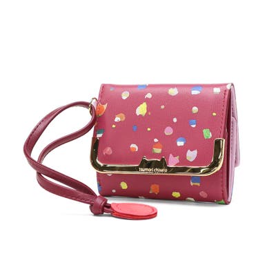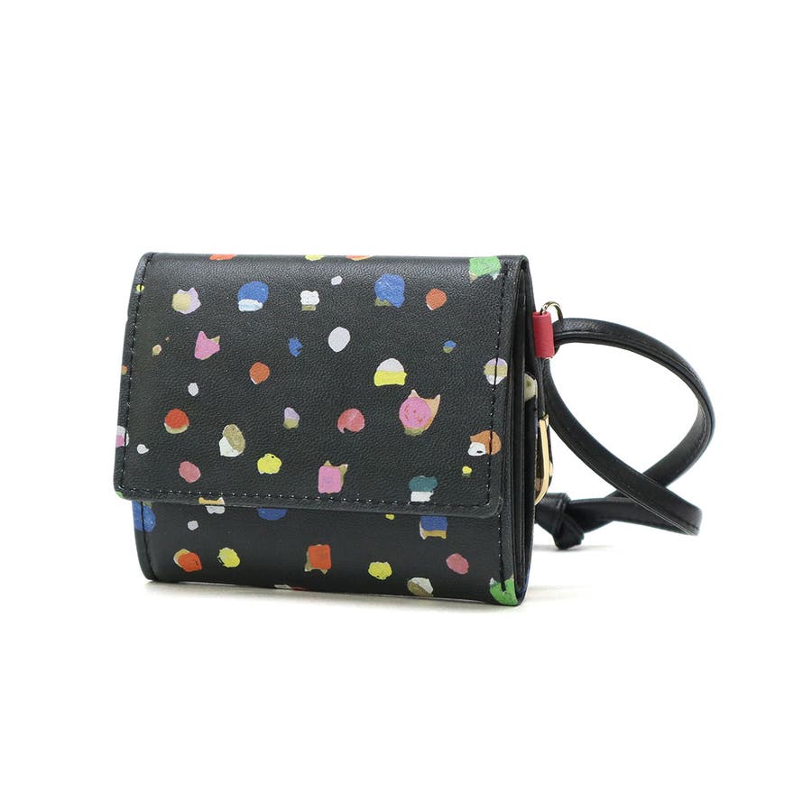 絵筆で“てんてん”と描いたようなドット柄が印象的なシリーズ。よく見ると猫顔に見えてくるシルエットと、愛らしい金具がポイントです。こちらは、コンパクトながらも使いやすいBOX型小銭入れを備えた三つ折り財布。さっとお出かけできる便利なストラップ付きです。