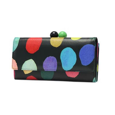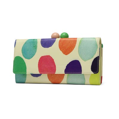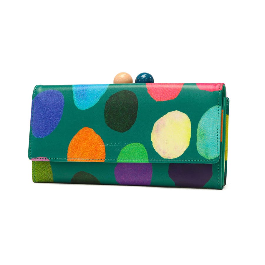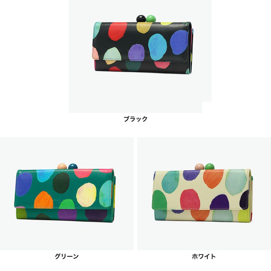 大きくカラフルな水玉模様が目を引く、ポップで可愛らしいがま口付きの長財布。丸い口金がアクセントの、鮮やかな色使いと遊び心あふれるデザインが魅力です。手に取るたび気持ちも明るくなるアイテムで、自分用にはもちろん、ギフトにもぴったりです。