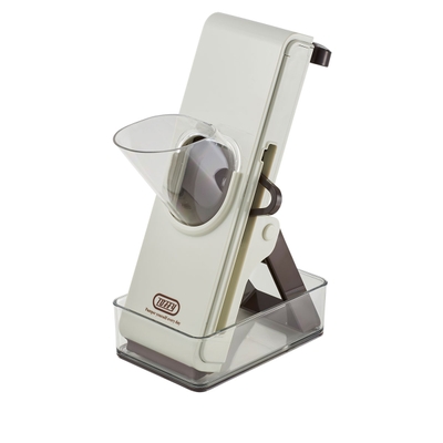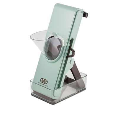 簡単操作で時間のかかる下ごしらえ時間を、短縮してくれるスライサーです。ブランドらしいカラーリングとレトロな雰囲気で出しっぱなしが可愛いアイテムです。使用頻度の高いスライサーなので気分も上がるデザインは嬉しいポイントになりますね!本体には3種類のカッターパーツが付属。2㎜と4㎜の厚みが変えられる平切り、細切り、千切りの3パターンとなっております。全て包丁でやるには大変だな、というレシピにも挑戦しやすくなりそうです。お料理に合わせてカッターパーツを本体にセットし、食材を投入、あとはハンドルを押すだけで均一に食材をスライスできます。付属されているプッシャーを使用することで、細かな食材もケガの心配なくスライス可能です。スライスしていくことで小さくなる食材も、最後までスライスできストレスなく使用していただけます。付属の容器の中でスライスし、すぐに使用しない場合や、余ってしまった時にはそのまま保存が可能。洗い物が増えないのも細かなポイントですね。
