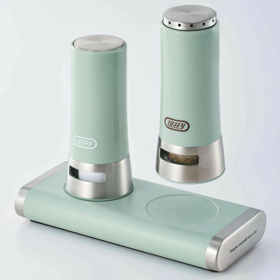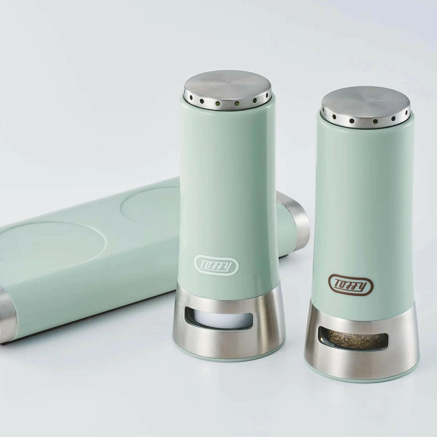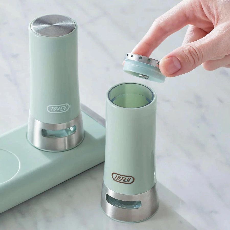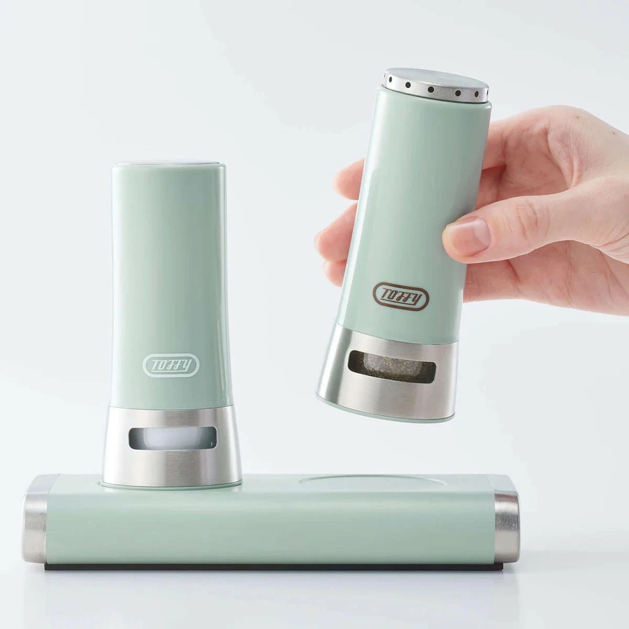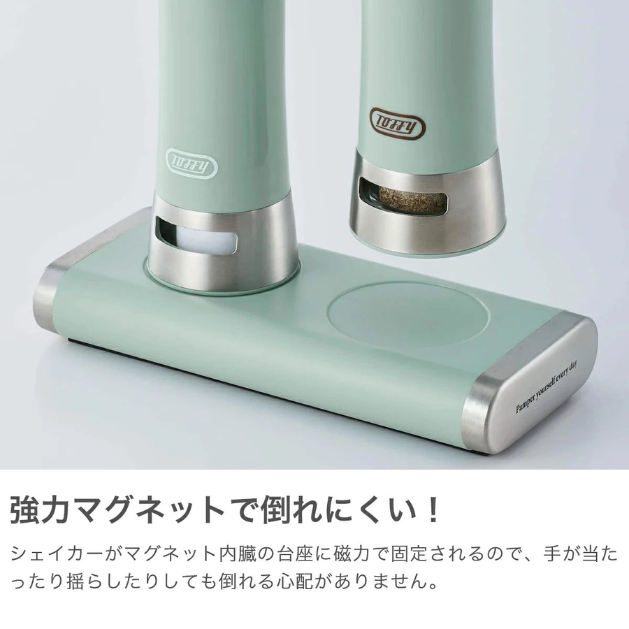 | コンパクトで機能的! 便利なシェイカー コンパクトなサイズ感が使いやすいソルト&ペッパーシェイカー。台座から持ち上げると調味料の出口穴が飛び出す機能的なデザインで、ほこりや湿気を防ぎます!マグネット式の台座で倒れにくく、調味料がこぼれにくいのもポイントです。 |