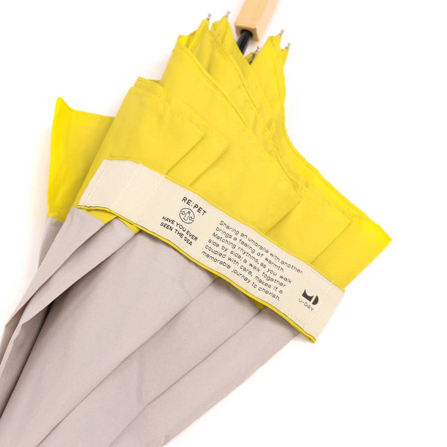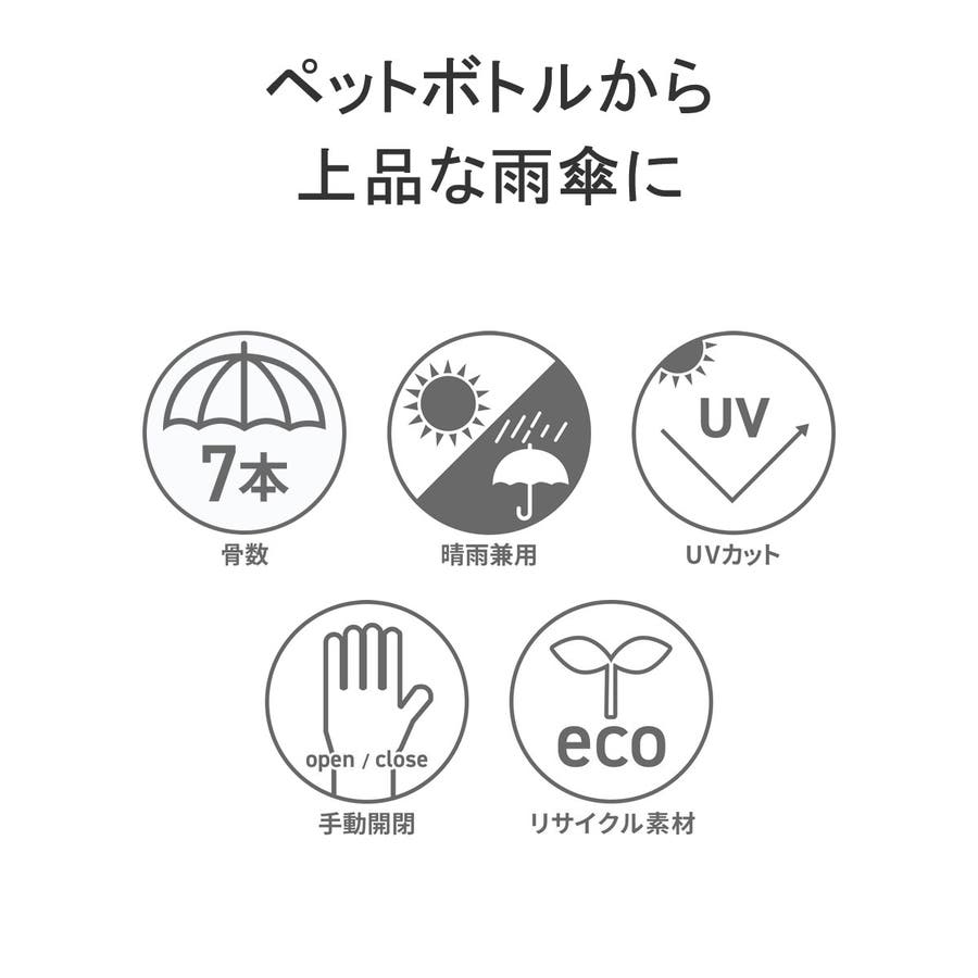 廃棄ペットボトルを素材に使用したサスティナブルなシリーズ『RE:PET』。3本の廃ペットボトルが、地球にやさしい1本の傘に生まれ変わっています。こちらの長傘は、普段使いしやすいシンプルなデザインでありながら、気分を明るくするバイカラー仕様。性別や年齢、晴れの日、雨の日問わず活躍してくれます。