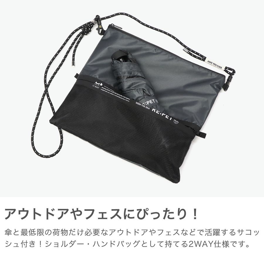1本の傘を作るために3本の廃ペットボトルをアップサイクルし、100%再生生地で完成した折り畳み傘です、雨の日も晴れの日も快適に使える機能性に加え、受骨が曲がることで正面からの風を受け流す構造により、風が強い日の使用も安心。サコッシュ付きで、年齢や性別問わず選べるシンプルなデザイン性も魅力です。
