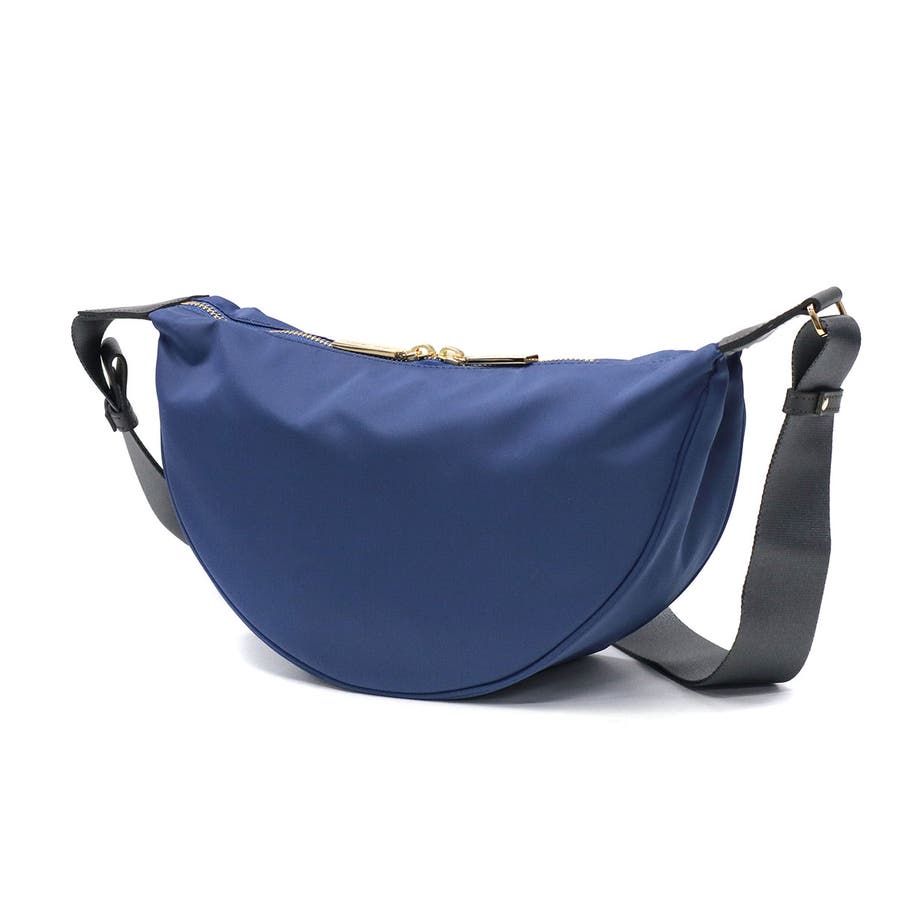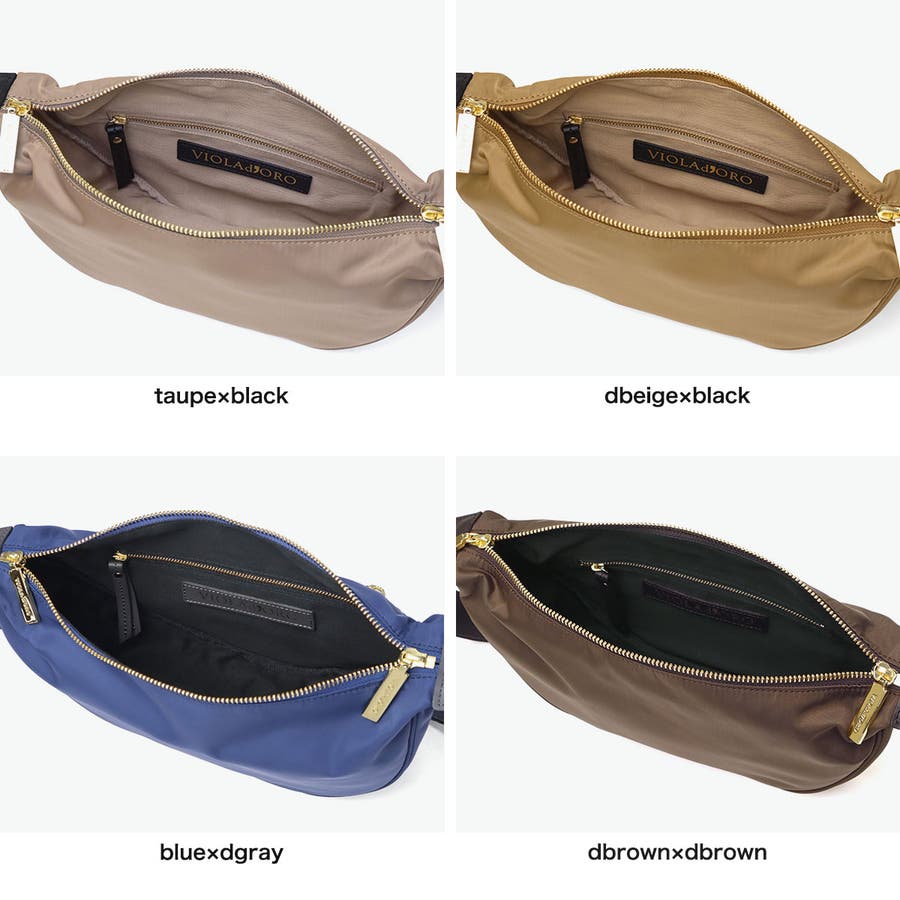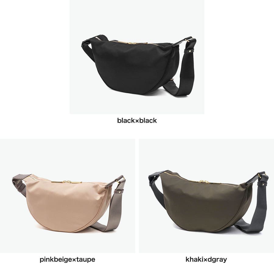 弱撥水性のあるカジュアルなナイロン素材に金具のゴールド使いが女性らしいボディバッグ。500mlペットボトルが収まるコンパクトサイズながら、デイリーから旅行まで活躍します。大人の女性にふさわしい上品なデザインが魅力です。