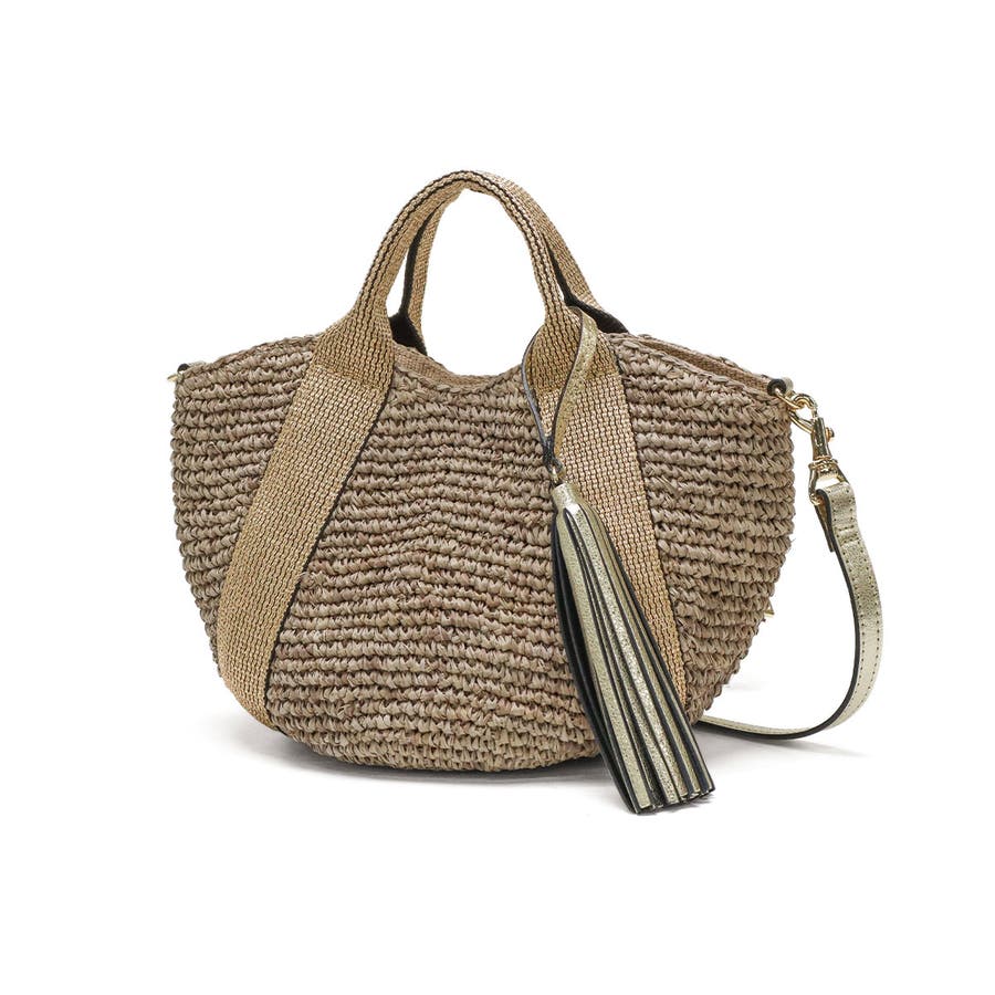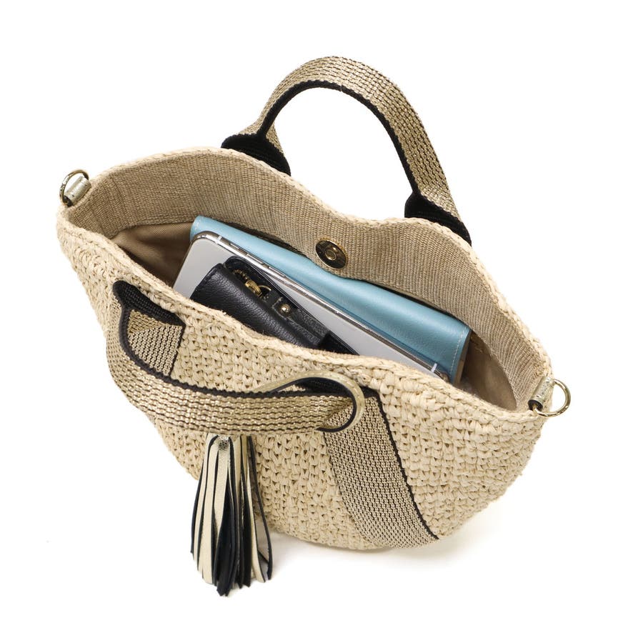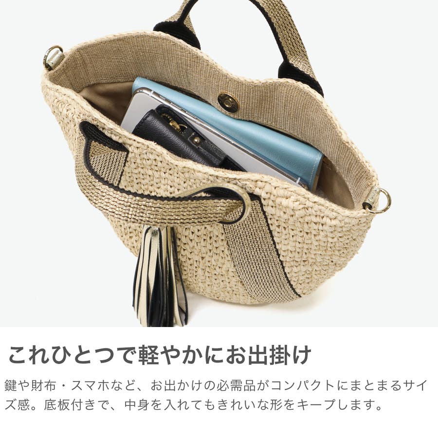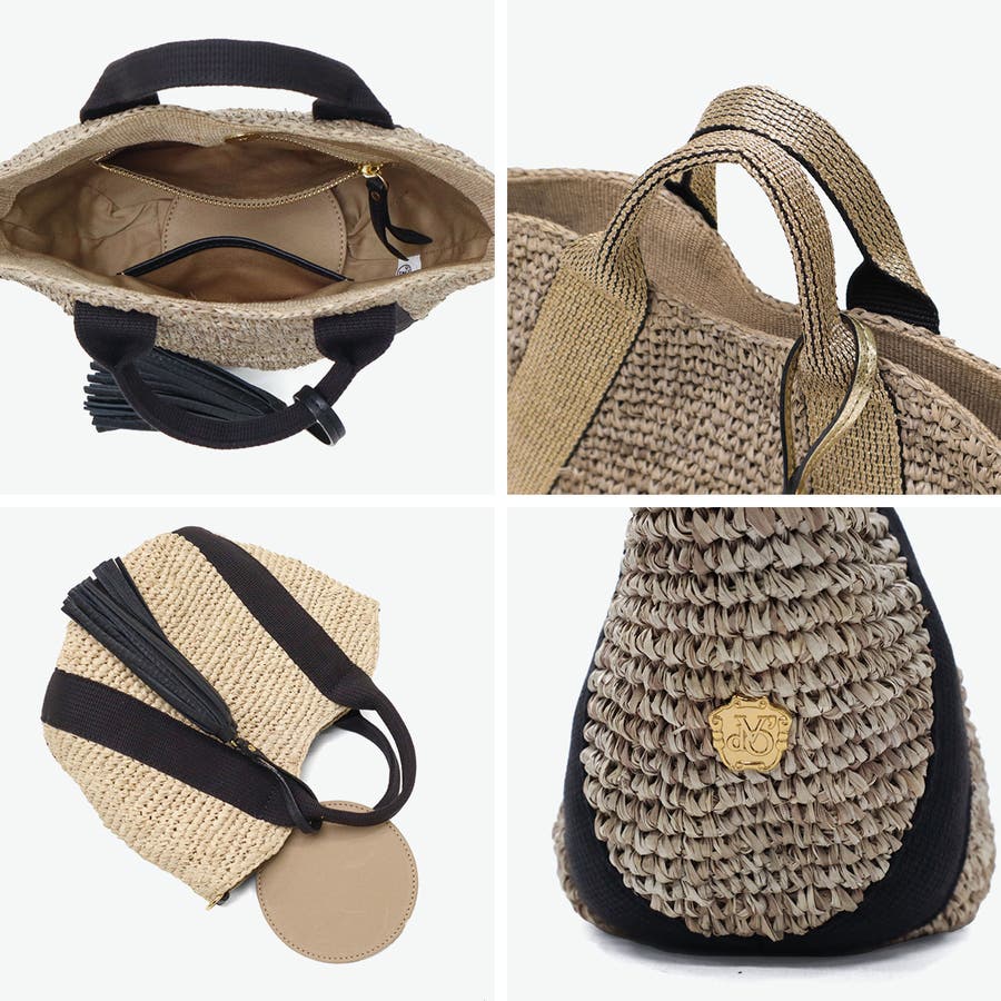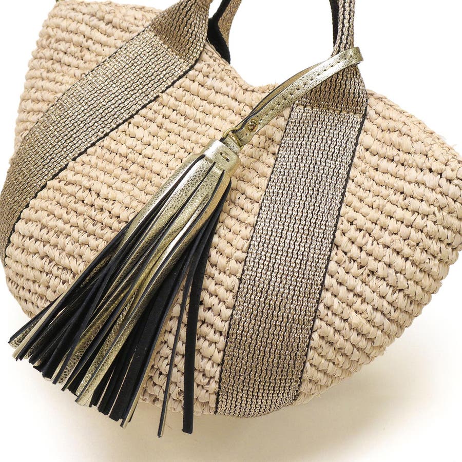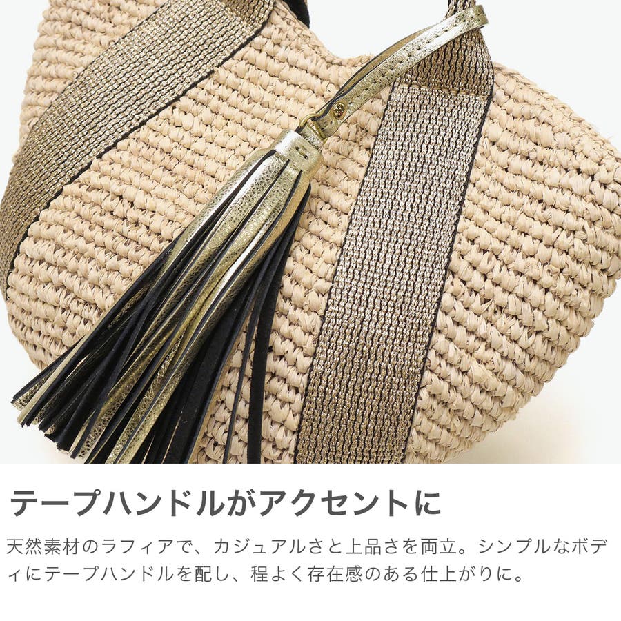 ラフィアで編み上げたボディにテープのハンドルがアクセントになったカゴバッグ。コロンと丸いフォルムと上品に揺れるタッセルが魅力的です。天然素材のカジュアル感がありながらも上品でフェミニンな印象なので幅広いシーンでお使いいただけます。