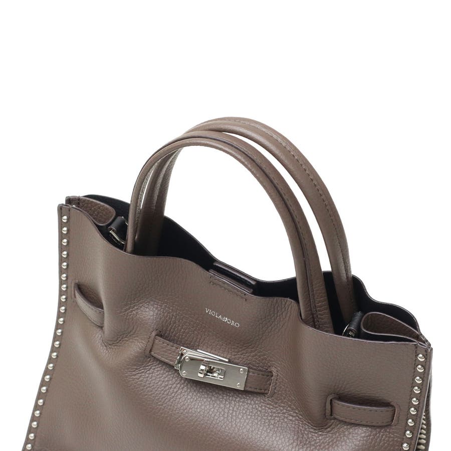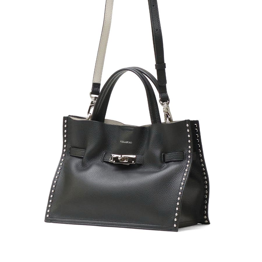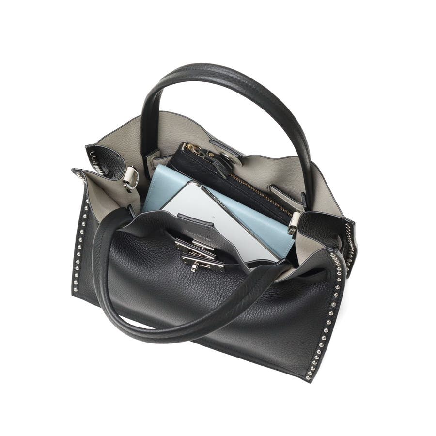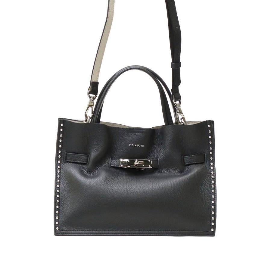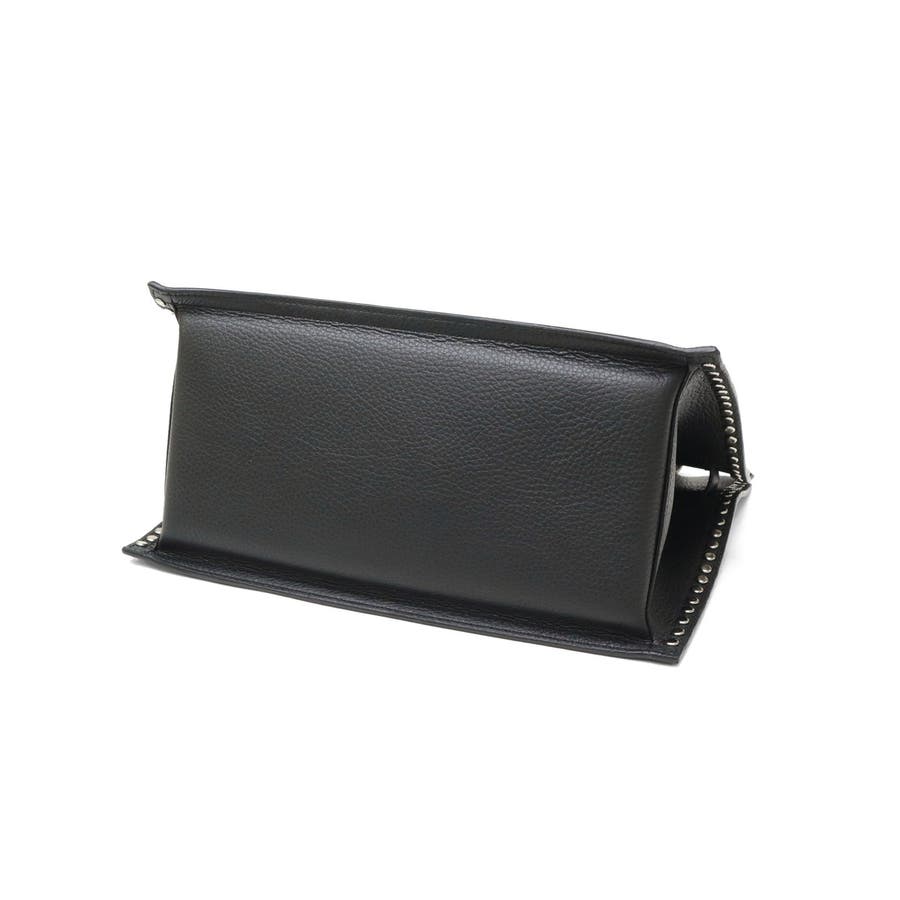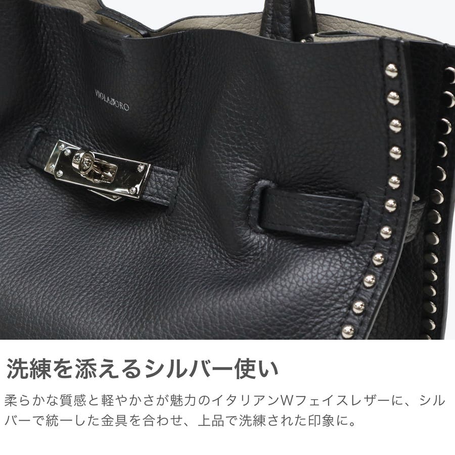 スタッズを効かせたベルト付きトートバッグのMサイズ。全てシルバーの金具を使っているのもポイントで、ボディにはソフトな質感と軽さが特徴のイタリアンWフェイスレザーを使用しています。付属のショルダーストラップを使用することで、斜めがけができる2WAY仕様となっておりシーンに合わせて使い分けできるアイテムです。