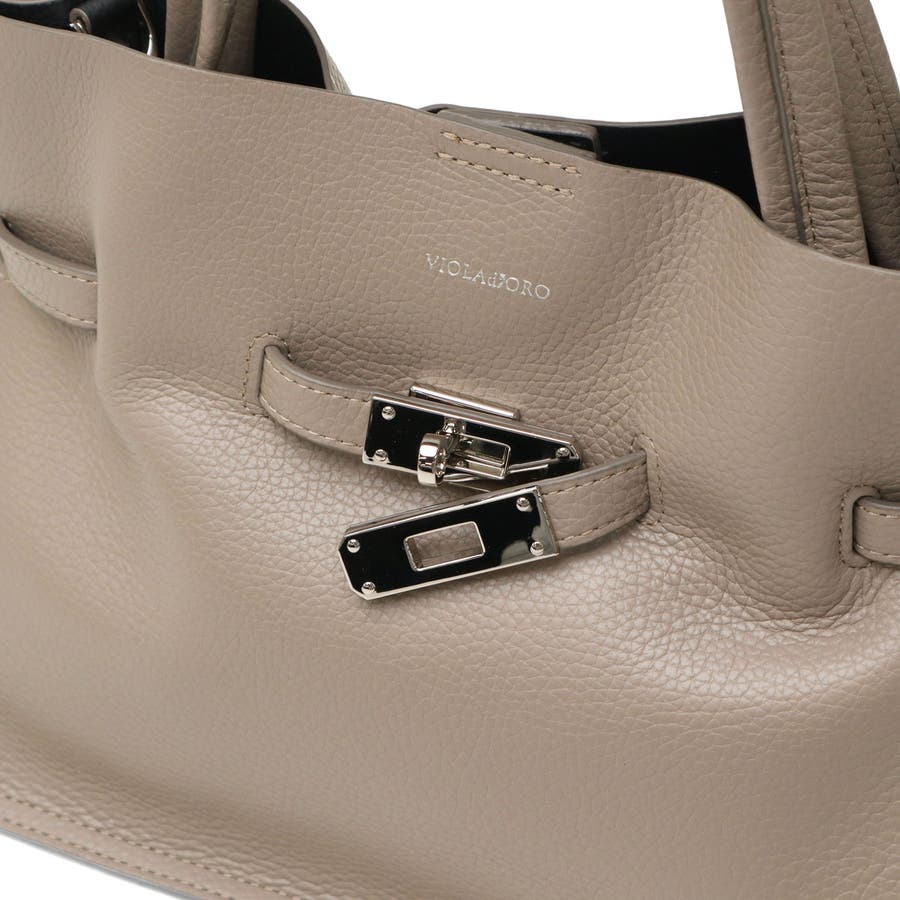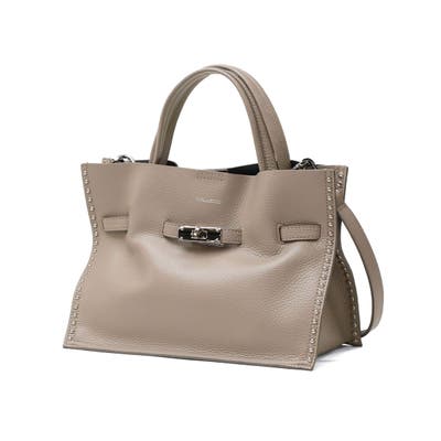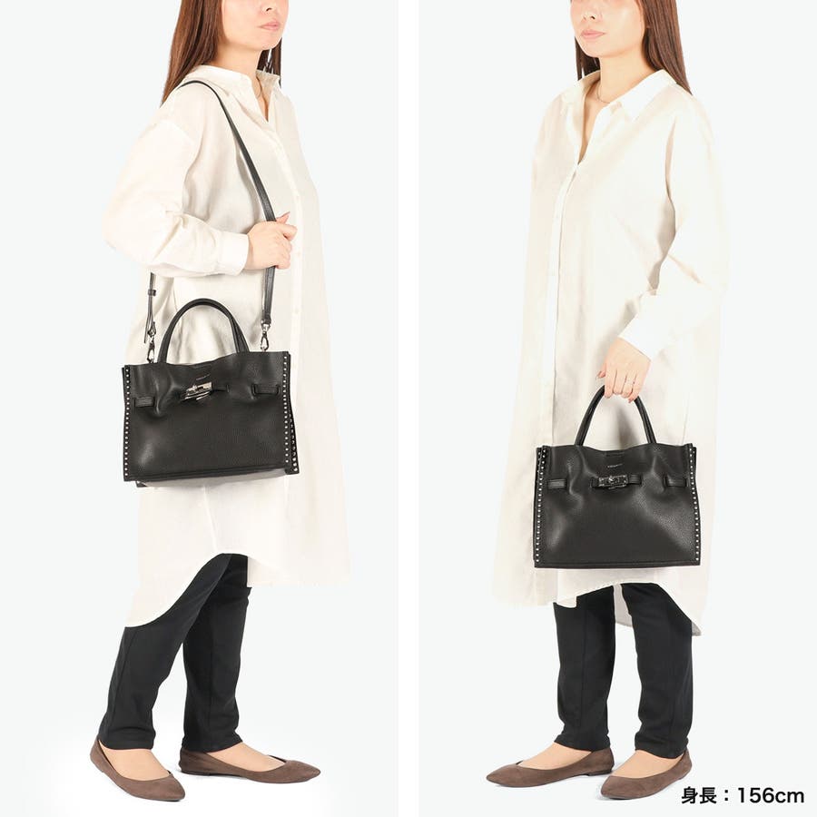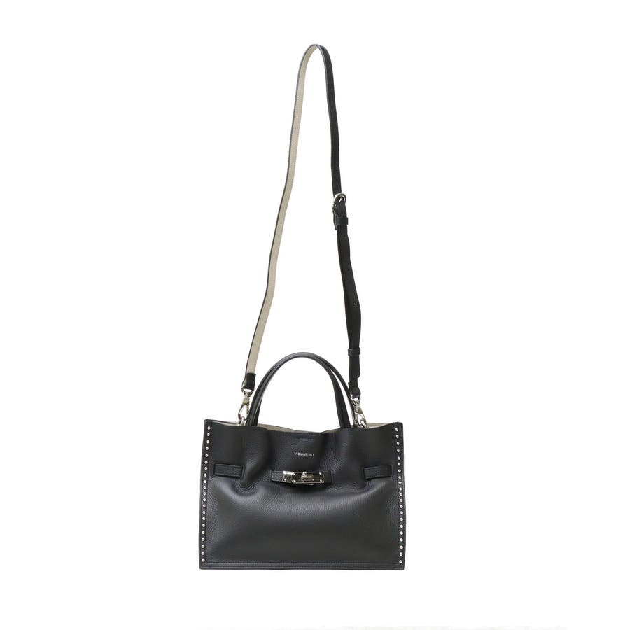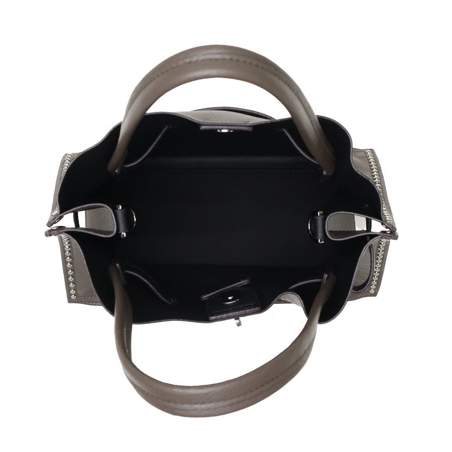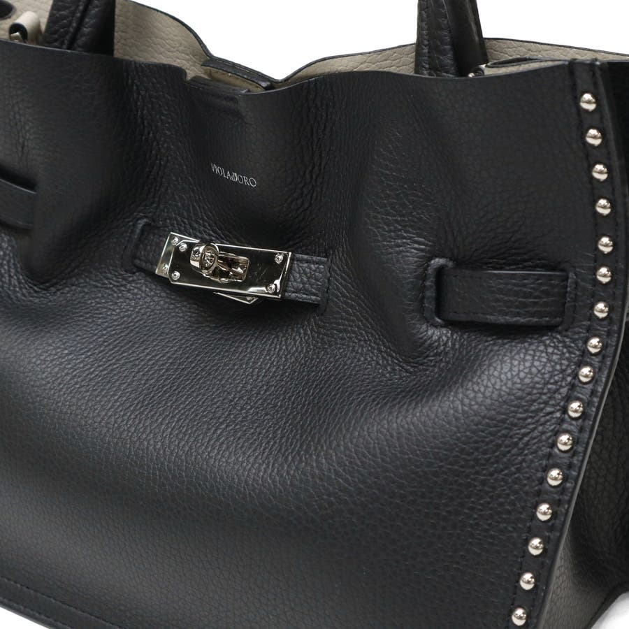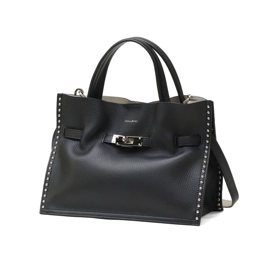 スタッズを効かせたベルト付きトートバッグのMサイズ。全てシルバーの金具を使っているのもポイントで、ボディにはソフトな質感と軽さが特徴のイタリアンWフェイスレザーを使用しています。付属のショルダーストラップを使用することで、斜めがけができる2WAY仕様となっておりシーンに合わせて使い分けできるアイテムです。
