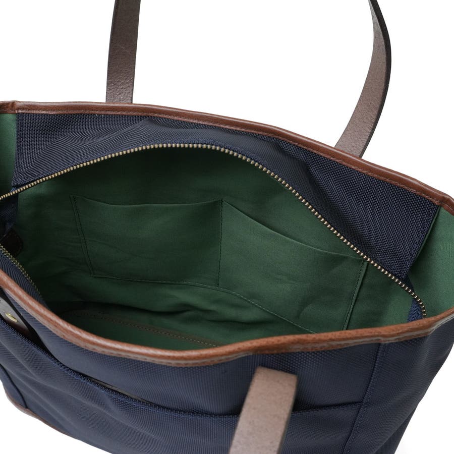 オン・オフを問わず使える汎用性を備えながら、素材選びと細部のサイジングにまで配慮した上質なトートバッグ。ビジネスシーンにも日常使いにも自然に溶け込みます。バリスターナイロンと本革を組み合わせた日本製仕様で、A4対応のファスナー付き収納を装備。無駄を削ぎ落とした洗練された佇まいが、持つ人の品格をさりげなく引き立てます。
