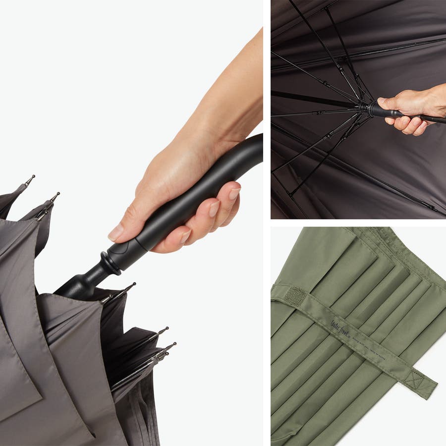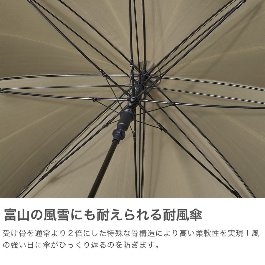 富山の過酷な風雪にも耐える傘として誕生した『富山サンダー』の親骨70cmの大型傘です。通常2段しかないスライダーを3段に増やした特殊な骨構造により、高い柔軟性と反り返りづらさを実現。高い撥水性能はもちろんのこと、晴れの日でも使える紫外線カット加工付で機能的なアイテムとなっています。