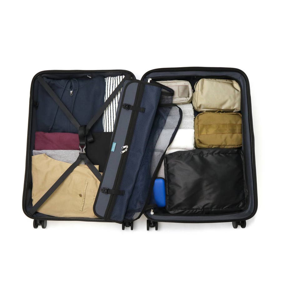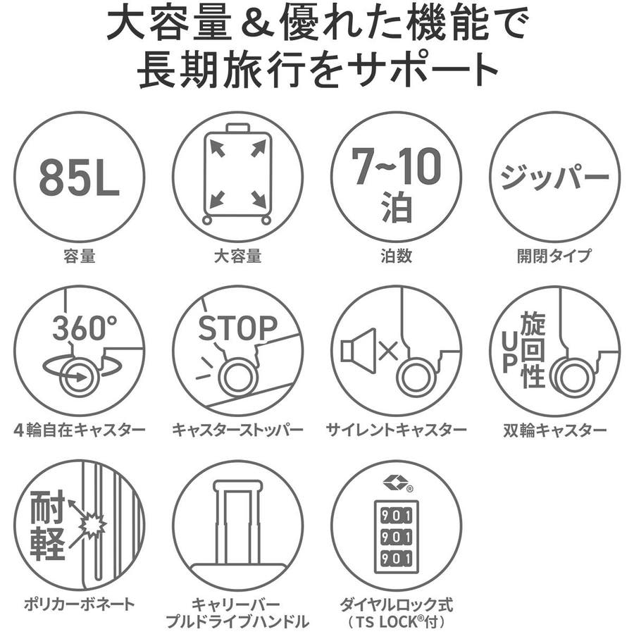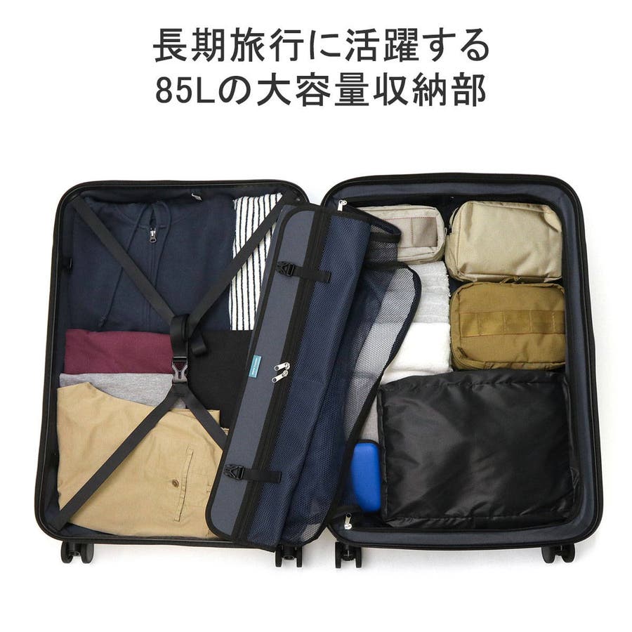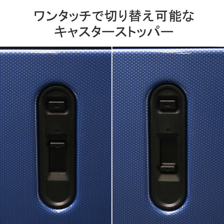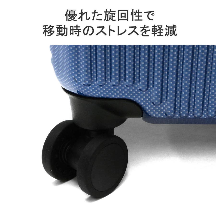 縦リブにカーボン柄を施したシャープなデザインが特徴の『ボトムベイ』シリーズ。収納部は7~10泊程度の長期旅行に適した大容量のサイズ感となっており、荷崩れしにくいシンプルな内装に仕上がっています。静音双輪キャスターを採用し、静かで安定した走行を実現。また背面にはワンタッチで操作できるキャスターストッパーを装備し、電車や坂道での不意な移動を防止します。その他、TSAロック、耐衝撃性に優れたポリカーボネートをボディに使用するなど、実用的な機能を抑えた設計が魅力です。
