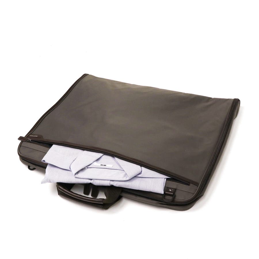 ビジネスシーンにマッチするシンプルなデザインの2WAYガーメントバッグ。出張や冠婚葬祭などで活躍する、1つは持っておきたいアイテムです。素材にはナイロンツイルを使用し、しなやかな風合いと程よい光沢感が上品な印象に。軽量かつスリムな設計で、ハンガーが2本付属しているのも嬉しいポイントです。