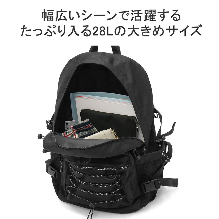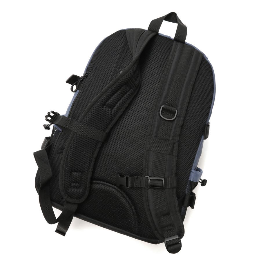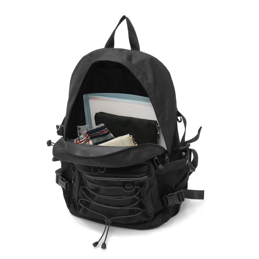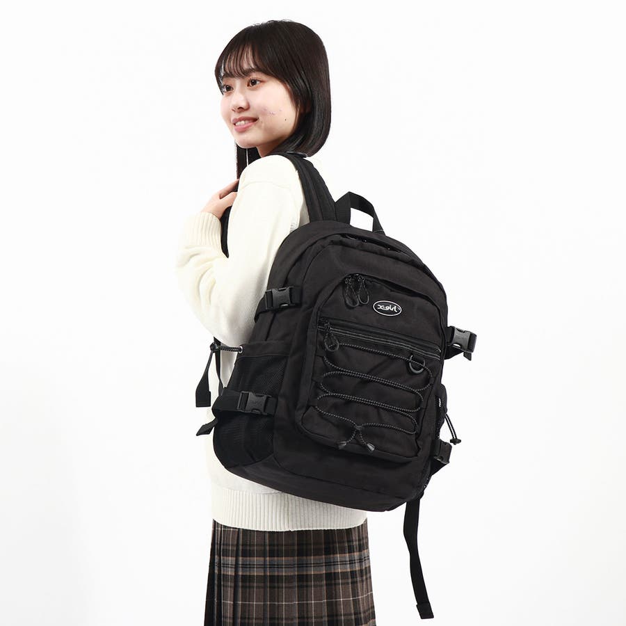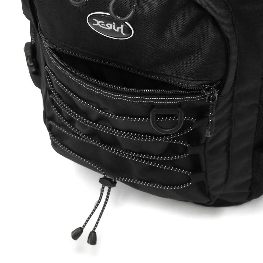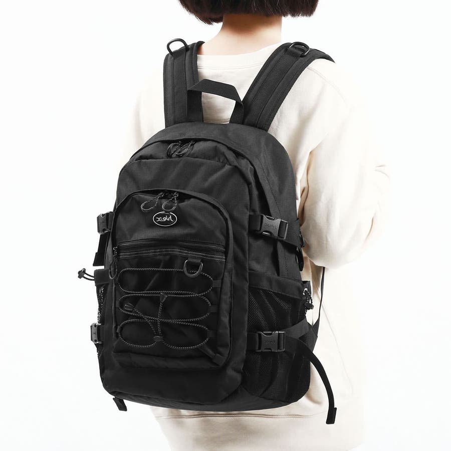 フロントのバンジーコードと、X-girlロゴがアクセントになったバックパック。本体はA4ファイルがゆとりを持って収まるサイズ感で、PCスリーブと中吊りポケットを備えた機能的な設計です。背負ったままサイドから本体内部へアクセスできる便利なジップ付き。アウトスペースにも豊富なポケットを備え、小物類をスッキリと収納できます。28Lの大きめサイズで、デイリーはもちろん、通勤通学や旅行などにも大活躍間違いなしのアイテムです。