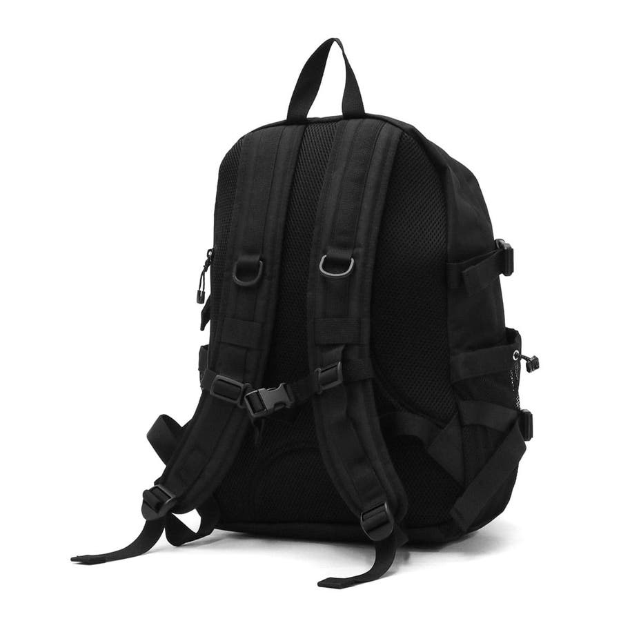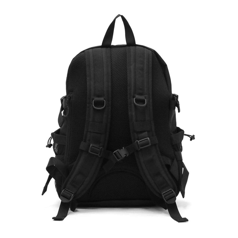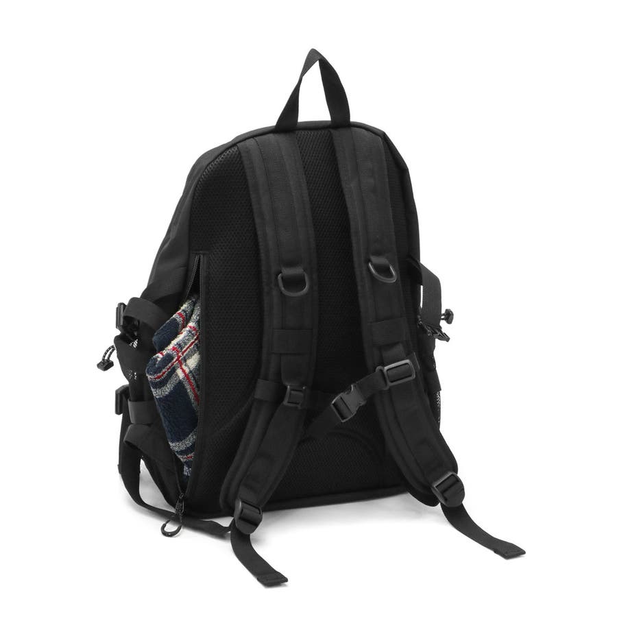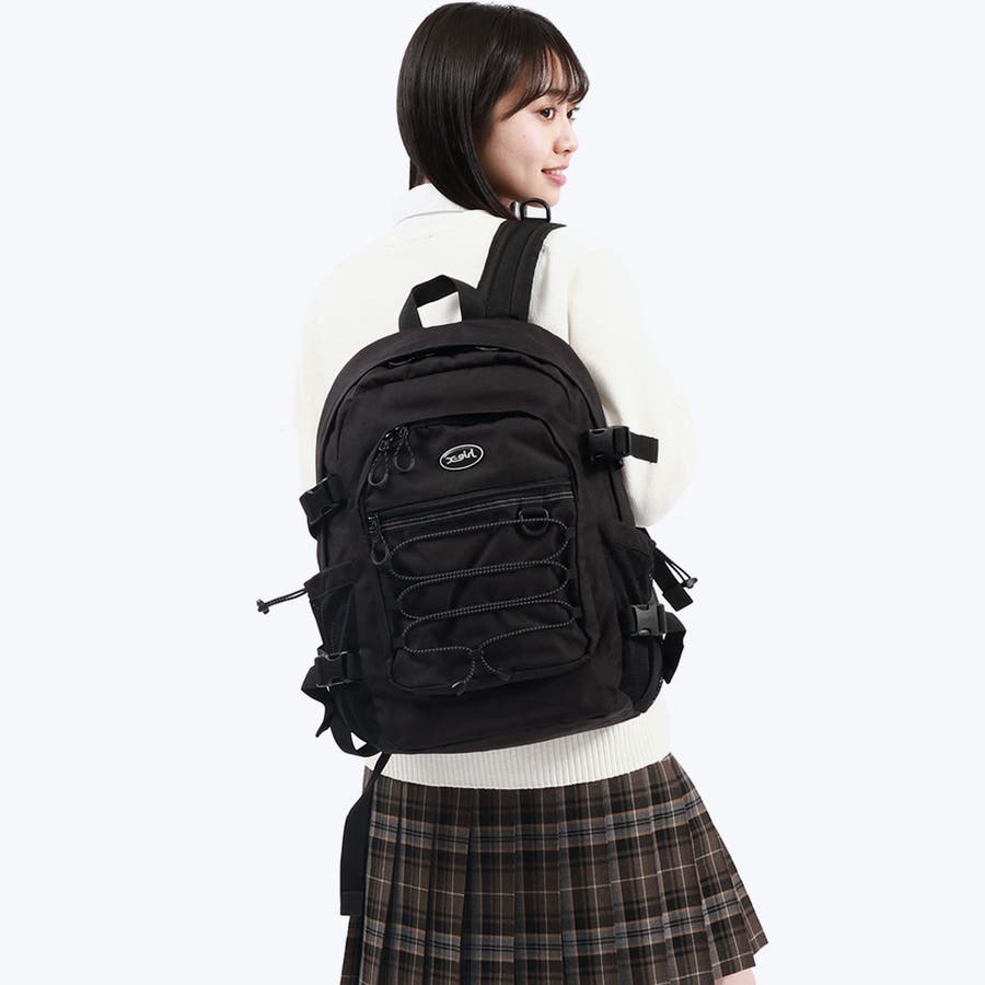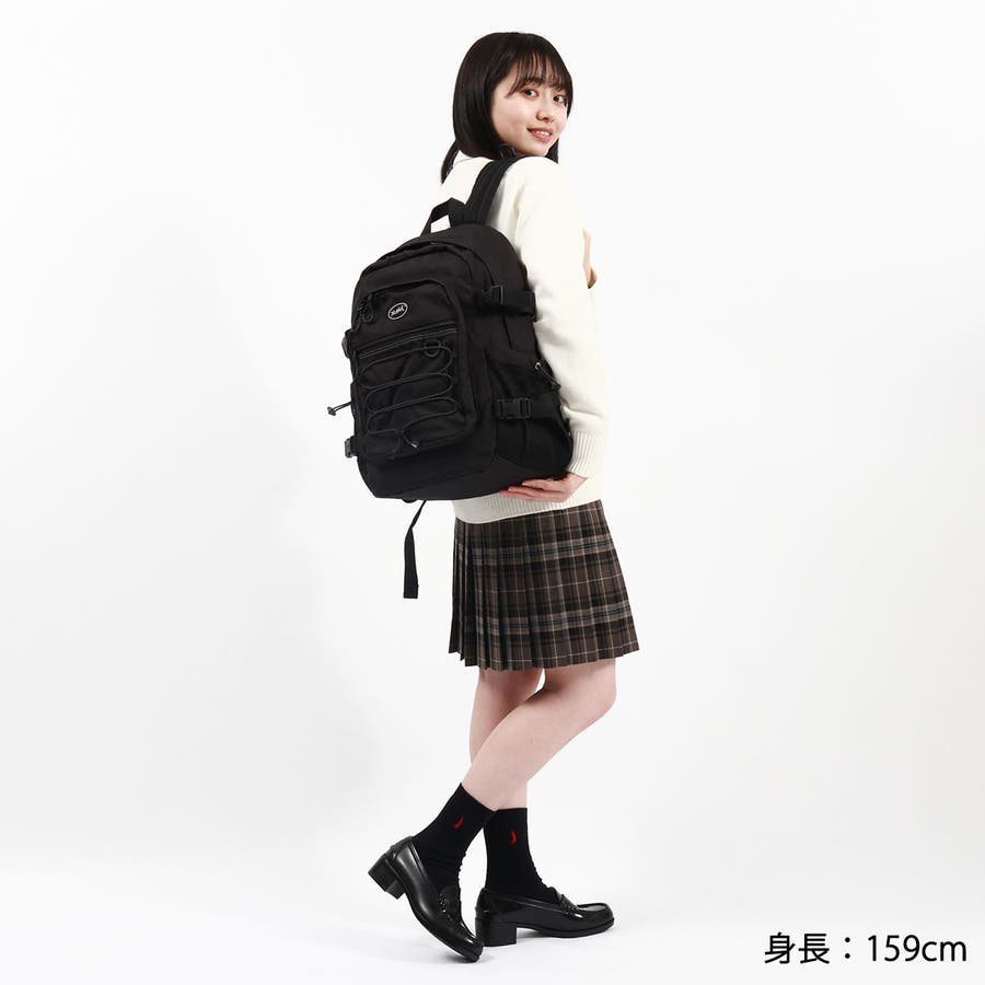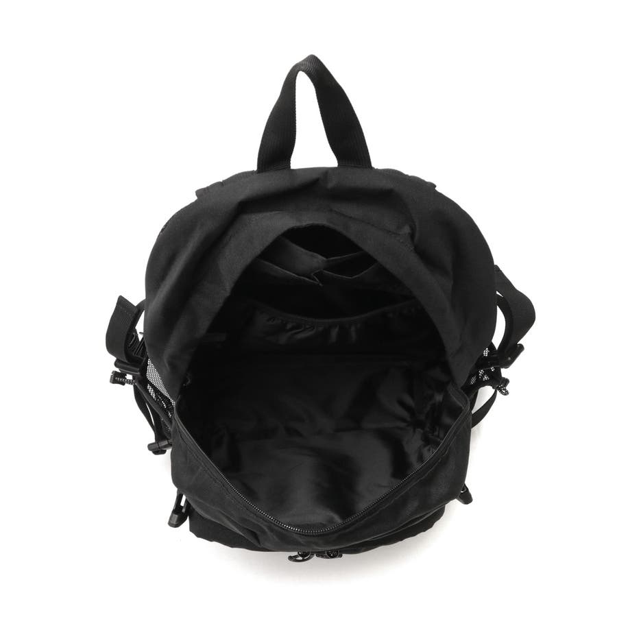 フロントのバンジーコードと、X-girlロゴがアクセントになったバックパック。本体はA4ファイルがゆとりを持って収まるサイズ感で、PCスリーブと中吊りポケットを備えた機能的な設計です。背負ったままサイドから本体内部へアクセスできる便利なジップ付き。アウトスペースにも豊富なポケットを備え、小物類をスッキリと収納できます。28Lの大きめサイズで、デイリーはもちろん、通勤通学や旅行などにも大活躍間違いなしのアイテムです。