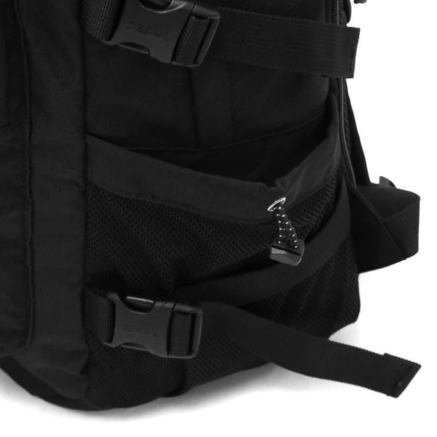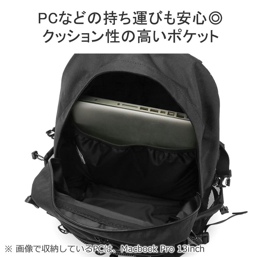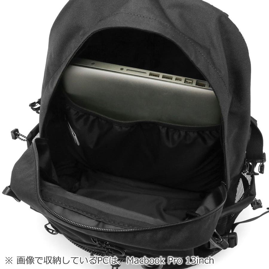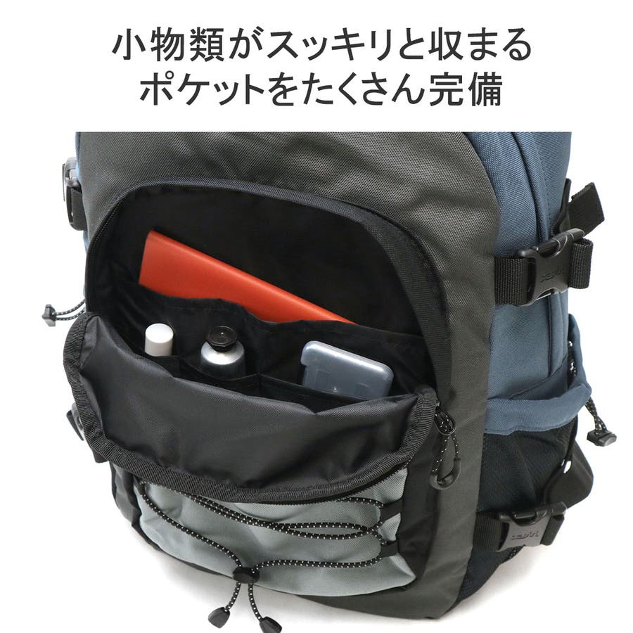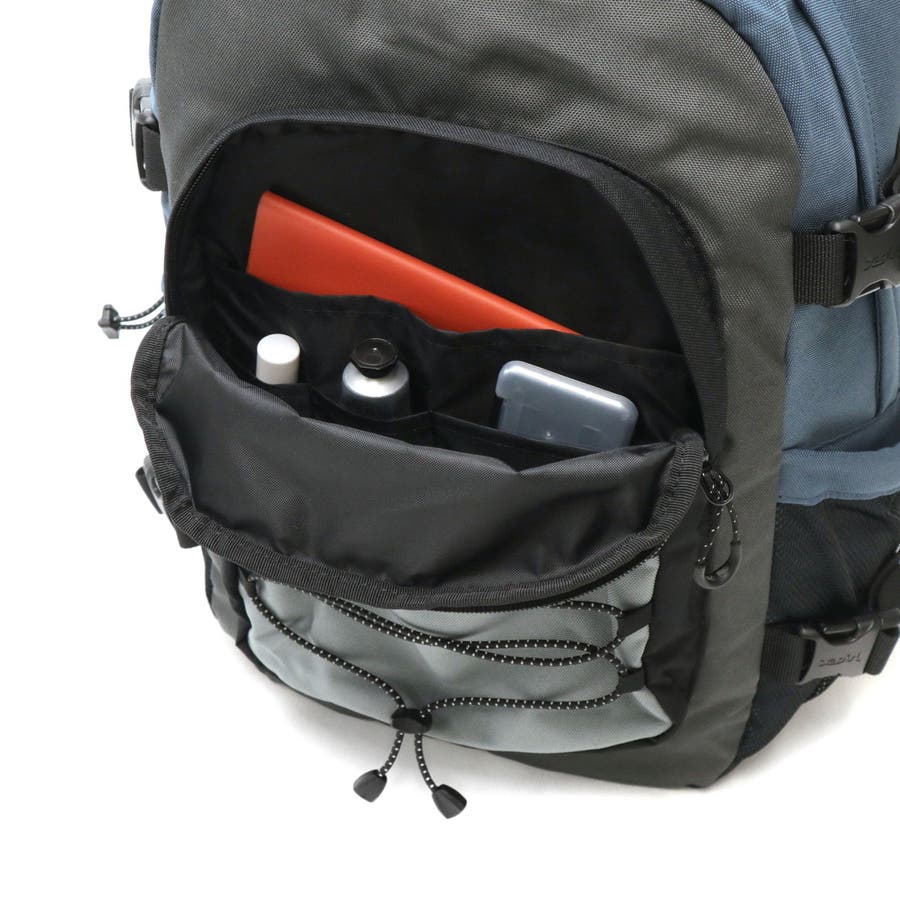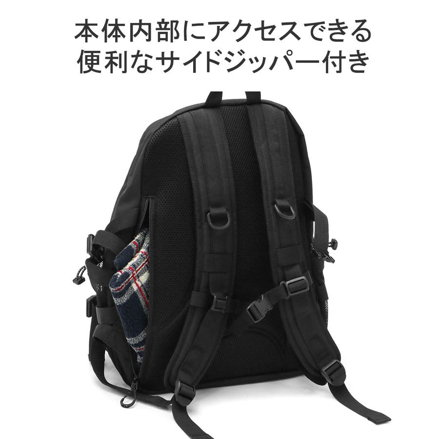 フロントのバンジーコードと、X-girlロゴがアクセントになったバックパック。本体はA4ファイルがゆとりを持って収まるサイズ感で、PCスリーブと中吊りポケットを備えた機能的な設計です。背負ったままサイドから本体内部へアクセスできる便利なジップ付き。アウトスペースにも豊富なポケットを備え、小物類をスッキリと収納できます。28Lの大きめサイズで、デイリーはもちろん、通勤通学や旅行などにも大活躍間違いなしのアイテムです。