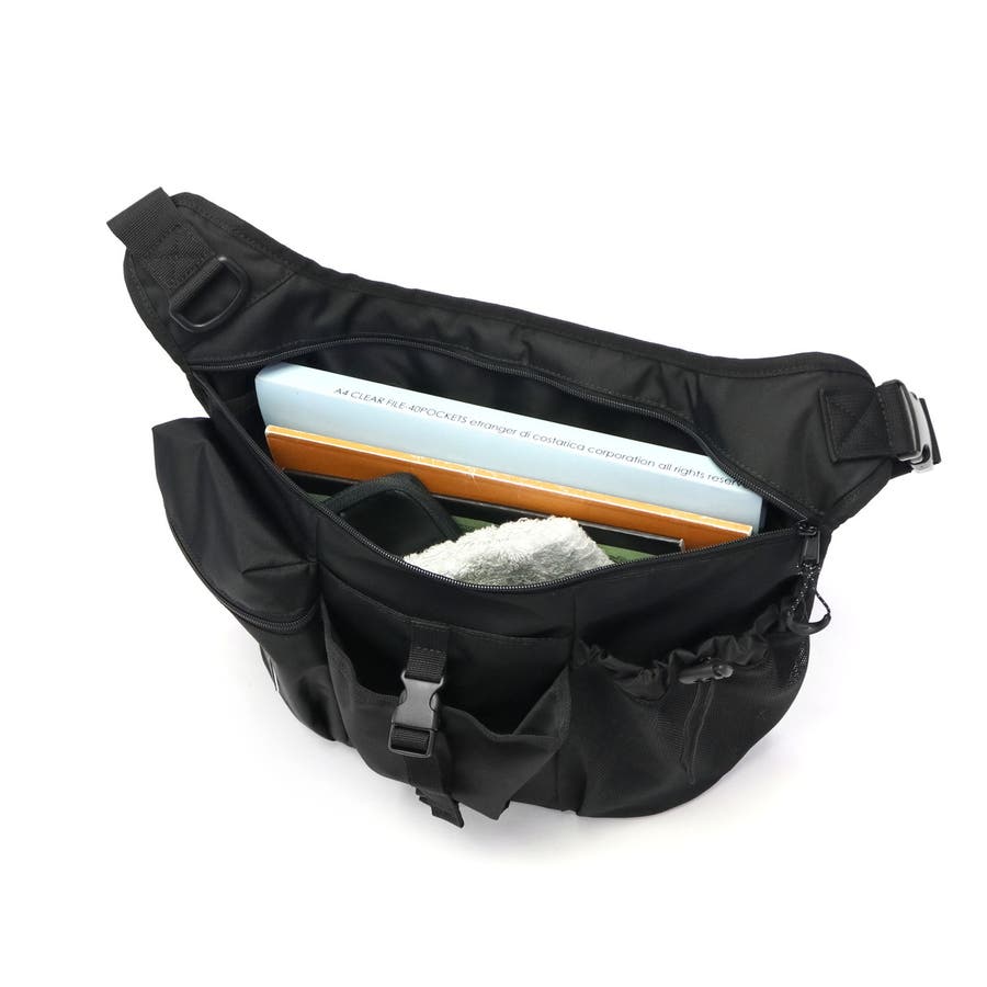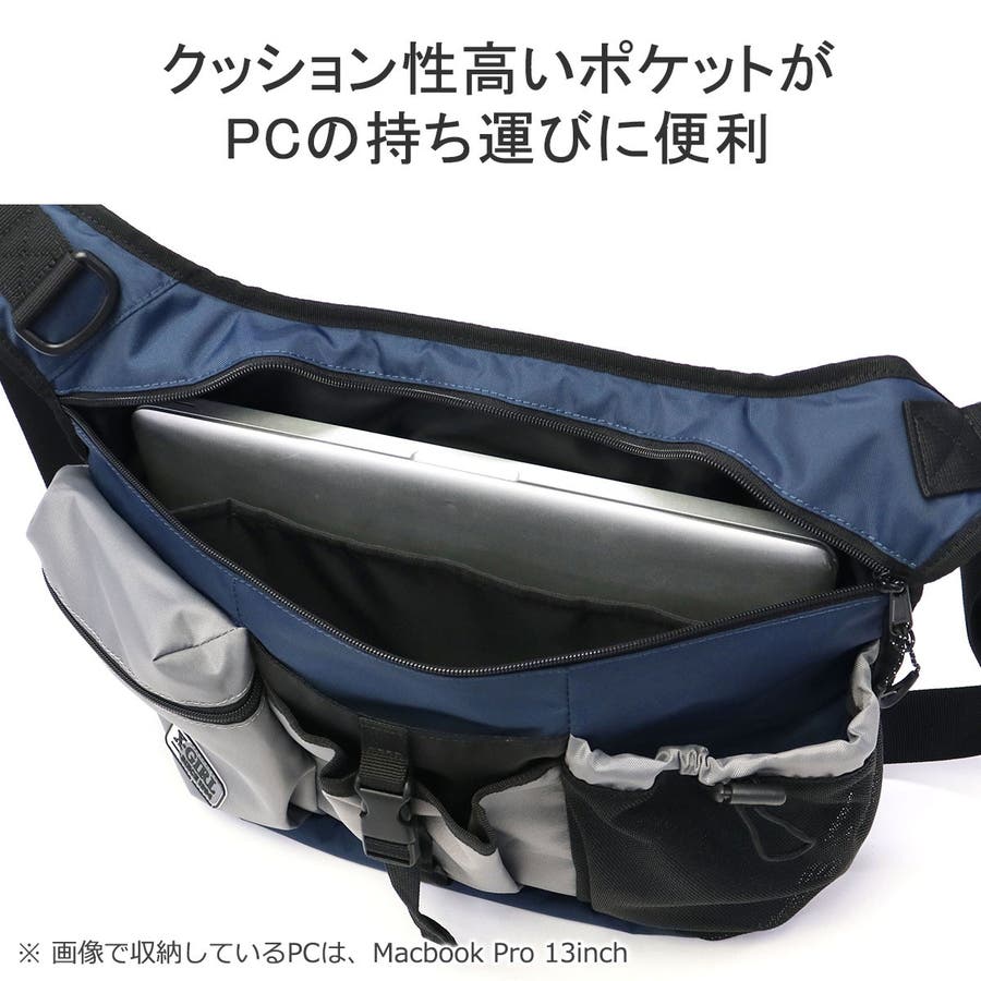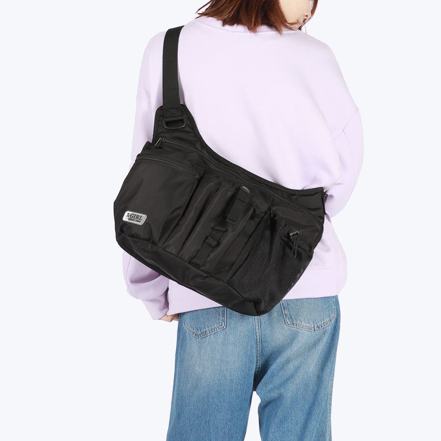 X-girlのラバーロゴとフロントのマルチポケットがアクセントになったショルダーバッグです。広い背面は、暑い日や長時間使用時に嬉しいエアメッシュ仕様。A4対応の収納力あるサイズ感と、通勤通学に最適なPCポケット付きなので、オンオフ問わず幅広いシーンにマッチするアイテムです。