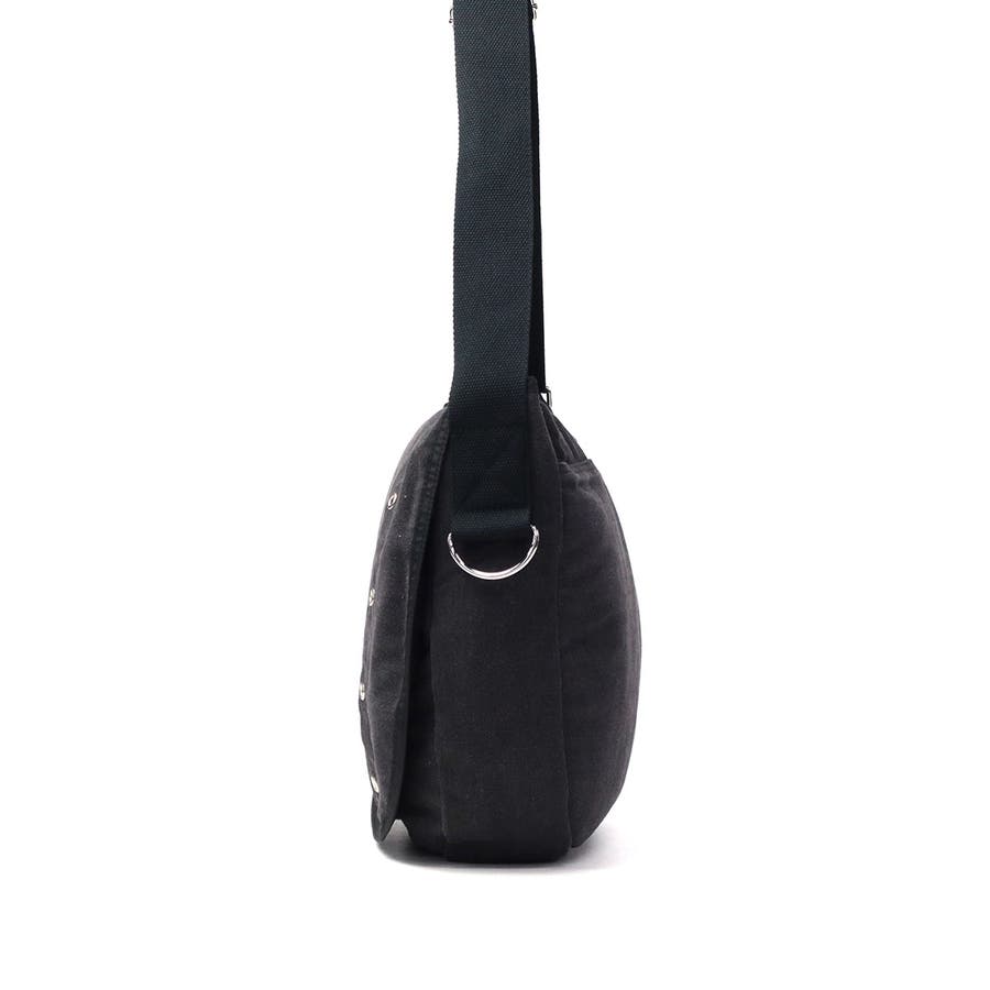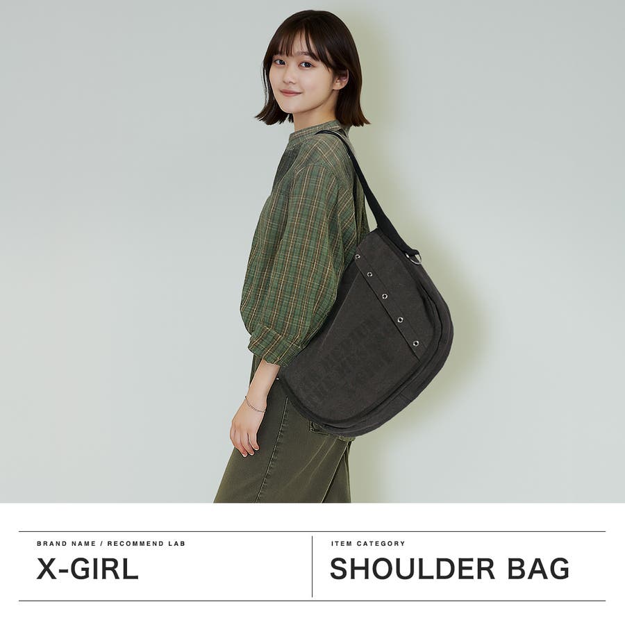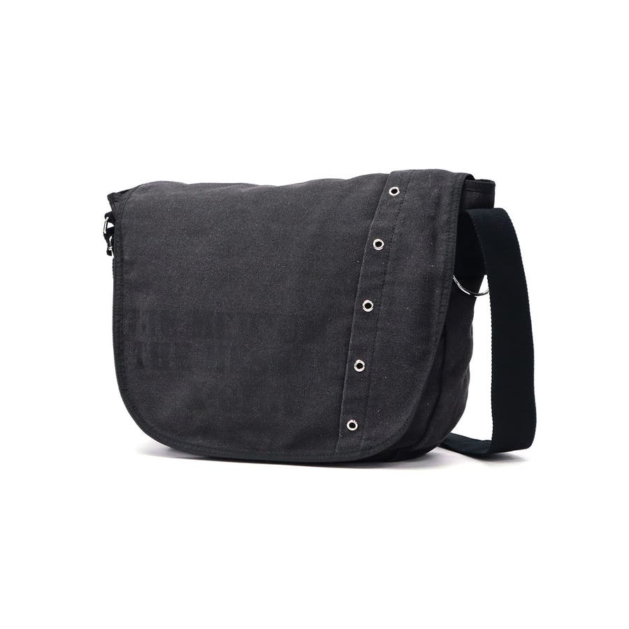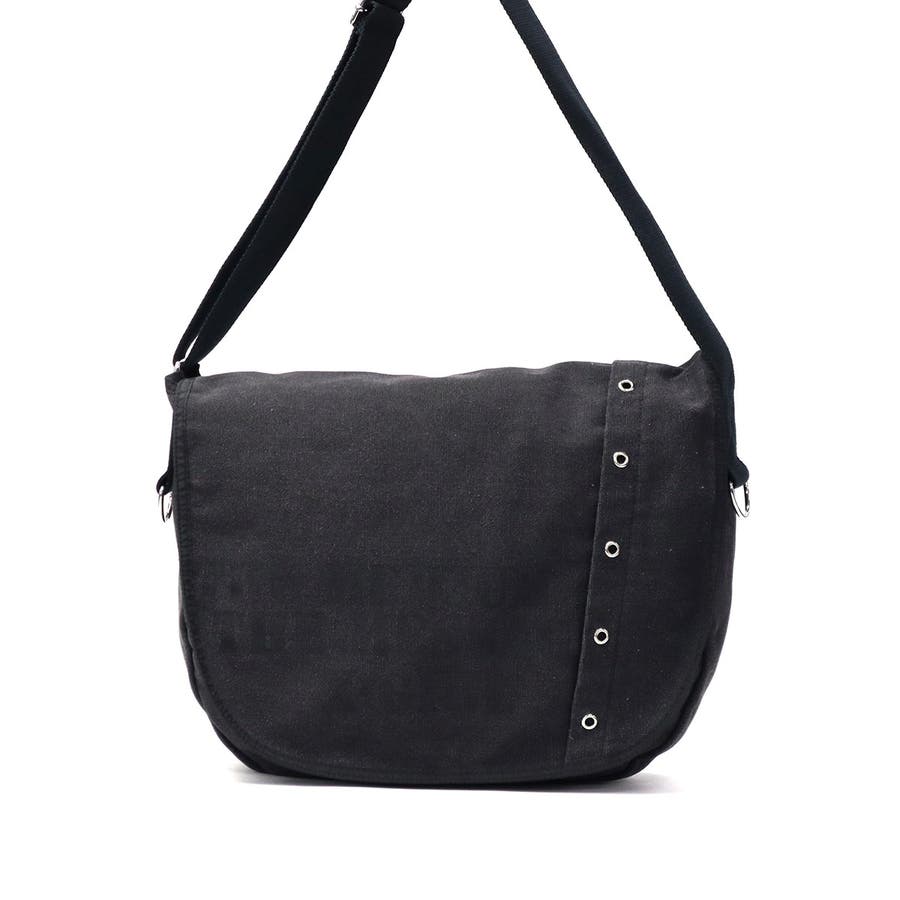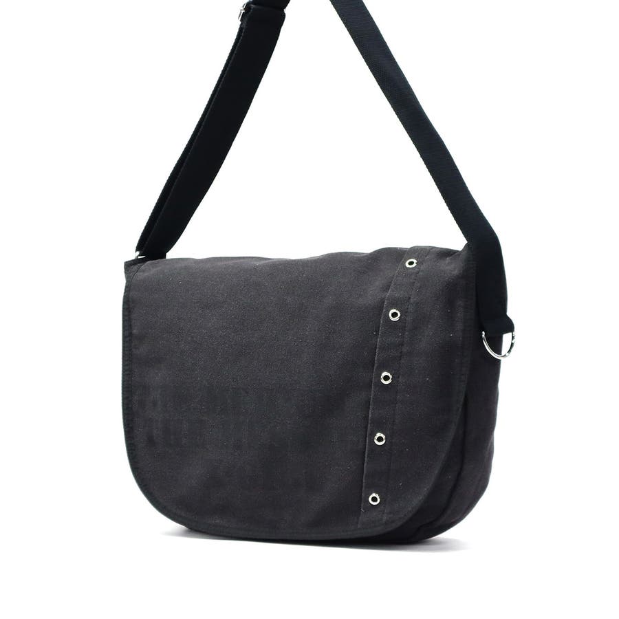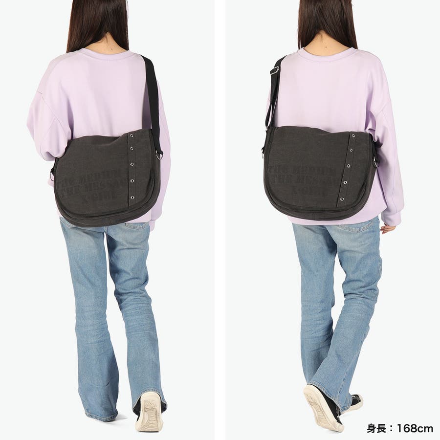 かすれたプリントを施した、ダスティーな印象のショルダーバッグ。ハトメの打ち付けや加工感の風合いが魅力で、ストリートスタイルのアクセントになるアイテムです。大きめサイズで荷物もしっかりと収納できるので、日常からおでかけまで幅広く活躍します。