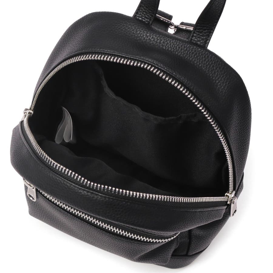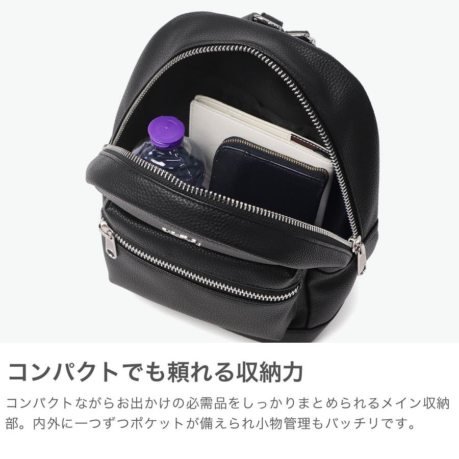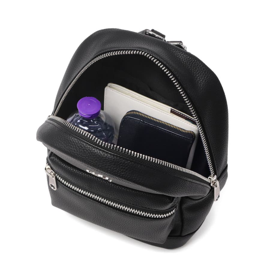 ミニマムなシルエットが可愛らしいフェイクレザーリュック。小さめサイズながら、お財布やペットボトルも収納可能なサイズ感です。どんな服装にも合わせやすいシンプルなデザインでお出かけにもぴったり。開口部はファスナーで大きく開くので、荷物の取り出しもスムーズです。