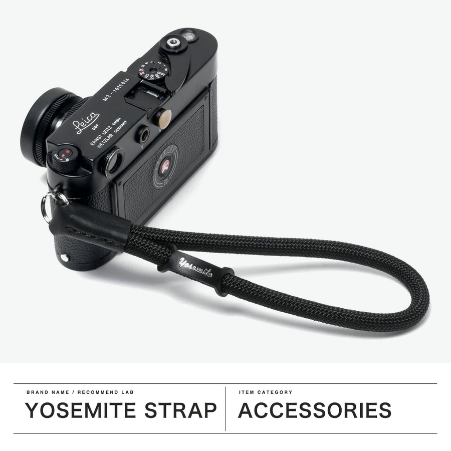 本格クライミングロープを使用した、ストラップハンドル仕様のヨセミテカメラストラップが登場。手首にかけて使用することができ、大切なカメラをタフなロープで守ります。最上級レザーを日本の熟練された職人が丁寧に一本一本縫製しています。レザー製フックパーツも装備し、カラビナ等で露出計やフィルムなどの小物を装着するのに便利です。