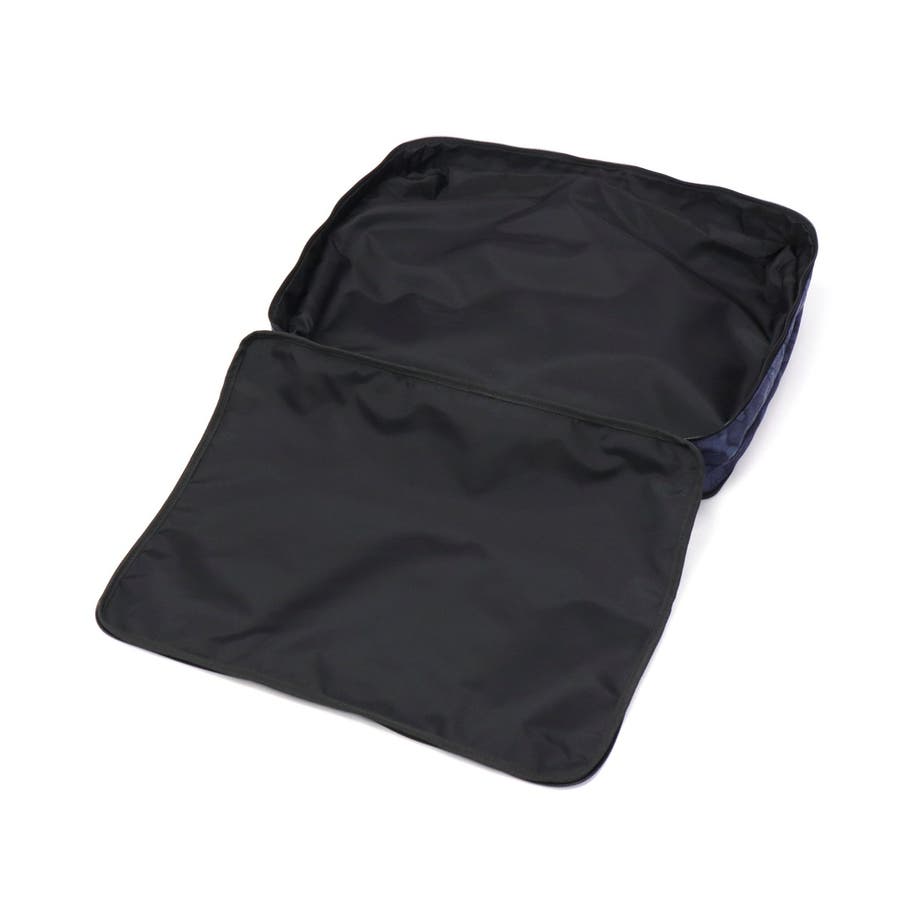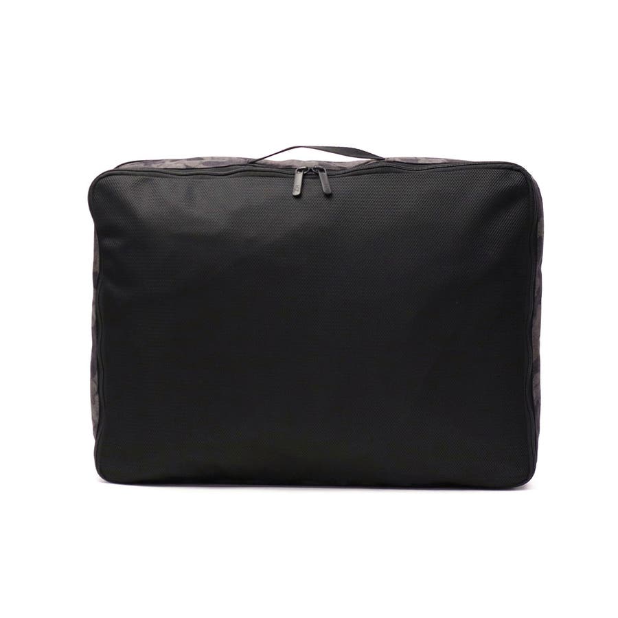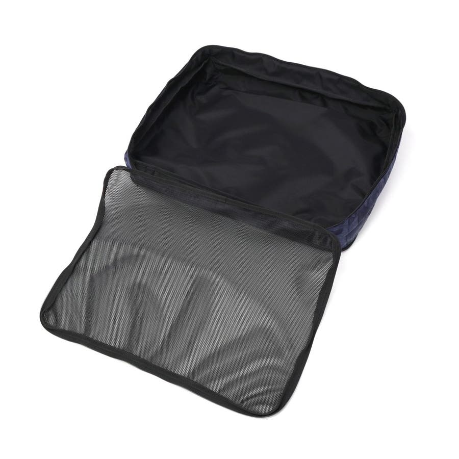 耐久性のあるコーデュラナイロン生地を使用したLサイズパッキングポーチ。長期旅行や荷物が多い方にぴったりなサイズ感で、片面には内部のこもりを防止するメッシュ生地を採用。衣類を未使用と使用済みで分けて収納可能な2気室構造も魅力的なポイントです。旅行時のパッキングアイテムとして、同シリーズで揃えてお使いいただくことも可能となっています。