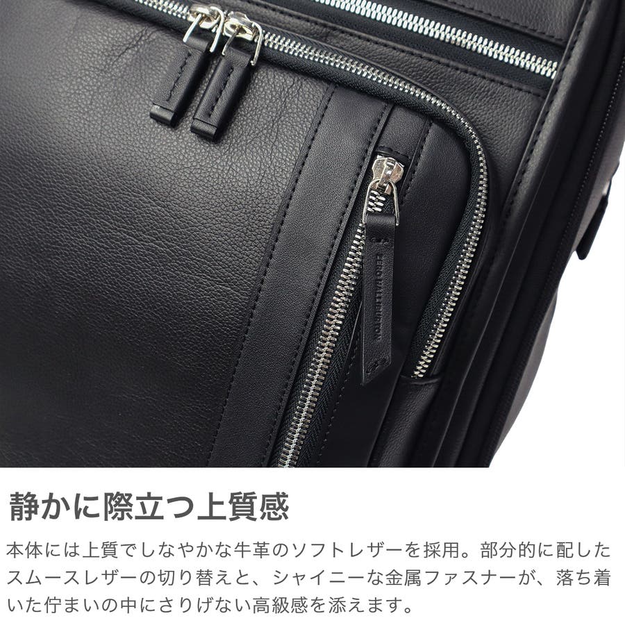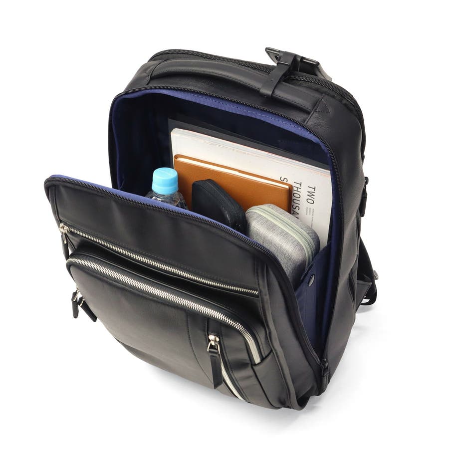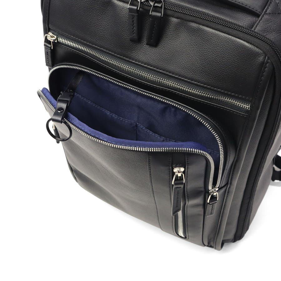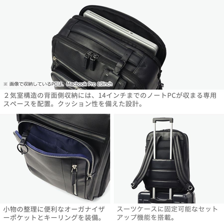 カジュアルな雰囲気もありながらビジネス仕様に欠かせないオーガナイザー機能を多数搭載した『ZEST2』シリーズのリミテッド企画。こちらは、本革ならではの上質感と高い機能性を兼ね備えたビジネスリュックです。14インチPC対応の専用スリーブを備えた2気室構造で、書類やデバイスをスマートに整理できます。18L容量ながらすっきりとした印象で、通勤から出張まで幅広く活躍。キャリーオン対応で移動も快適な、大人のための一品です。