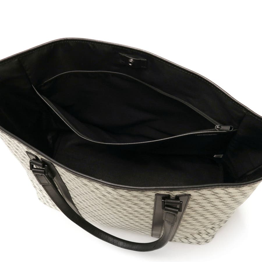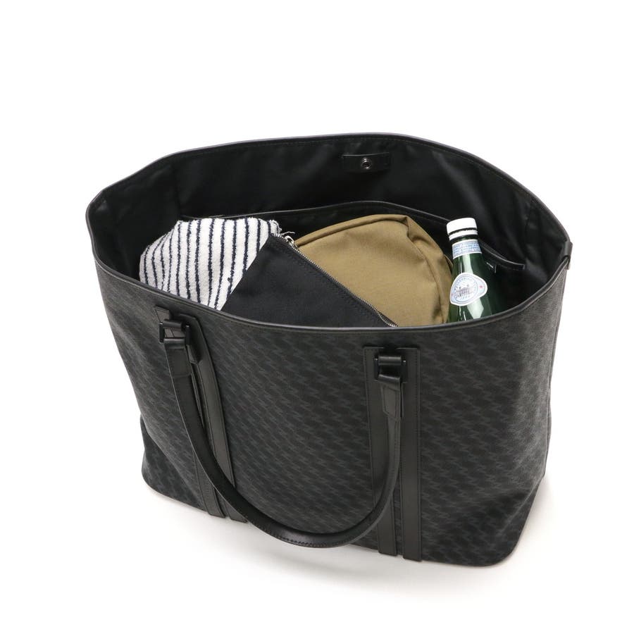 ゴルフ場の平均的なロッカーサイズぎりぎりまで横幅を取った大容量トートバッグ。開閉部はスナップボタンで大きく開き、シューズケースやラウンド用ポーチなど、大きい荷物もざっくりとたっぷり収納できます。本体生地には国産の高級PVCを使用し、牛革とのコンビによって上質感・高級感あるデザインに。 基布(綾織りコットン)にベースカラーPVC、プリント、クリアPVCを乗せ、エンボス加工を施すことでデザインと耐久性を両立しています。